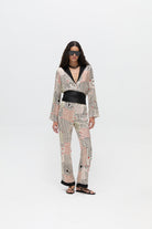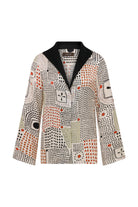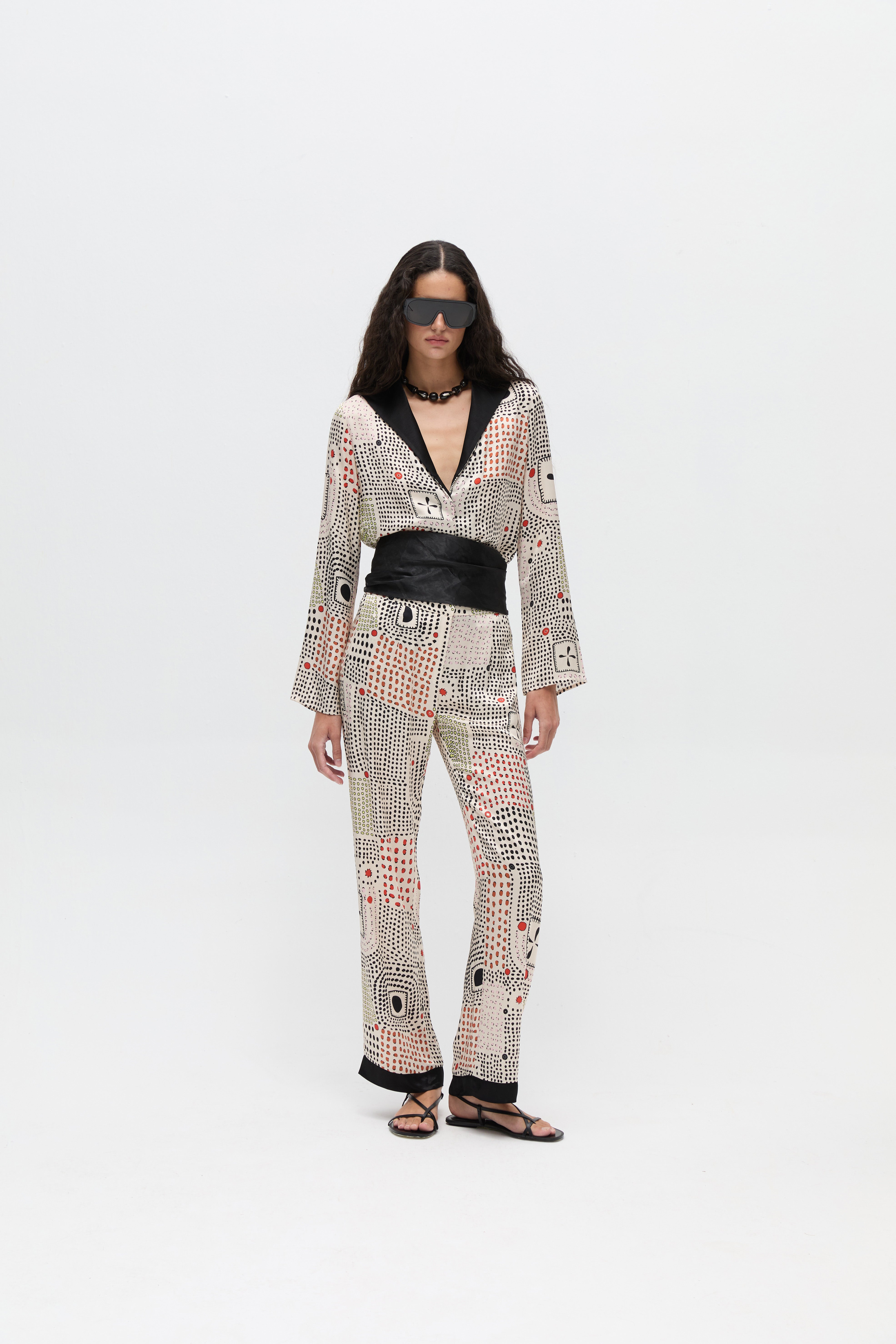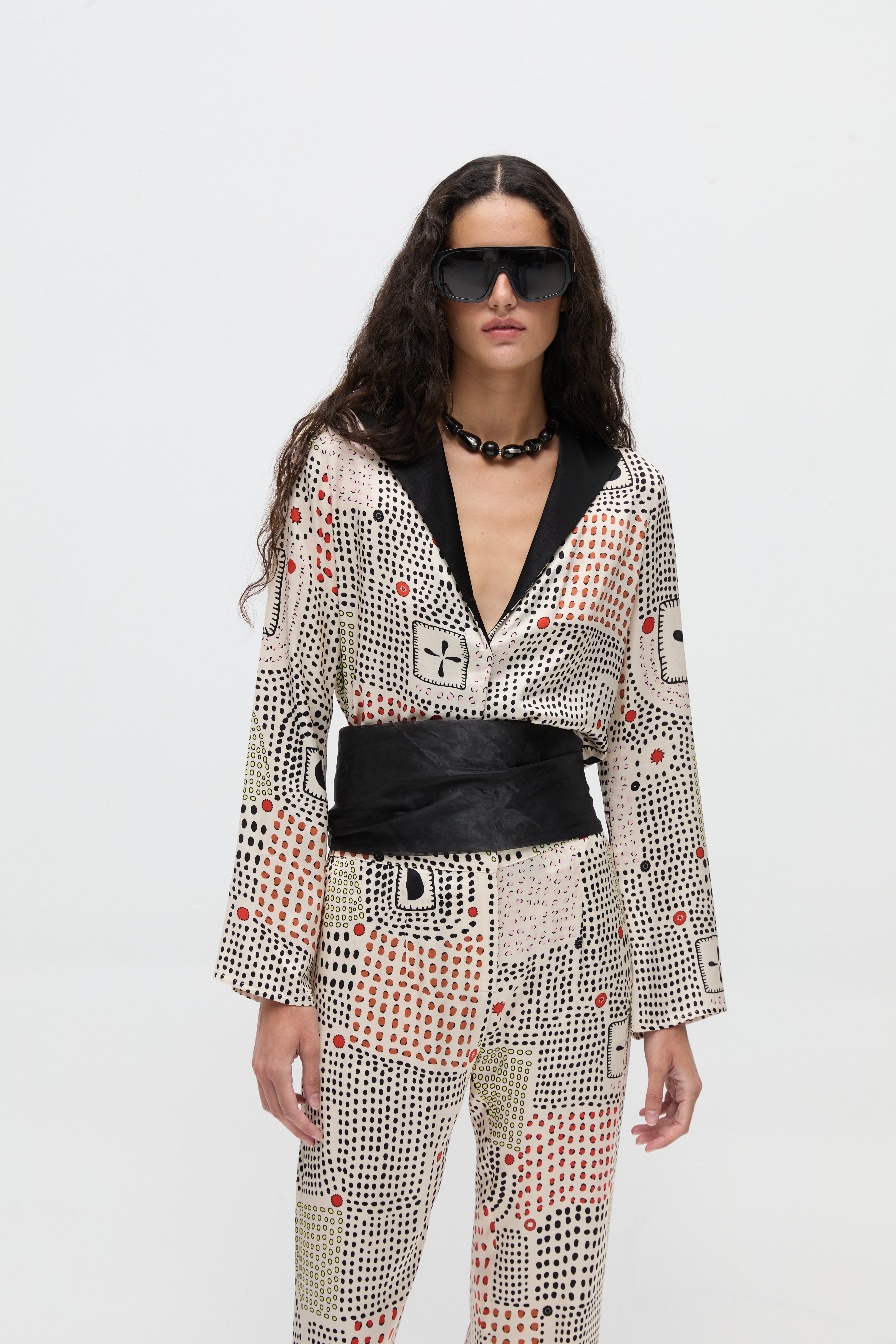 Pippa Üst, saten yüzeyli viskon kumaştan, canlı geometrik desenle tasarlanmıştır. Rahat kesimi vücuda dökümlü bir şekilde oturarak akıcı bir siluet oluşturur. Uzun kolları ve açık yakası, rahat bir görünümü zarif bir duruşla dengeler. Hem gündelik hem de daha özenli kombinlerde kullanılabilecek çok yönlü bir parçadır.