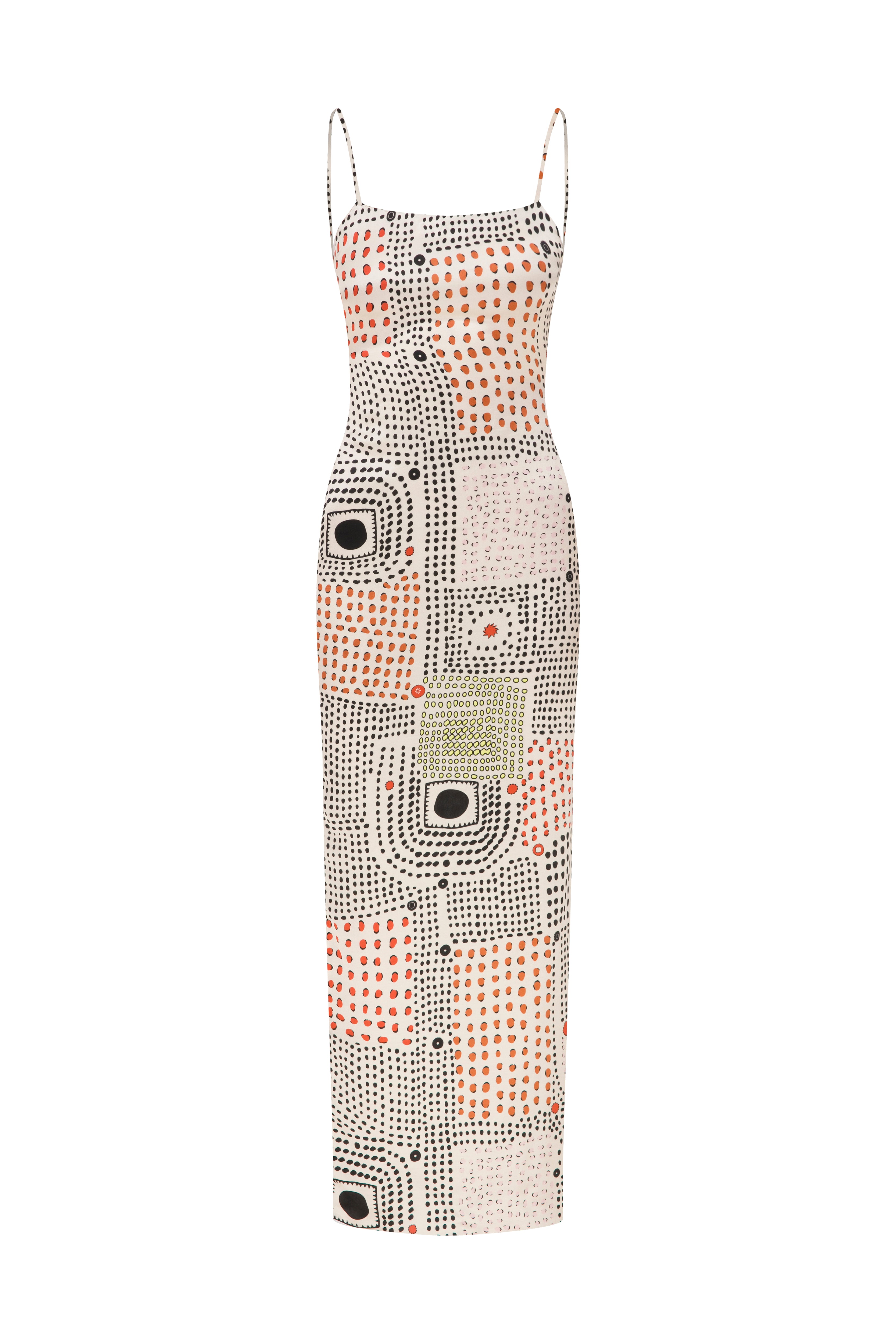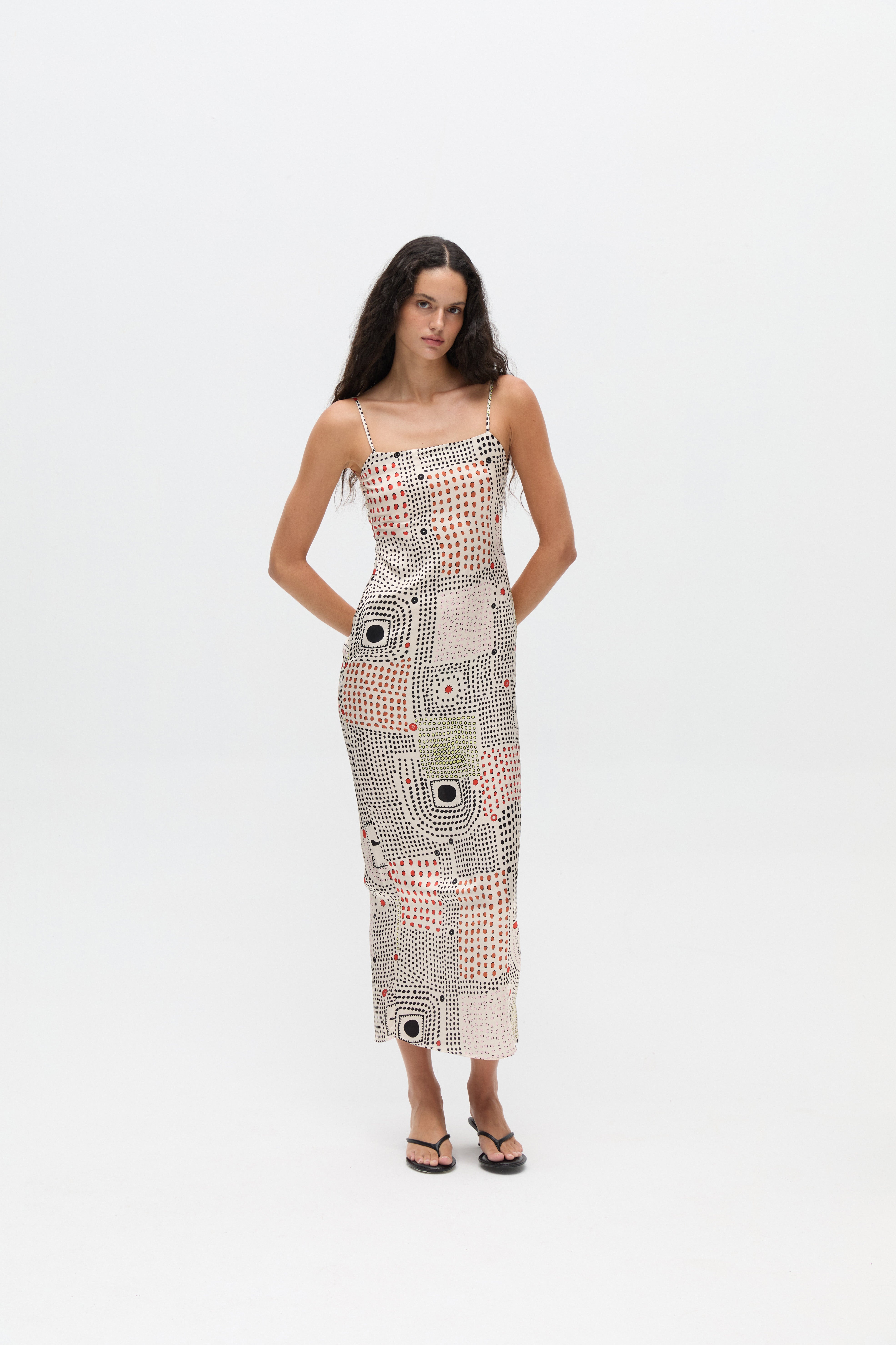 Pippa Midi Elbise, saten yüzeyli viskon kumaştan, özgün desenli bir modeldir. İnce askıları, düz kesimi ve sırtındaki bağ detayıyla feminen bir görünüm sunar. Temiz hatları ve dengeli formu sayesinde sade ama şık bir siluet oluşturur.