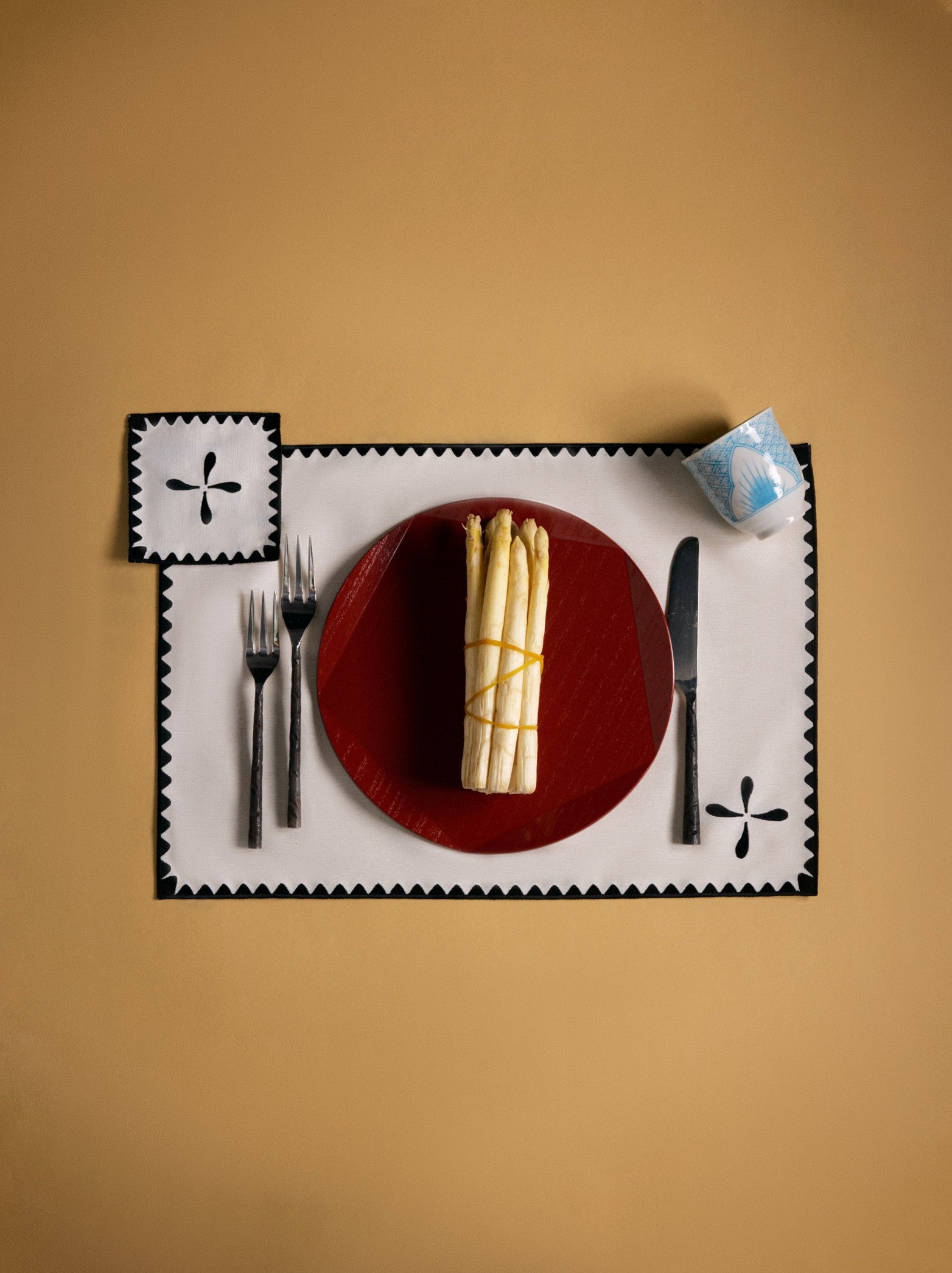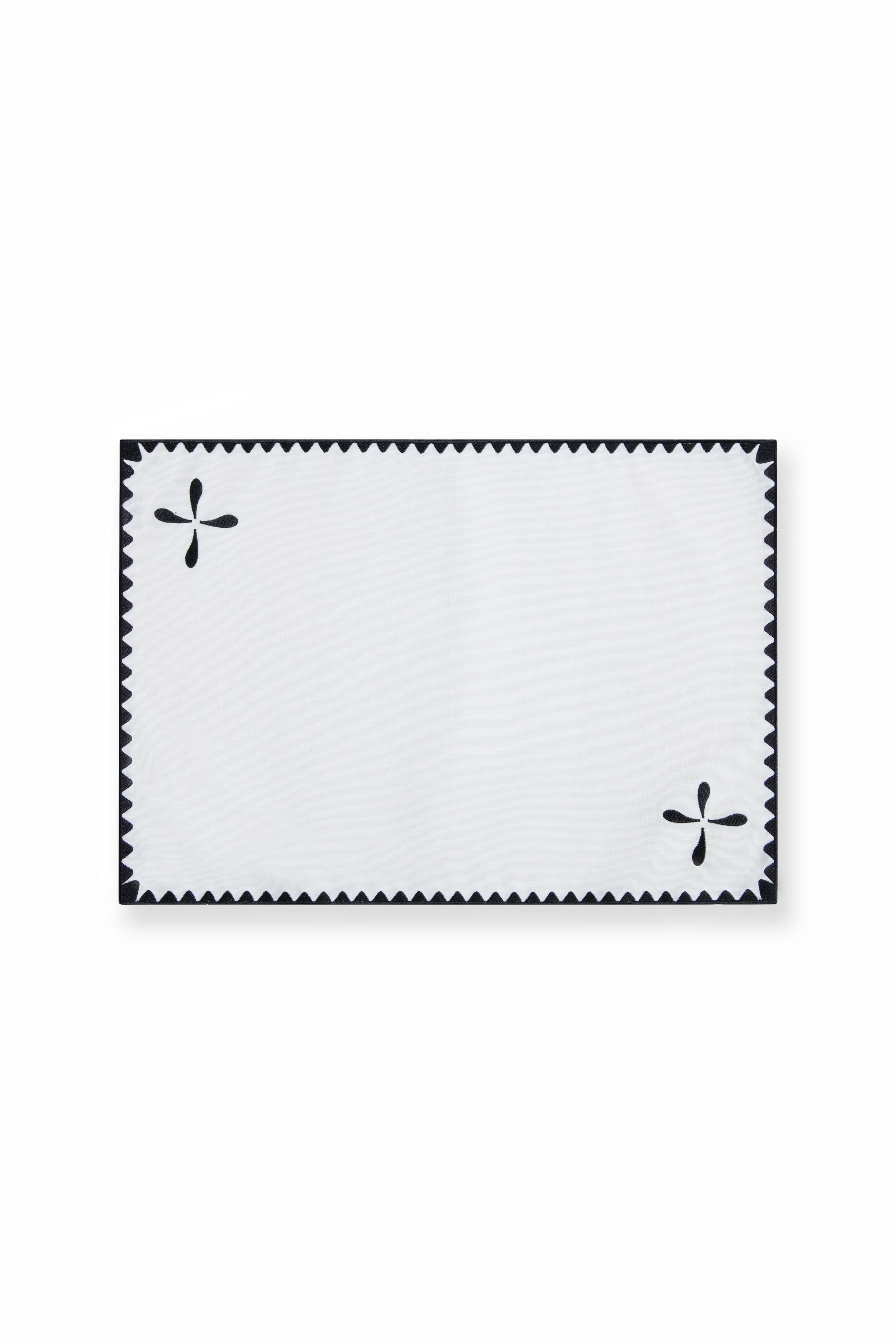 Sora Amerikan Servis, klasik dikdörtgen formu cesur nakış detayları ve kontrast kenar çerçevesiyle yeniden yorumlar. Siyah-beyaz renk paleti ve net çizgileriyle sofistike bir arka plan oluşturarak sofradaki düzenin zarafetle öne çıkmasını sağlar.