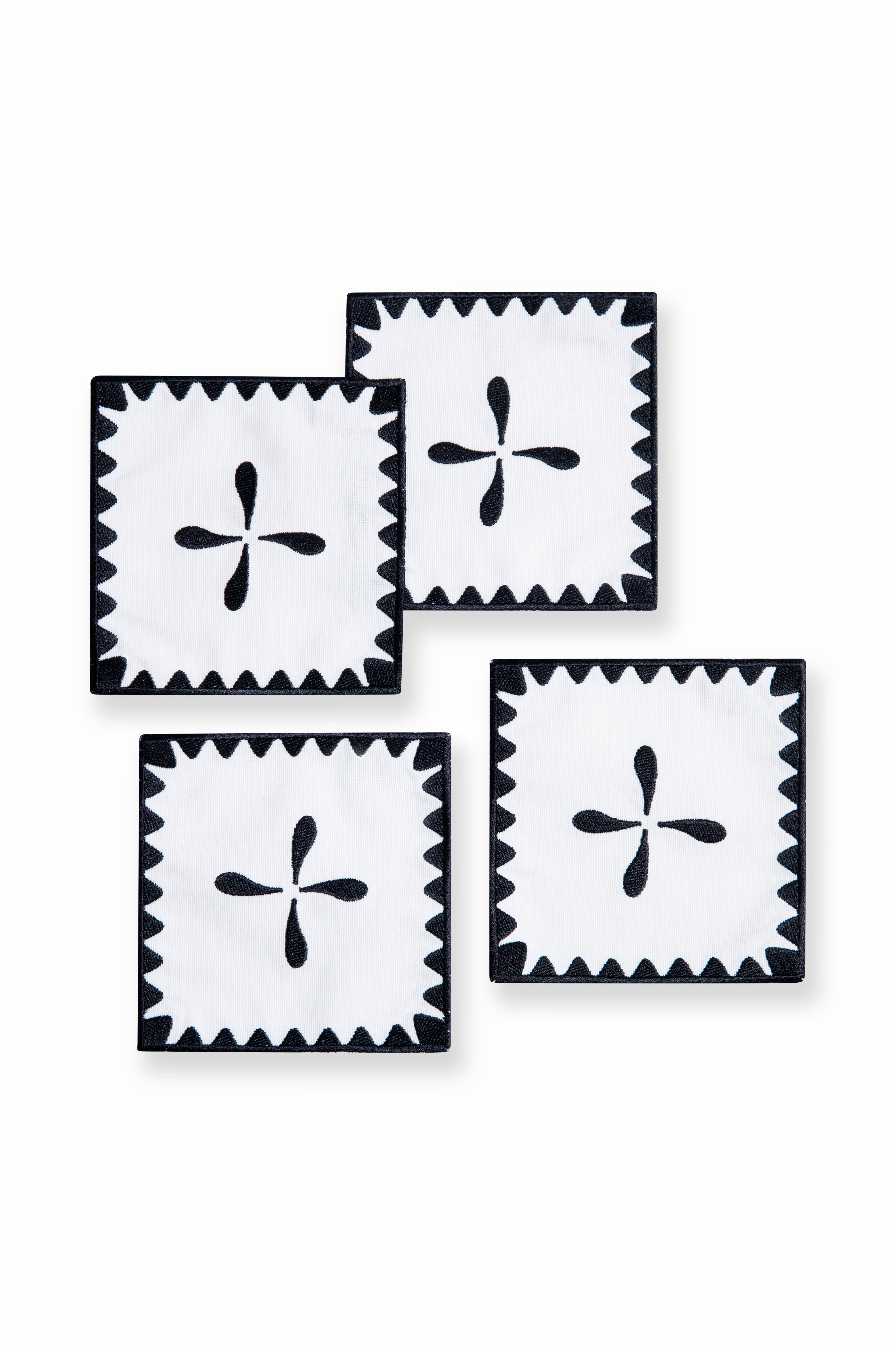 Sora Bardak Altlığı Seti, cesur kare formu, siyah işlemeli yonca desenleri ve keskin kenar detaylarıyla dikkat çeker. Net çizgileriyle masaya güçlü bir görsel denge kazandırır; günlük sofraları daha düzenli ve karakterli bir hale getirir. Dört adet altlıktan oluşan bu set, hem işlevsel hem de estetik bir tamamlayıcıdır.