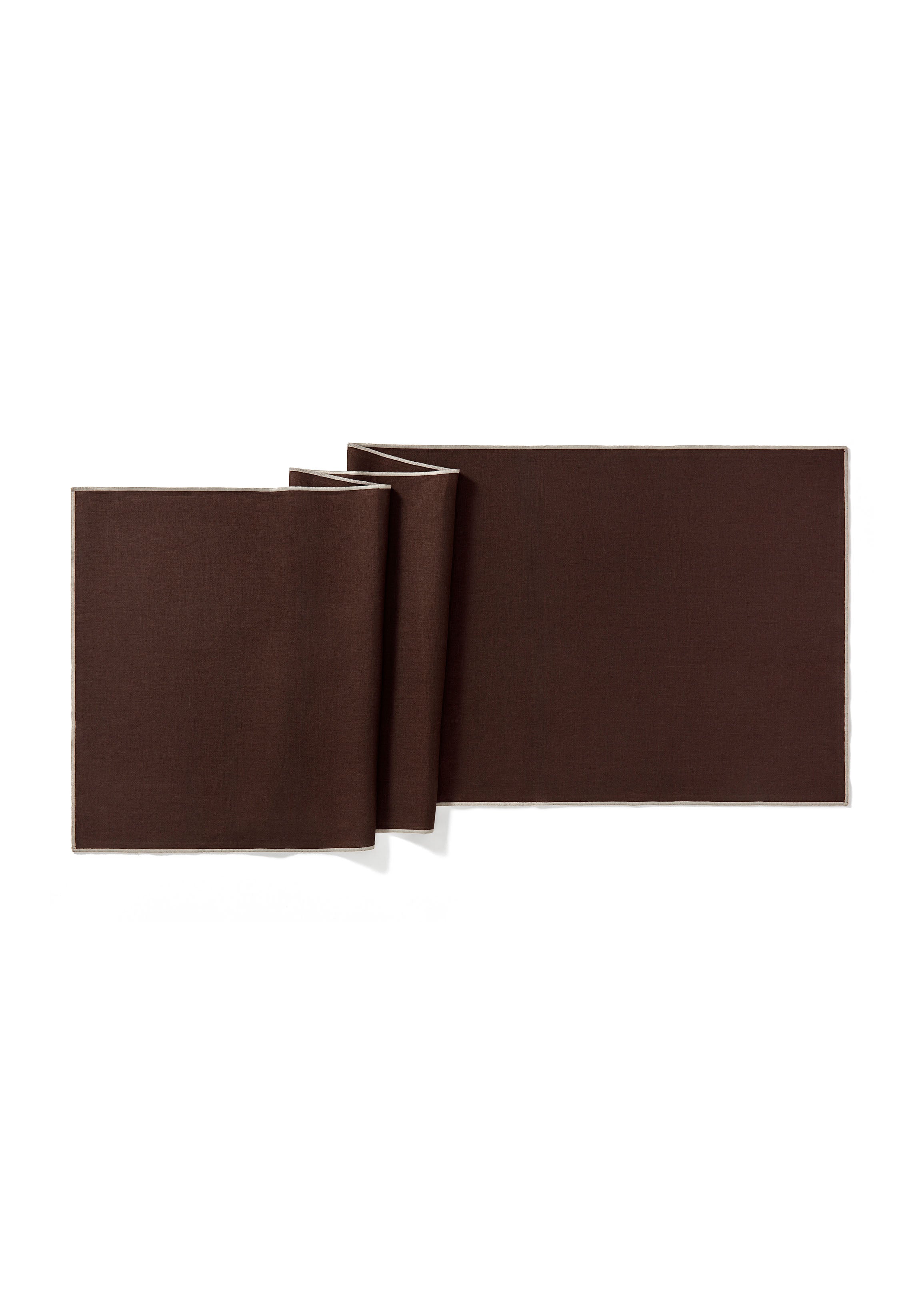 Margot Runner, kahverengi keten kumaş üzerine bej biye detayıyla tasarlanmıştır. Klasik ve modern çizgileri bir araya getirerek sofralarınıza derinlik ve yumuşaklık katar. Diğer doğal tonlarla katmanlanmak için idealdir. Tekli olarak satılır.