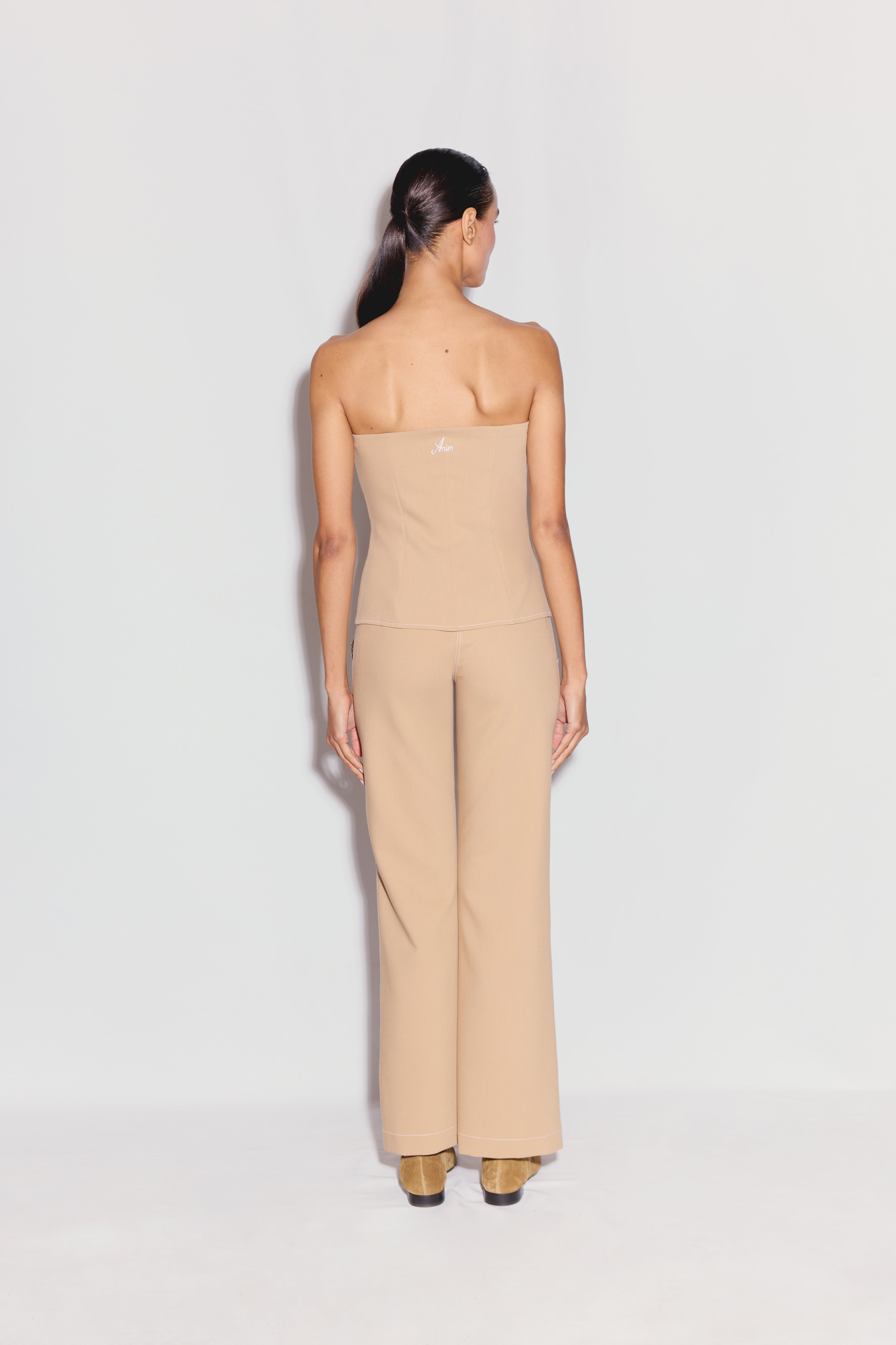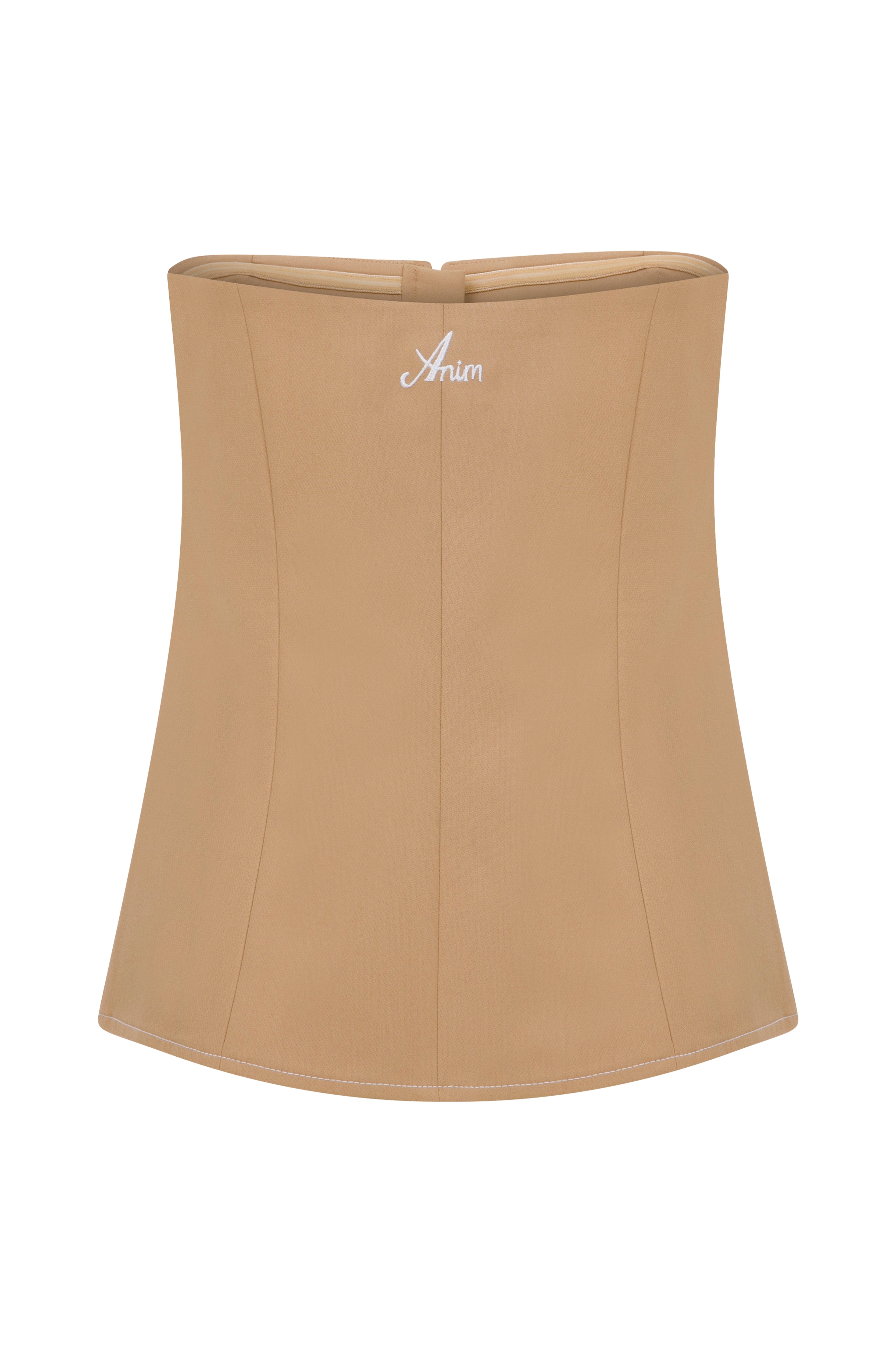 • Dua Top sıcak bej tonunda, elastan dokunuşlu polyester–viskon karışımından üretilmiş straplez bir tasarıma sahiptir.