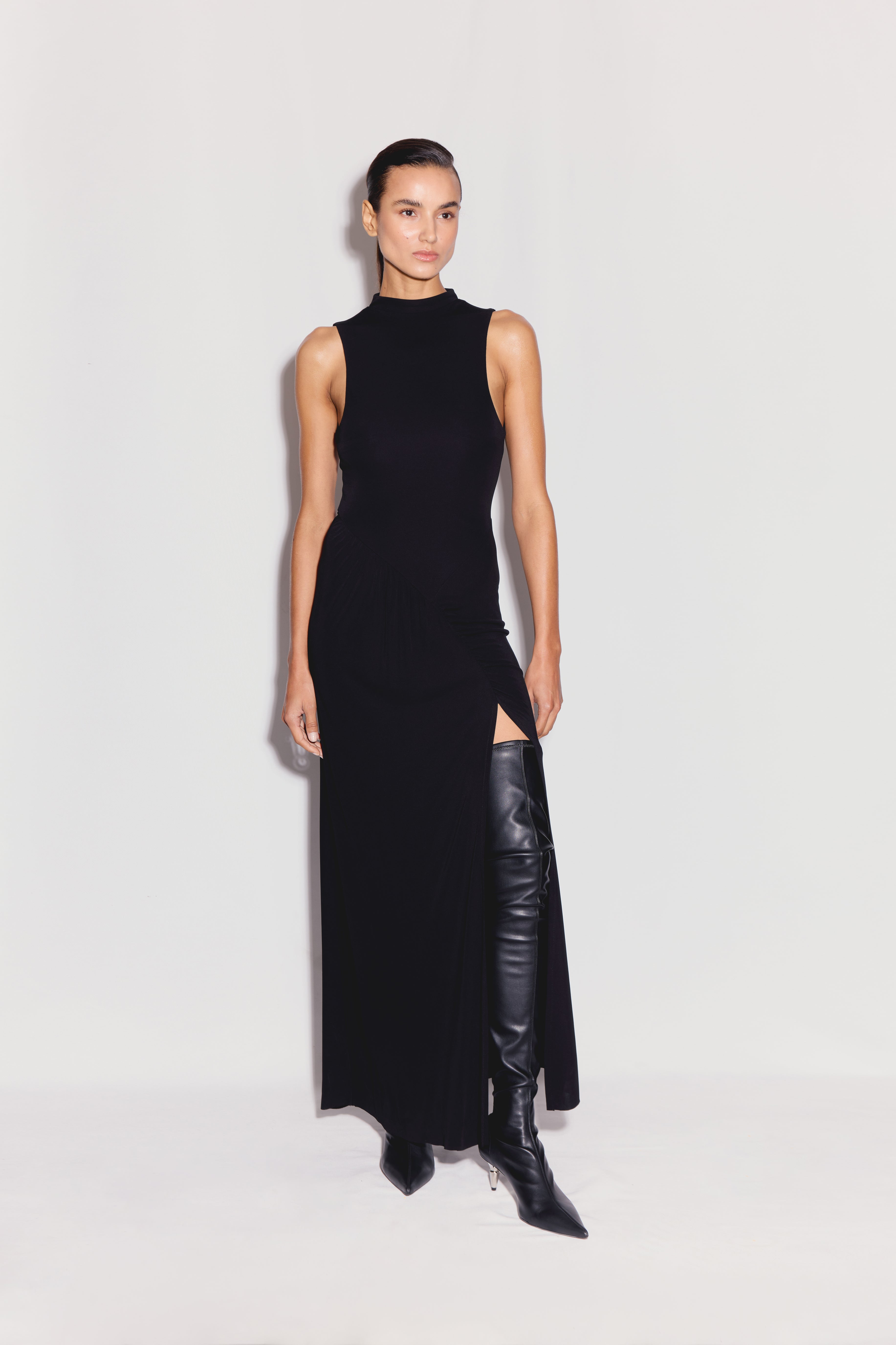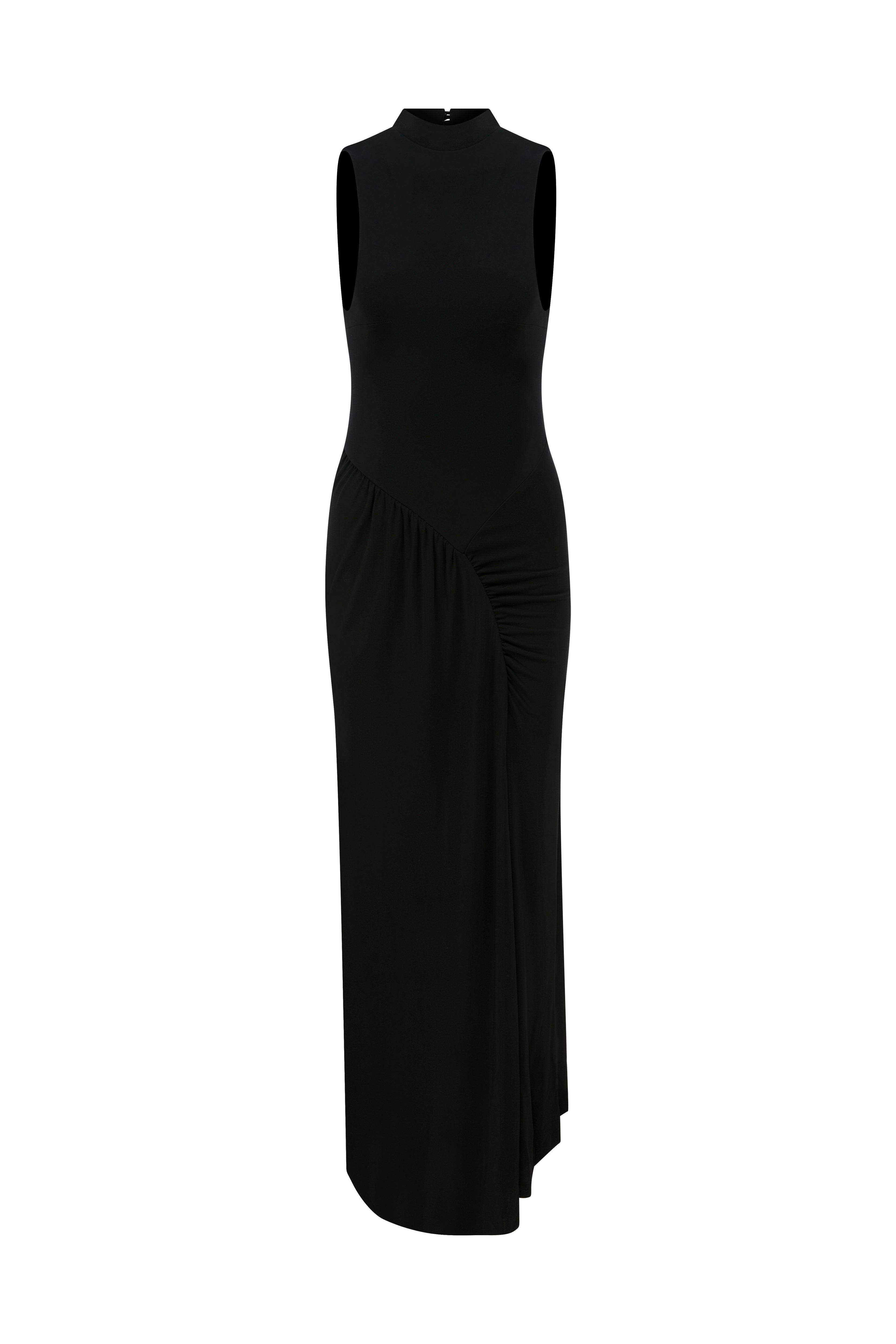 Yüksek Yakalı Kolsuz Asimetrik Drape Detaylı Maxi Elbise