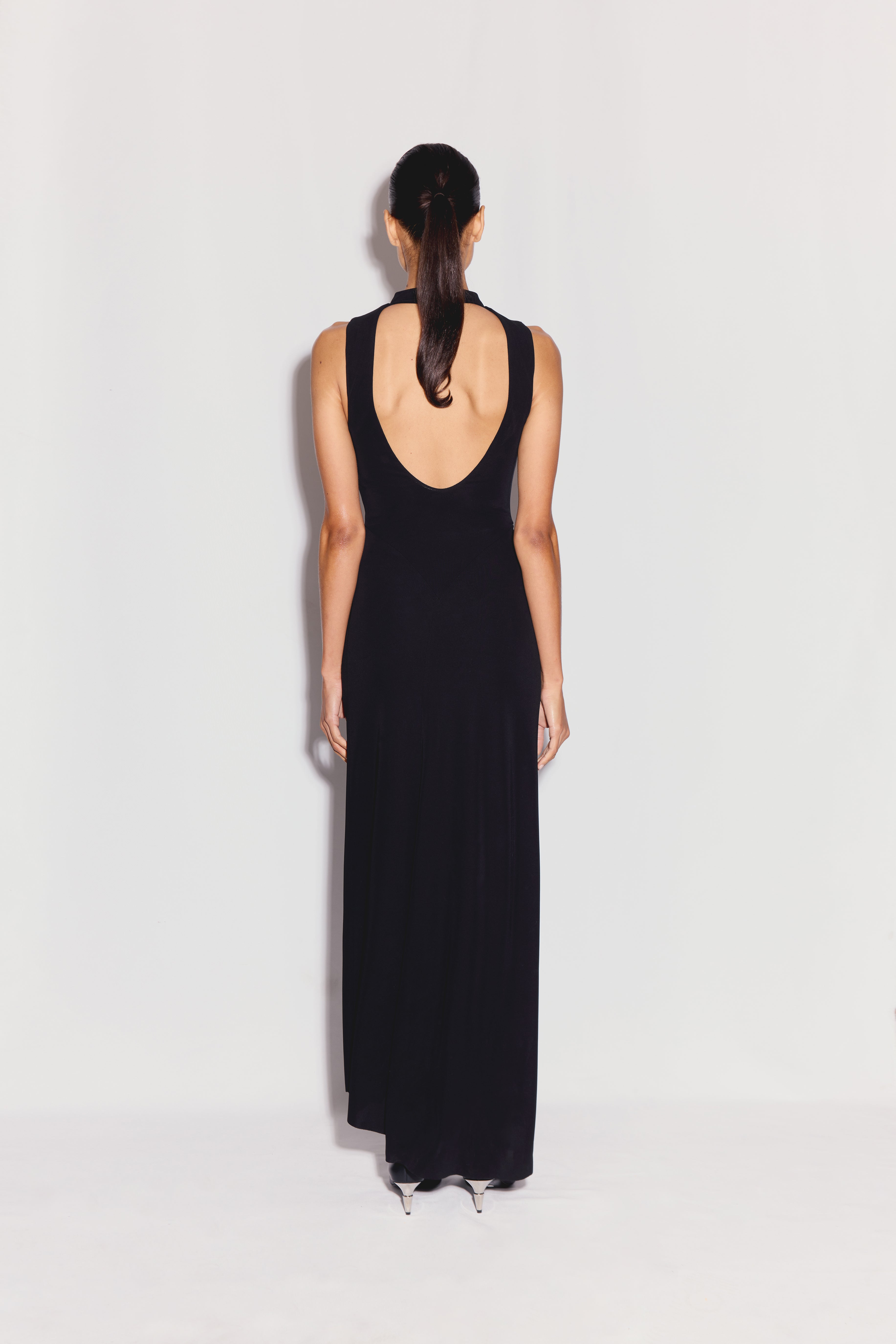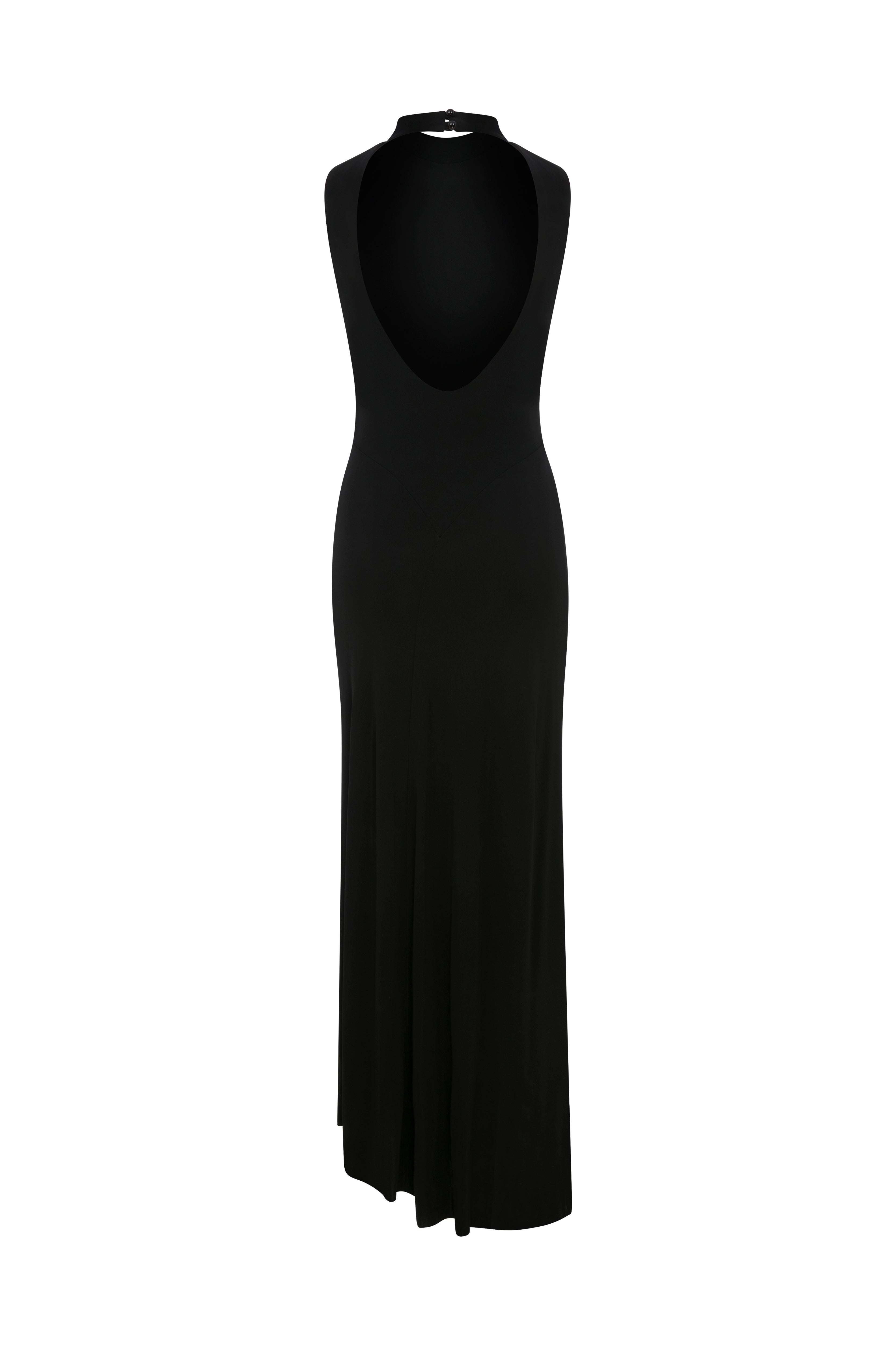 Mimi Elbise zamansız siyah renkte, dik yakalı ve kolsuz maxi bir tasarıma sahiptir.