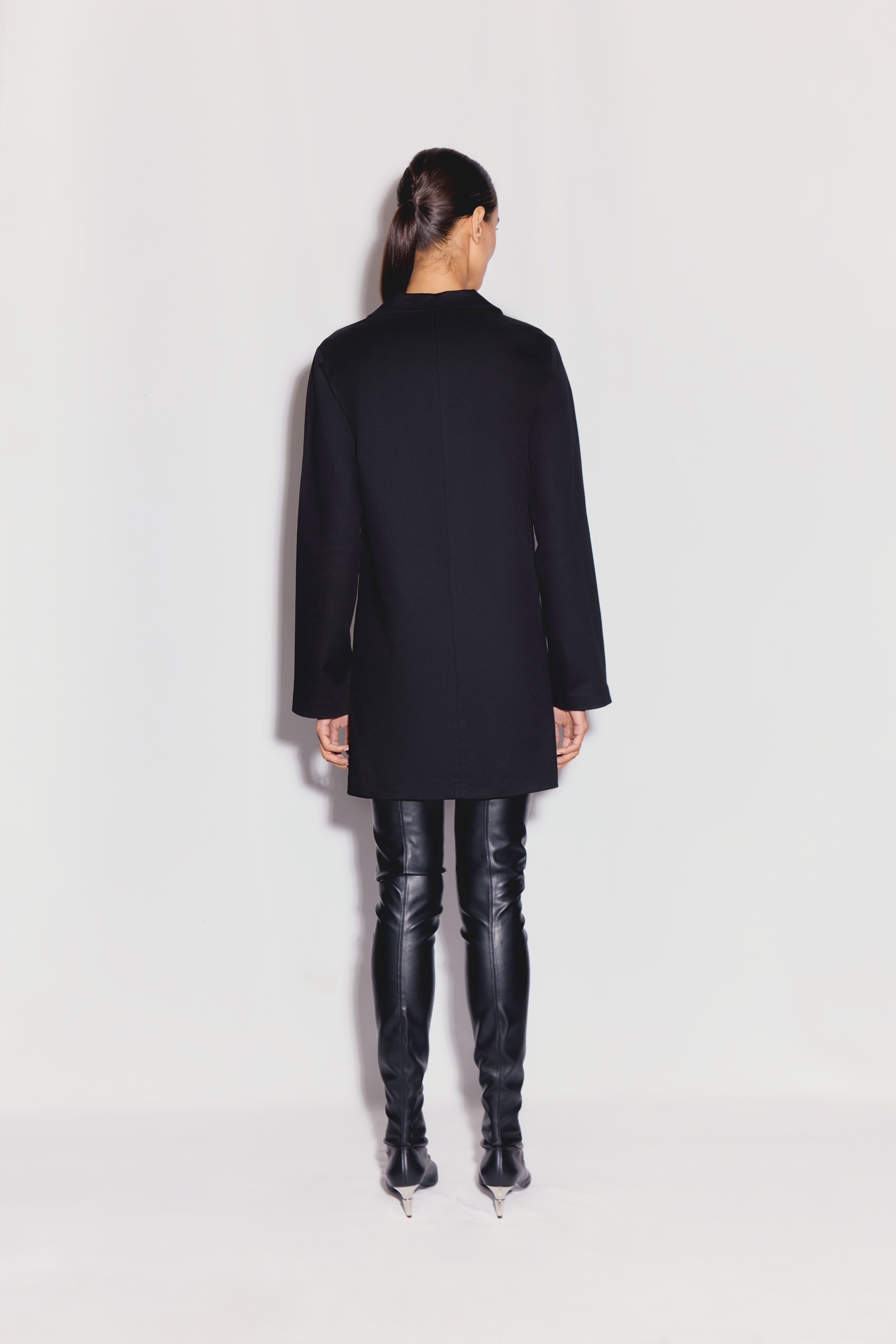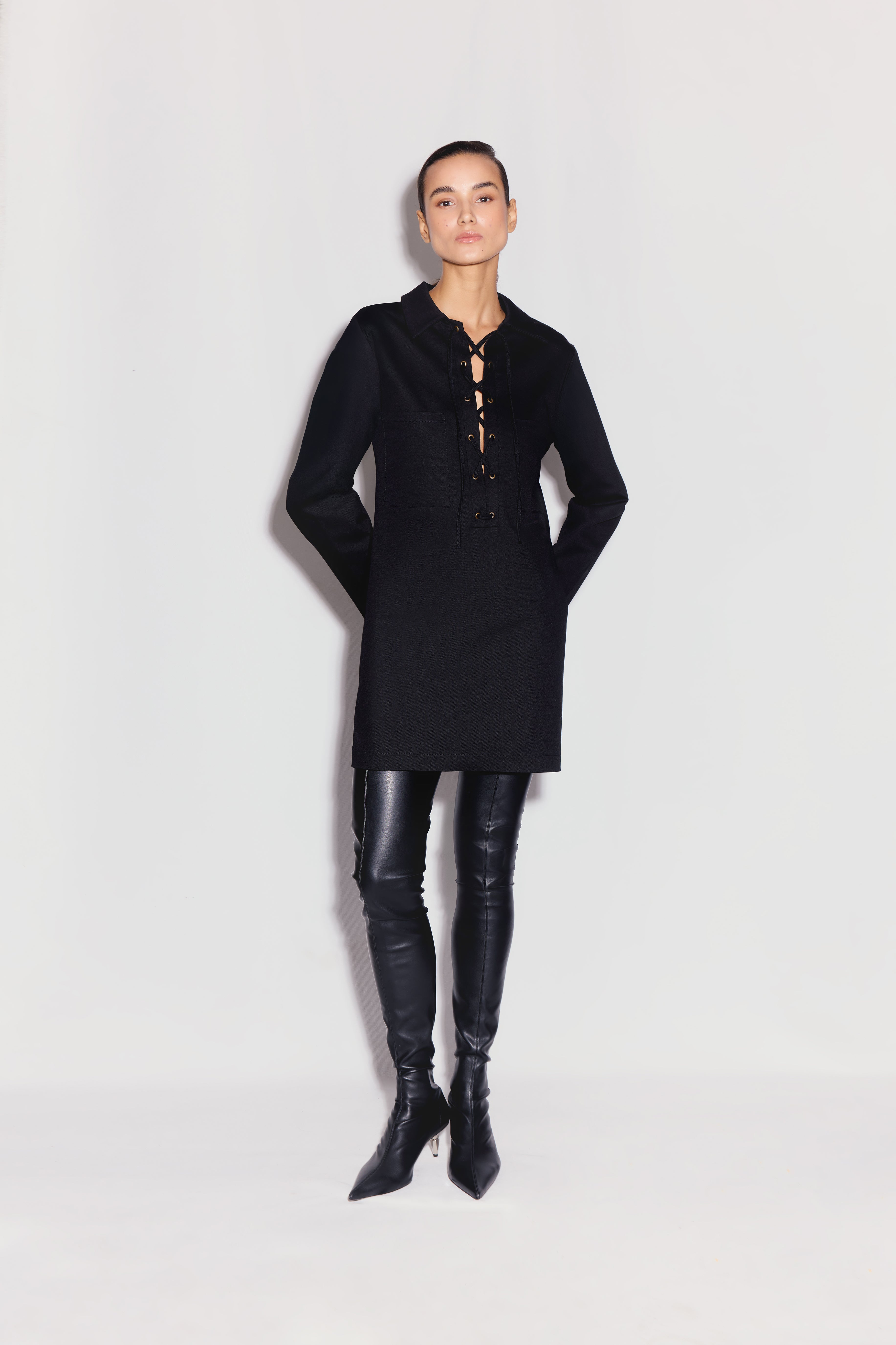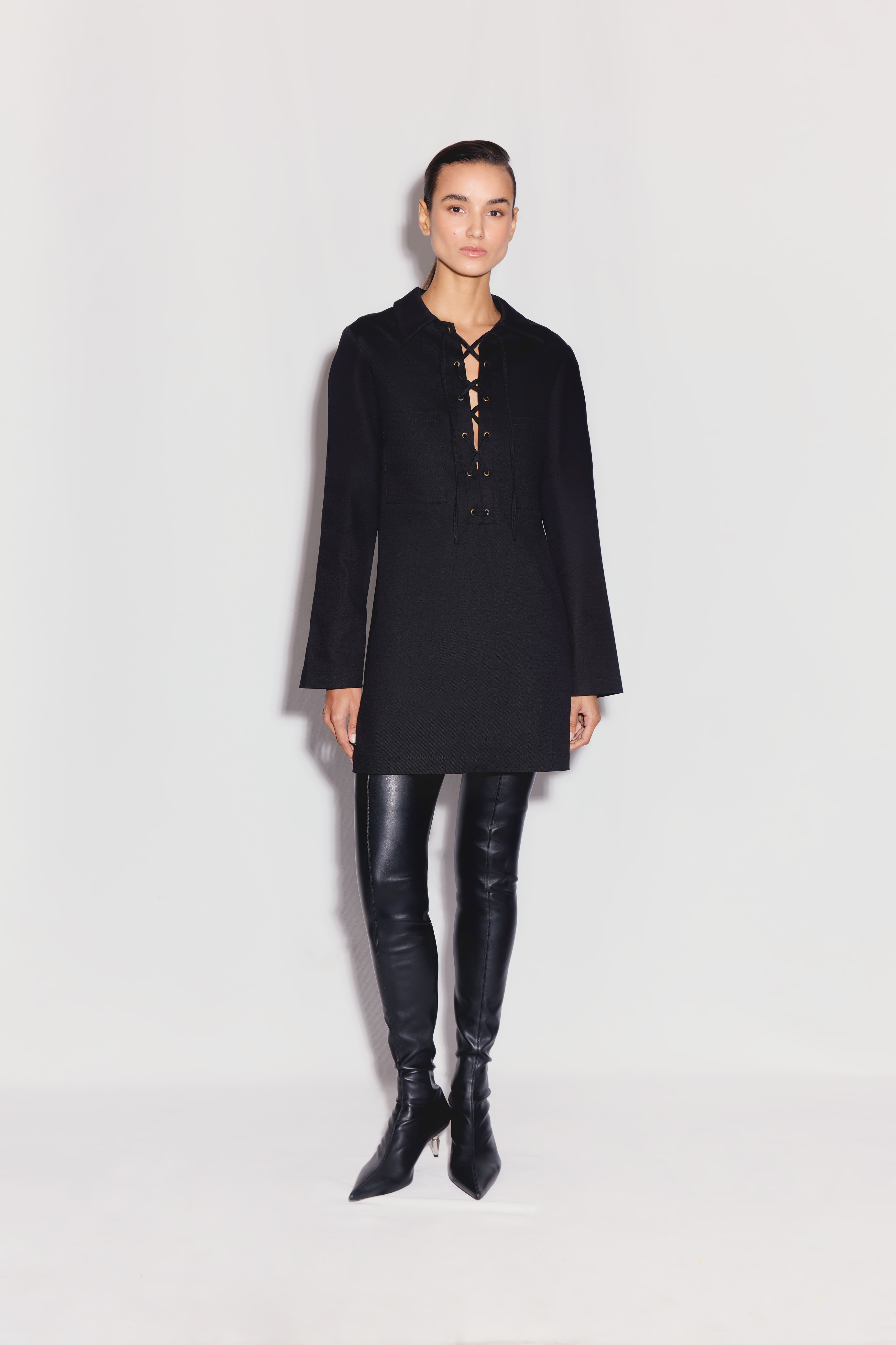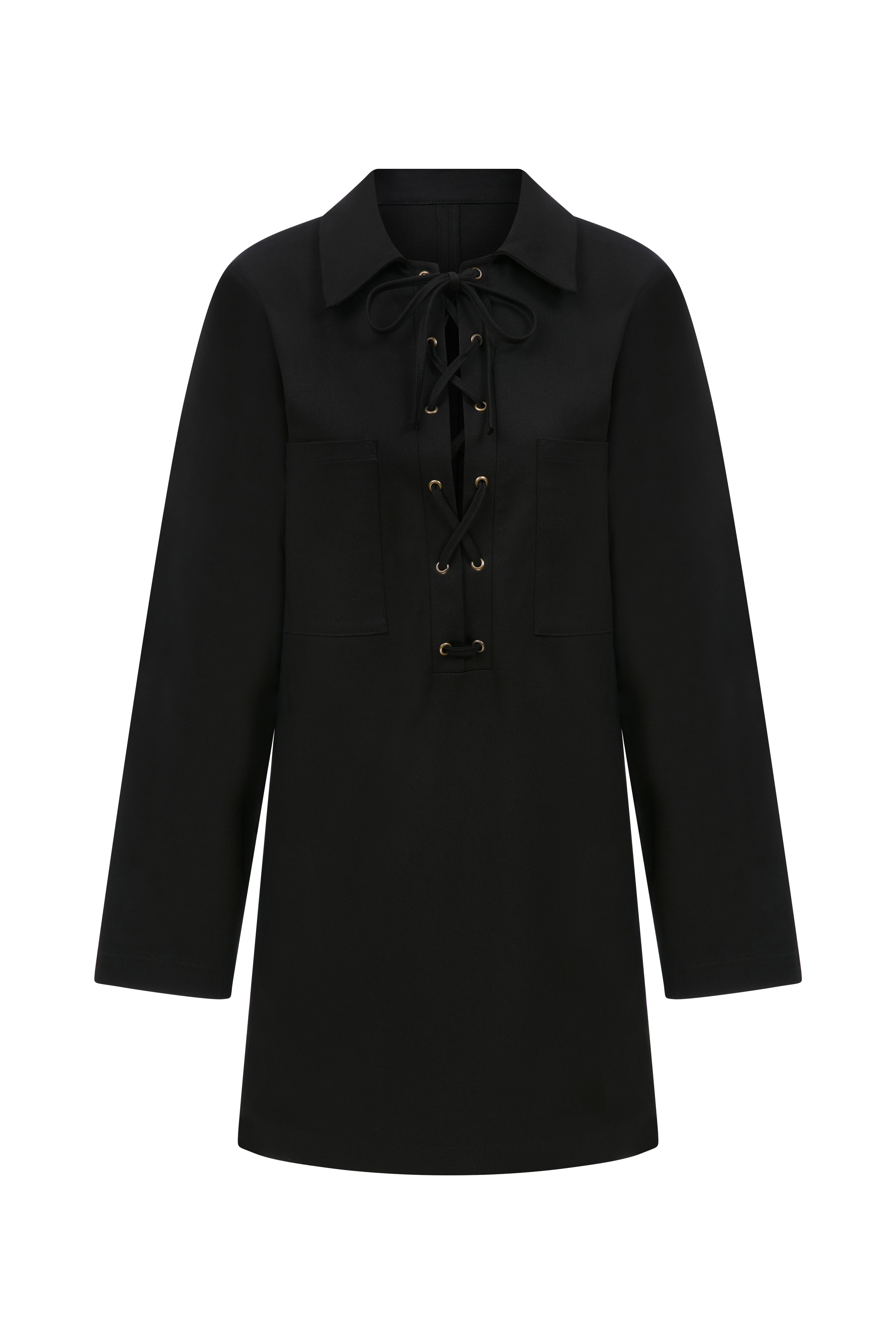 Xira Elbise siyah renkte, yapılandırılmış yakası ve önden bağcıklı detaylarıyla mini bir tasarıma sahiptir.