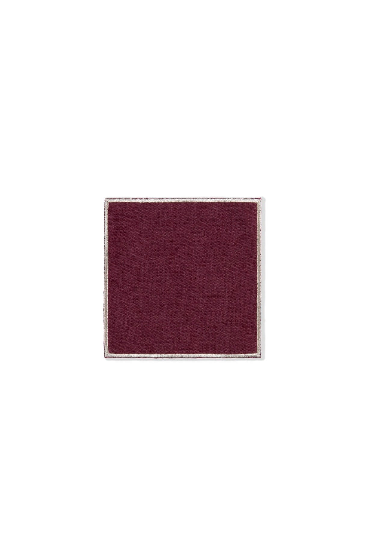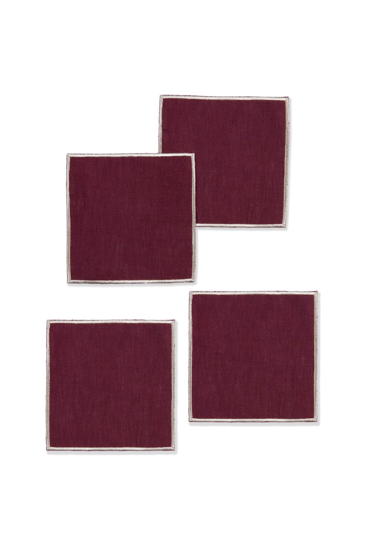 Margot Bardak Altlığı Seti, zengin bordo ketenden üretilmiş dört parçadan oluşur,  kontrast ekru biyesiyle zarif bir el işçiliği detayı taşır. Zamansız renk paletiyle her sofraya şık bir tamamlayıcıdır.