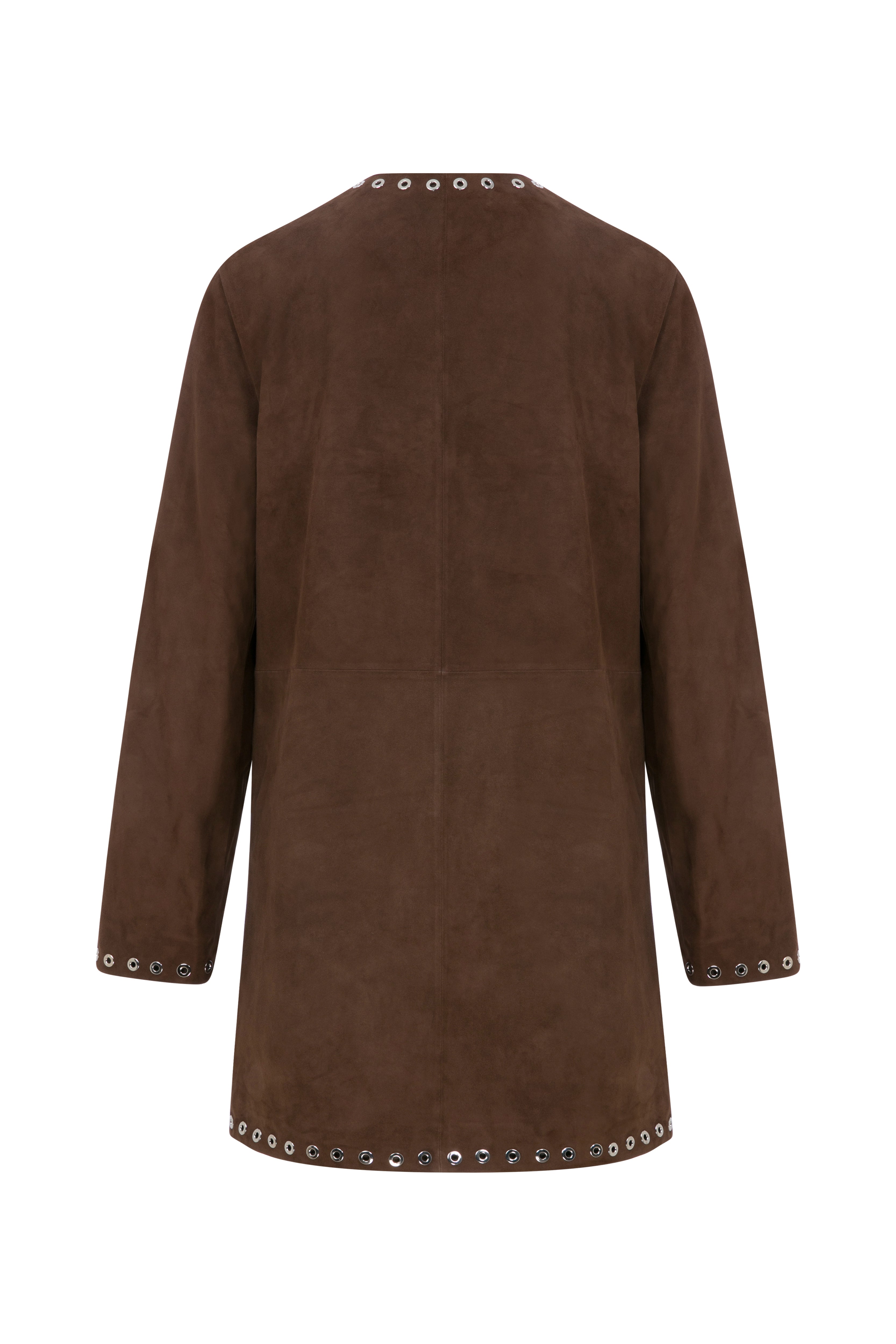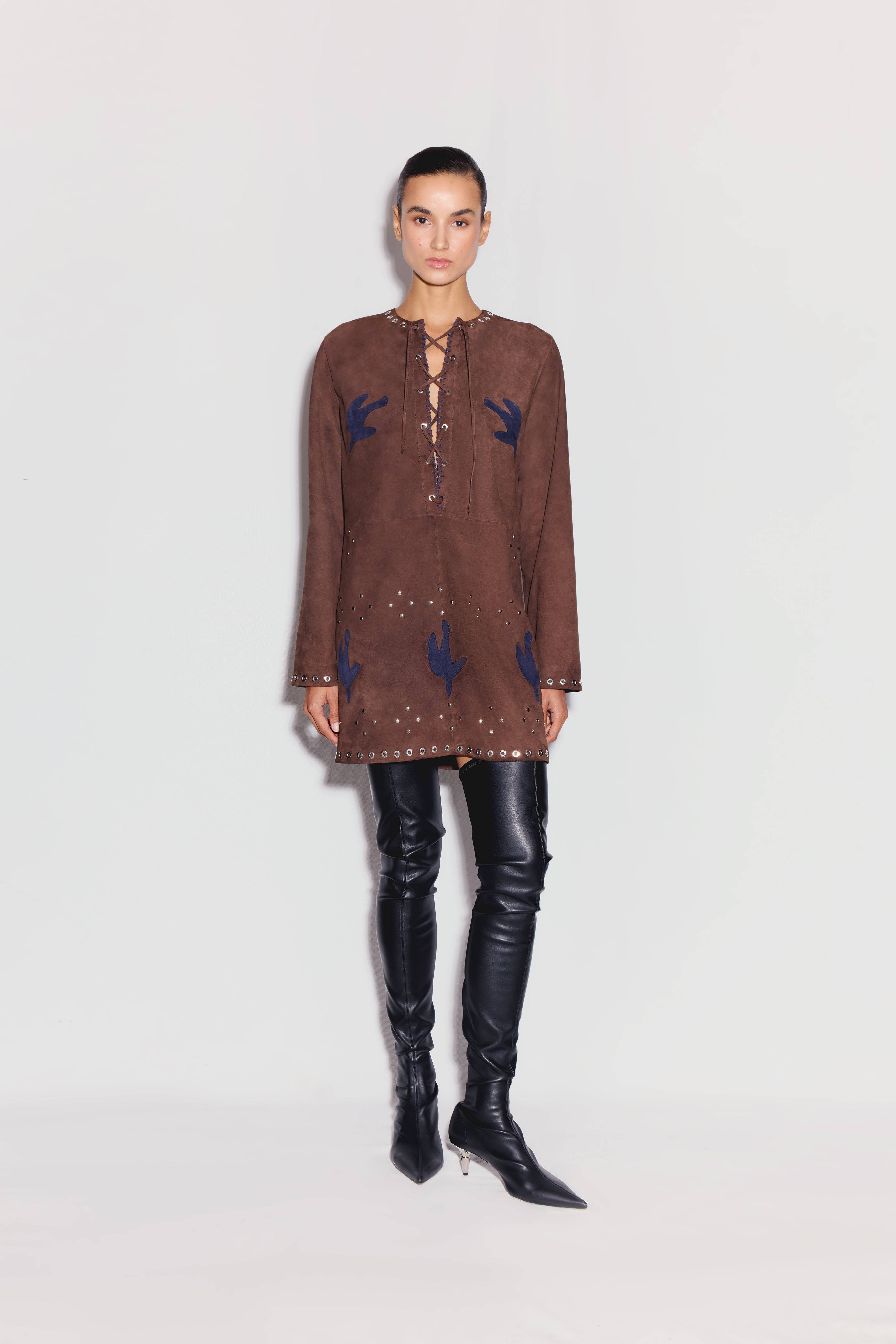 The Hudson Dress is a brown suede dress detailed with tonal embroidery and lace-up tie accents at the neckline. Designed in a straight, relaxed silhouette, it offers a comfortable fit while maintaining a polished, statement look. Grommet embellishments along the cuffs and hemline add subtle edge, making it a versatile choice for both day and evening wear.