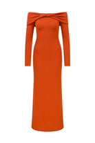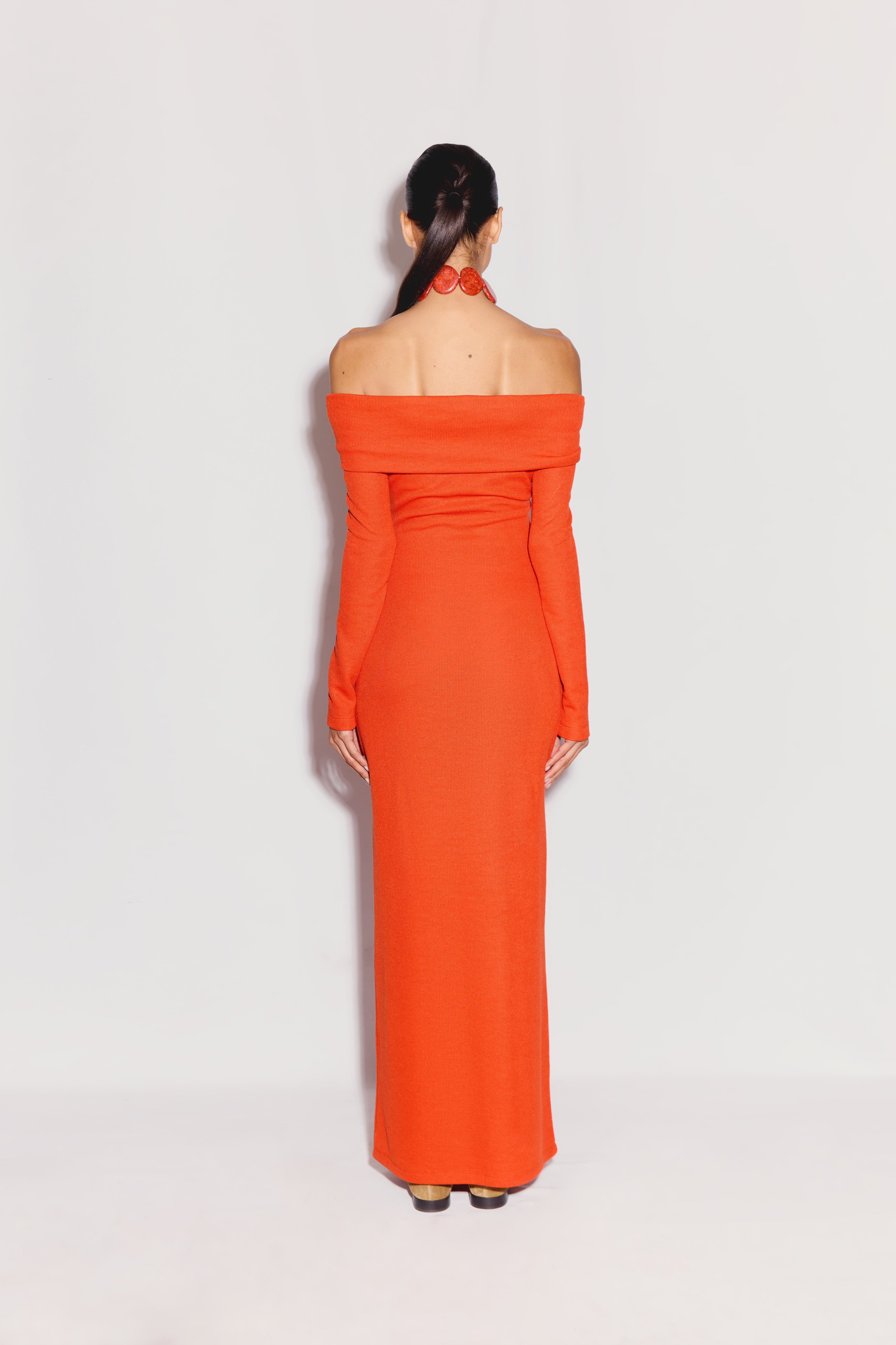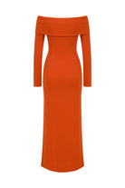 Irene Elbise, sezonun enerjisini yansıtan parlak turuncu tonuyla dikkat çeker. Omuzları açık ve uzun kollu tasarlanmıştır, yumuşak ama destekleyici pamuk karışımı kumaştan üretilmiş olup vücuda pürüzsüzce oturur. Burgu detaylı yakası tasarıma dramatik bir hava katarken, düz ve yere kadar uzanan silüeti, onu akşam davetleri için ideal ve şık bir parça yapar.