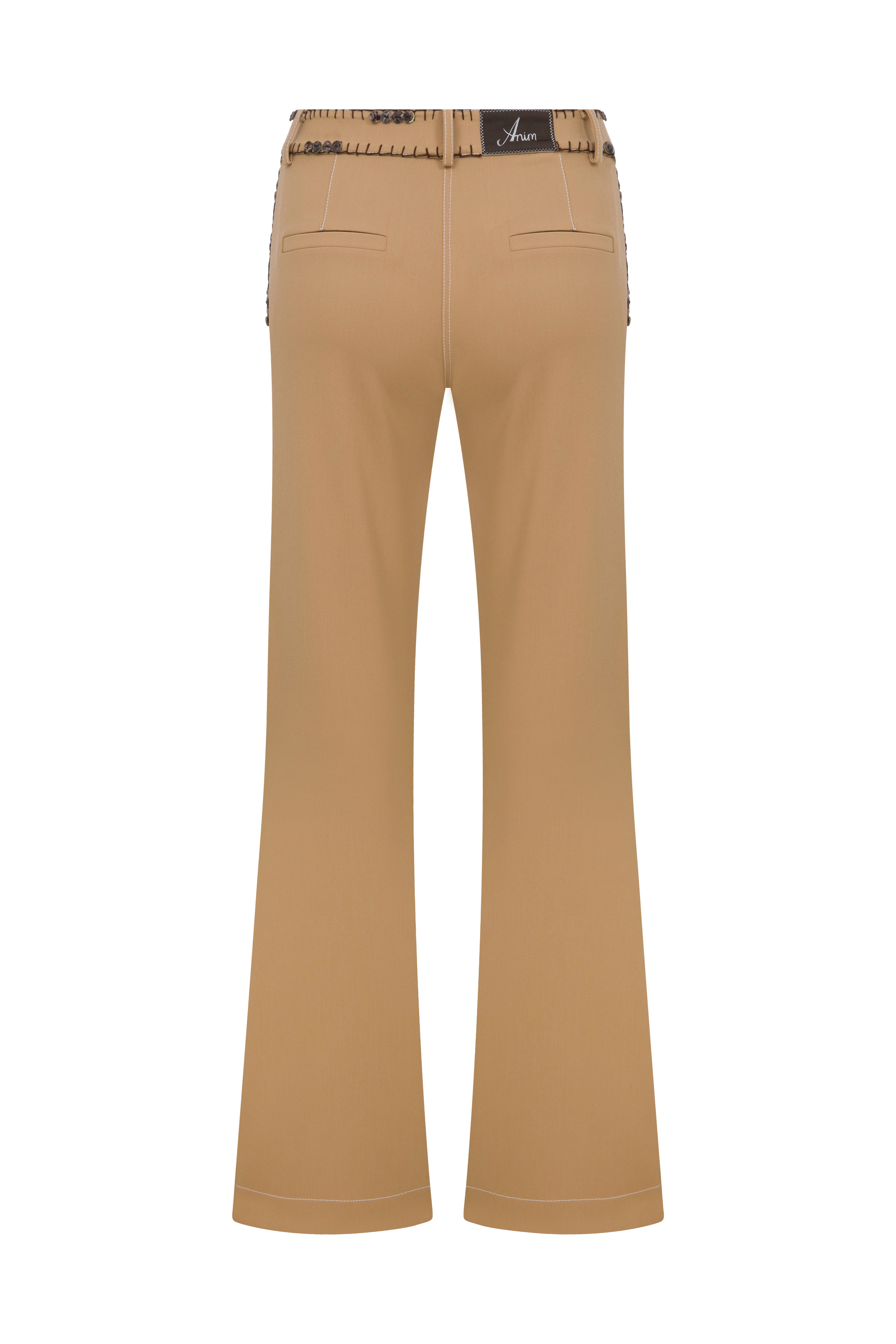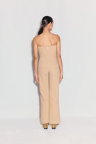 The Dua Pants are straight leg tailored pants in beige, finished with shell button details at the waistband. Cut from a smooth polyester-viscose blend, they sit mid-to-high on the waist and fall into a straight leg line that elongates the frame. The fit combines precise tailoring with all-day comfort, making them versatile for both coordinated looks and mix-and-match styling.