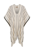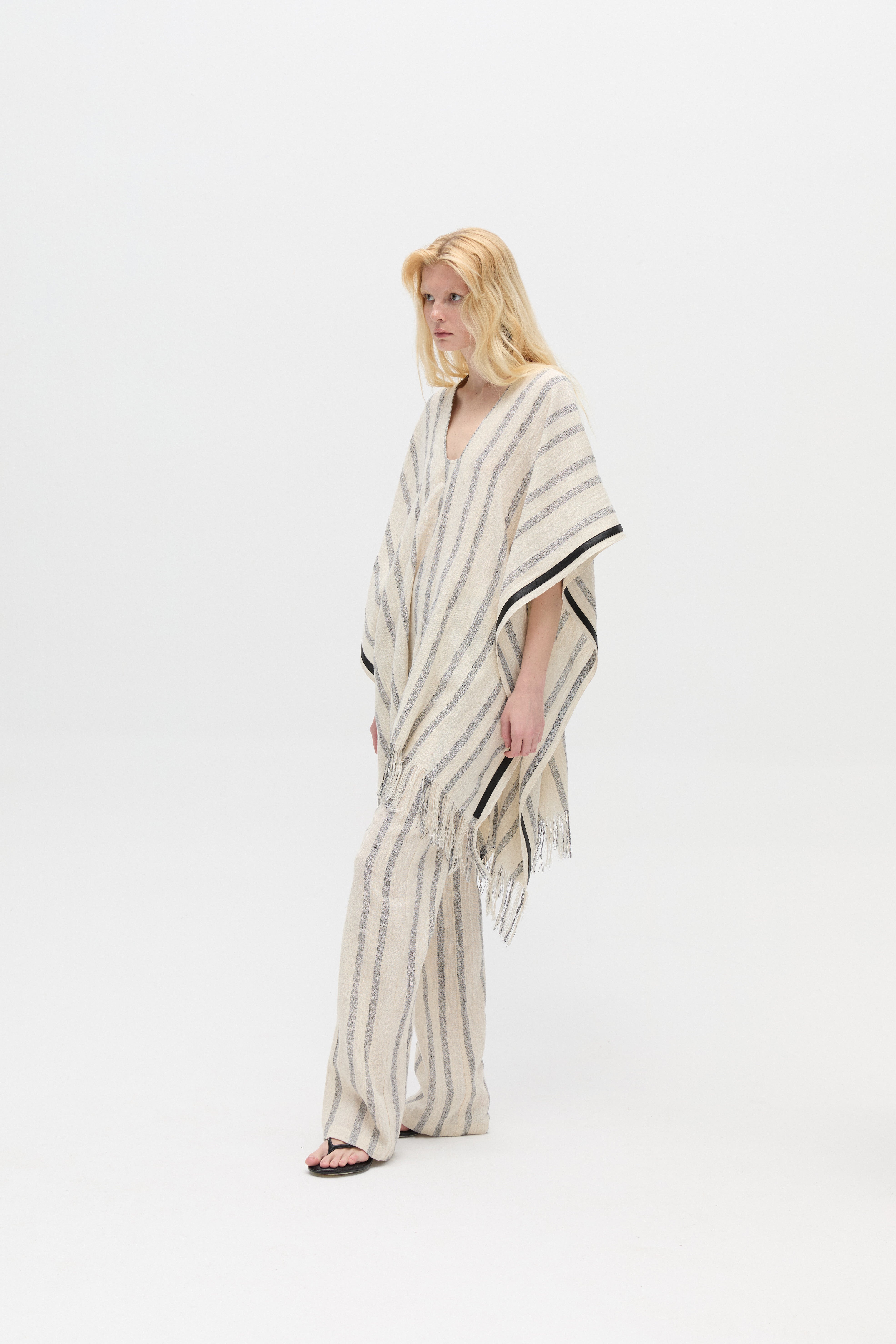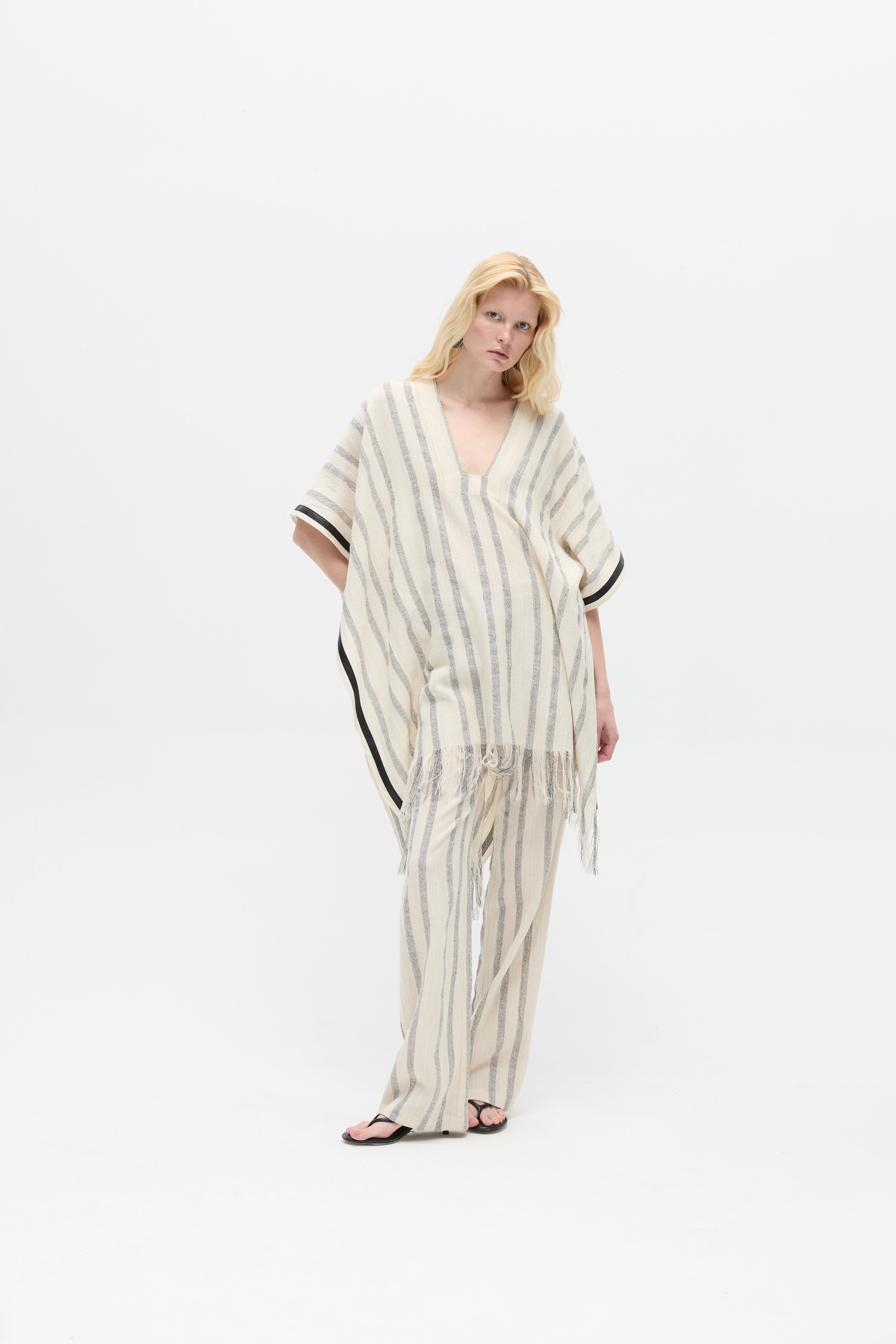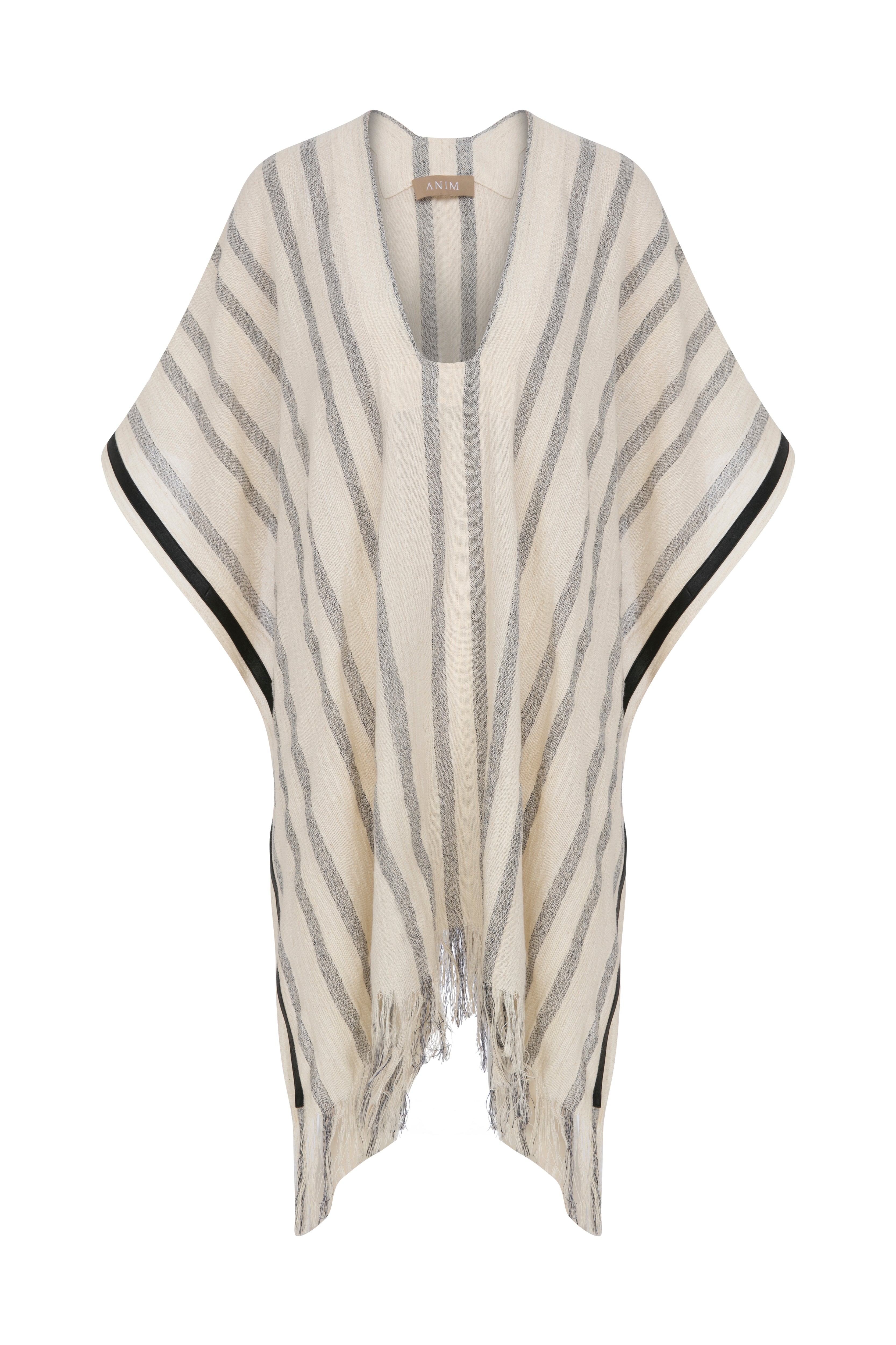 Kahi Panço, ekru zemin üzerine gri çizgili yumuşak pamuk kumaştan üretilmiş mini bir modeldir. Açık yan detayları ve ince püskül bitişleriyle dökümlü bir forma sahiptir. Geniş kesimi ve dikey çizgileriyle siluete uzunluk hissi kazandırır. Plajda, tatilde ya da şehirde farklı stillerle kullanılabilecek çok yönlü bir tamamlayıcı parçadır.