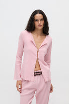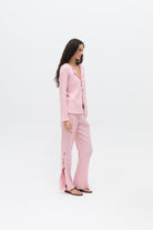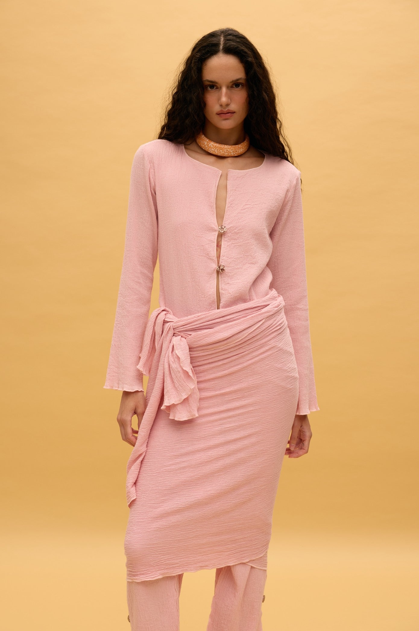 Malaika Üst, kırışık dokulu pembe pamuk kumaştan üretilmiş, bedene oturan formda, uzun kollu ve yuvarlak yakalı bir modeldir. Kenarlarını çevreleyen kontrast biye detayı tasarıma belirgin bir çerçeve kazandırırken, büyük ön düğmeler hem işlevsel hem de dikkat çekici bir unsur olarak öne çıkar. Kumaşın dokusu modele derinlik verir; rahat yapısı ise kolay giyilebilen, düzgün bir form sunar.