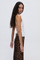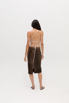 Nyra Midi Etek, dikkat çekici leopar deseniyle öne çıkan dana derisinden üretilmiştir. Belden oturan ve diz altına uzanan dar kesimiyle modern ve güçlü bir siluet sunar. Düz bel hattı ve arkadaki gizli kapama detayıyla sade bir bitişe sahiptir. Gündüz görünümlerine dinamizm, akşam stillerine ise zarif bir duruş kazandıran iddialı bir parçadır.