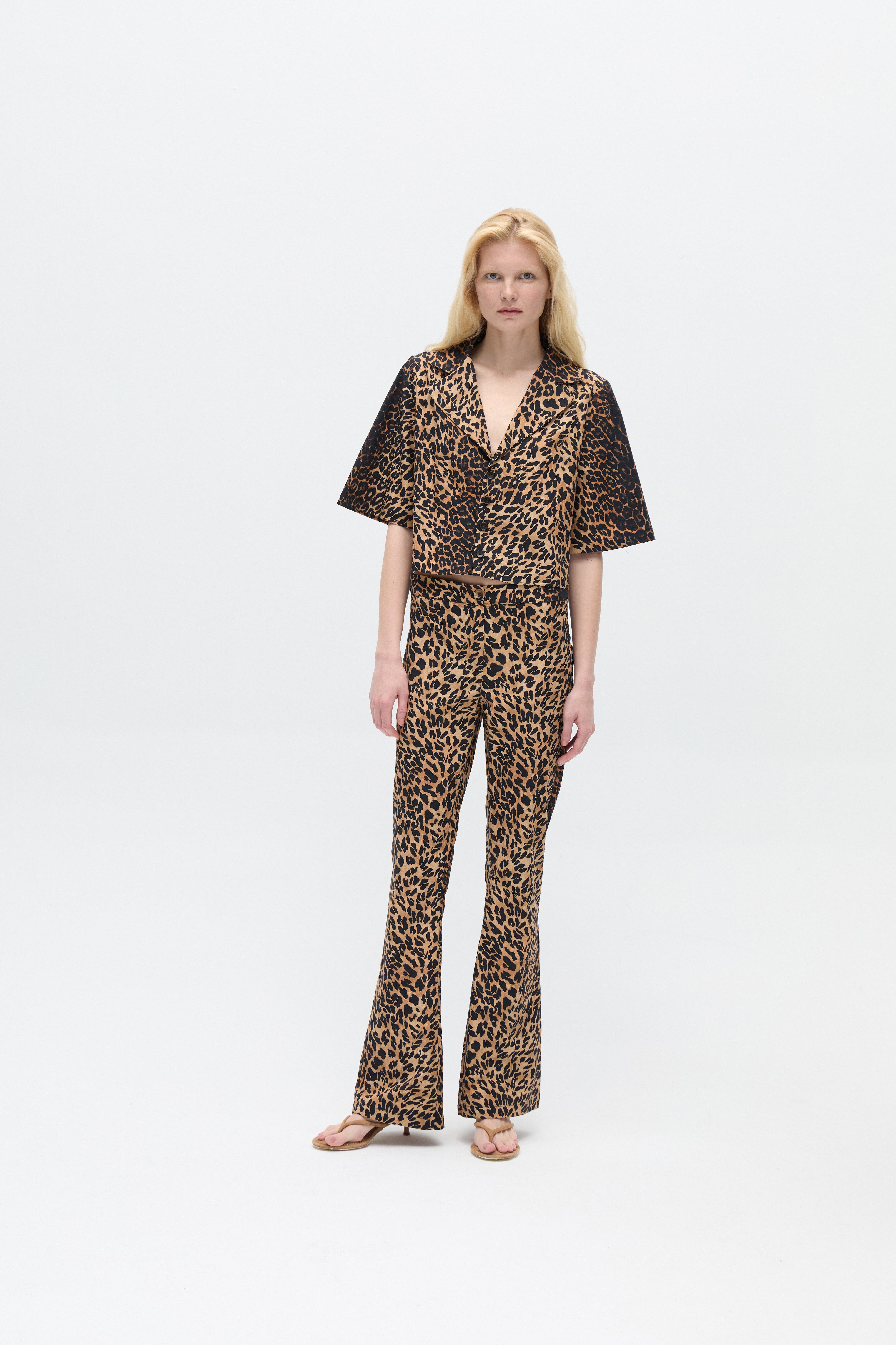 Nyra Üst, yumuşak pamuk kumaştan üretilmiş, dikkat çekici leopar deseniyle öne çıkan kısa bir modeldir. Modern kesimi günlük şıklığı yansıtır. Açık yakası ve önden düğmeli tasarımı, desenin enerjisini ön plana çıkarır. Her stile kolayca uyum sağlayan yapısıyla, tek başına ya da farklı parçalarla kombinlenebilir.