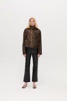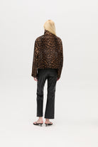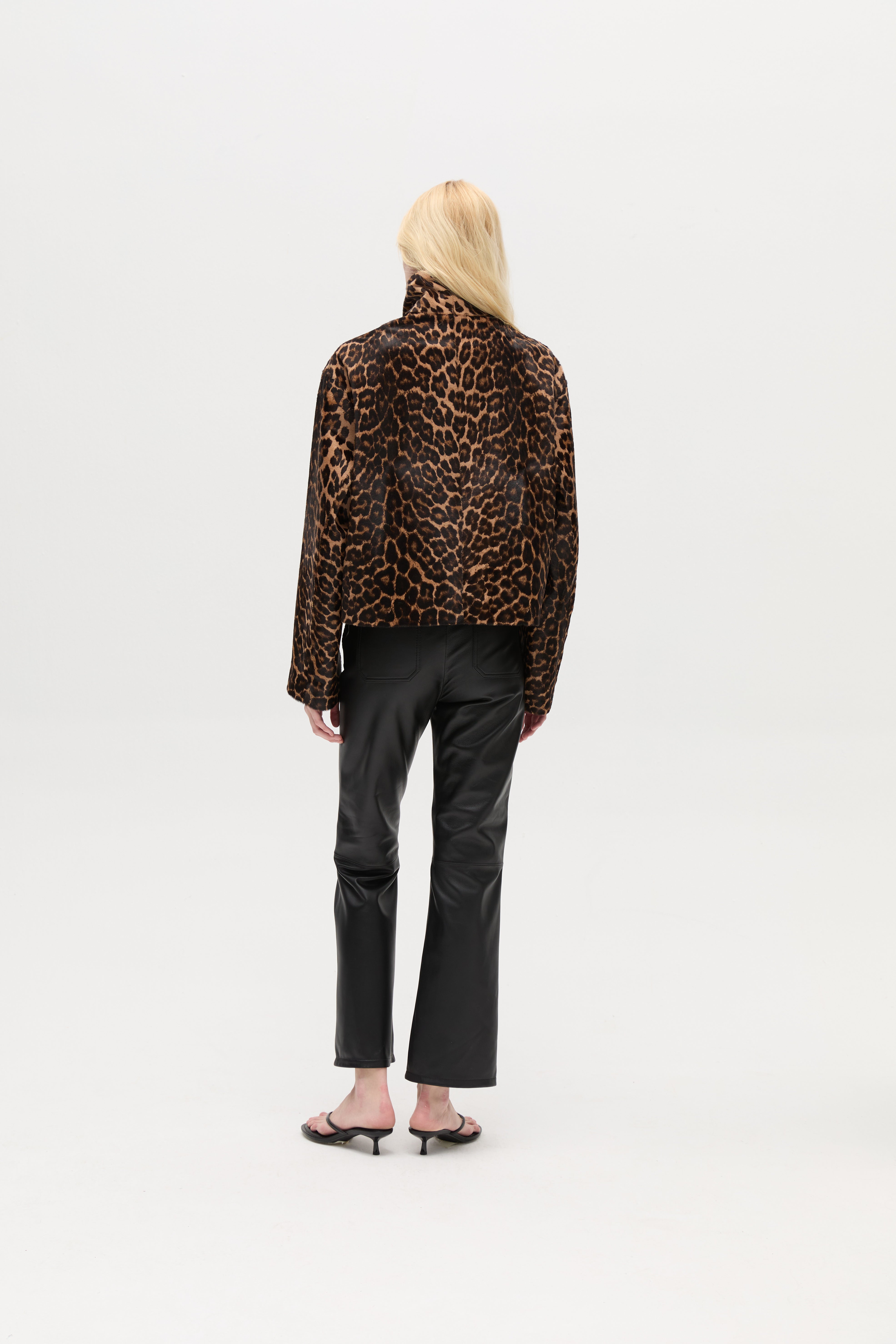 Nyra Ceket, dikkat çekici leopar deseniyle öne çıkan dana derisinden üretilmiştir. Yapılandırılmış yüksek yakası ve özenli fermuar kapamasıyla cesur ama zarif bir duruş sunar. Pürüzsüz ve esnek derisi, ceketin şık görünümünü güçlendirirken, modern kesimi kendinden emin bir stil ortaya koyar. Gündüzden geceye kolayca uyum sağlayan zamansız bir parçadır.
