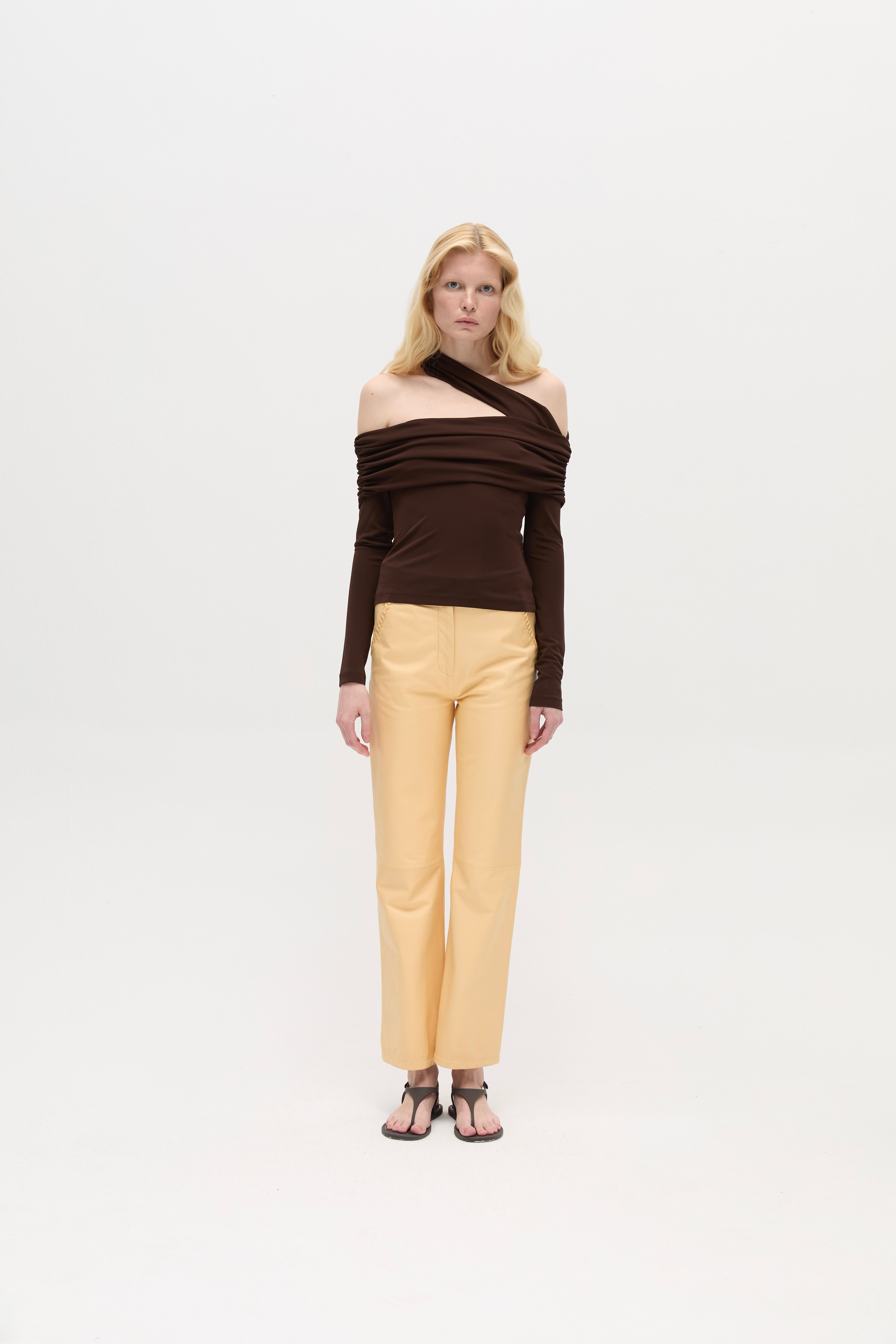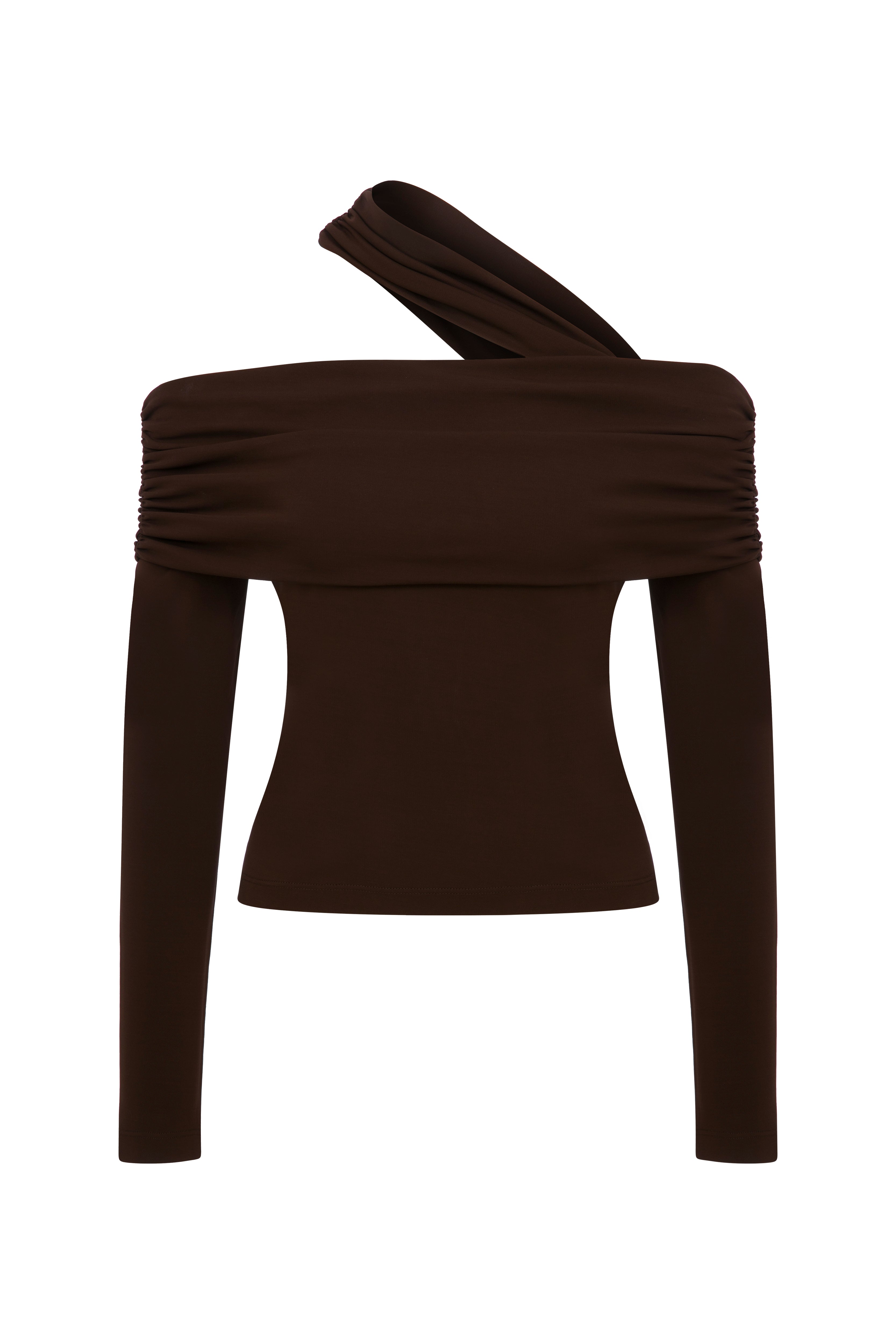 Sia Üst, kahverengi viskon jarse kumaştan üretilmiştir. Düşük omuz kısmındaki büzgü detayı ve boyundan geçen şerit formu ile özgün bir siluet sunar. Uzun kolları ve bedeni saran formu sayesinde zarif ve dengeli bir görünüm oluşturur; farklı alt parçalarla kolayca kombinlenebilir.