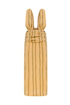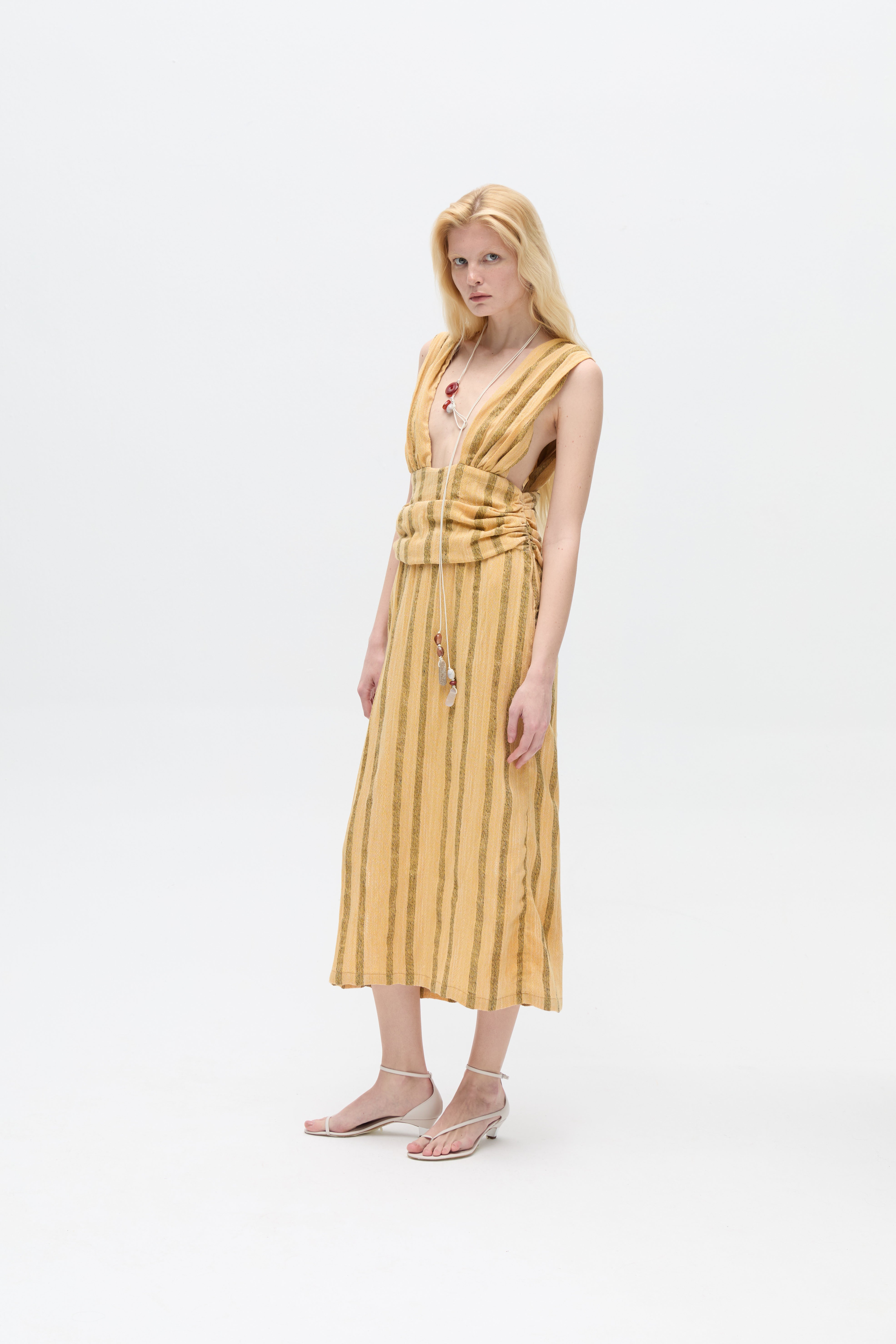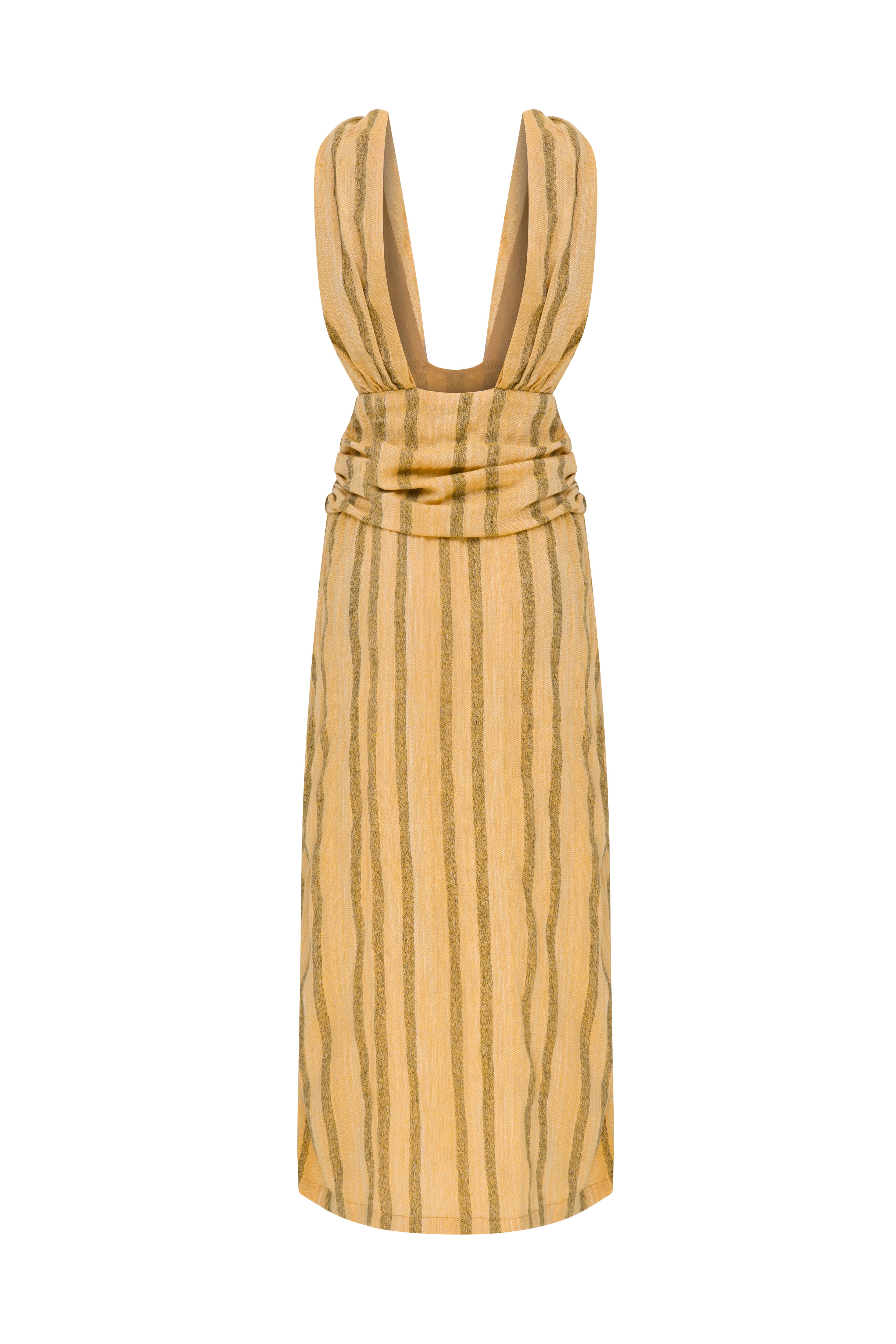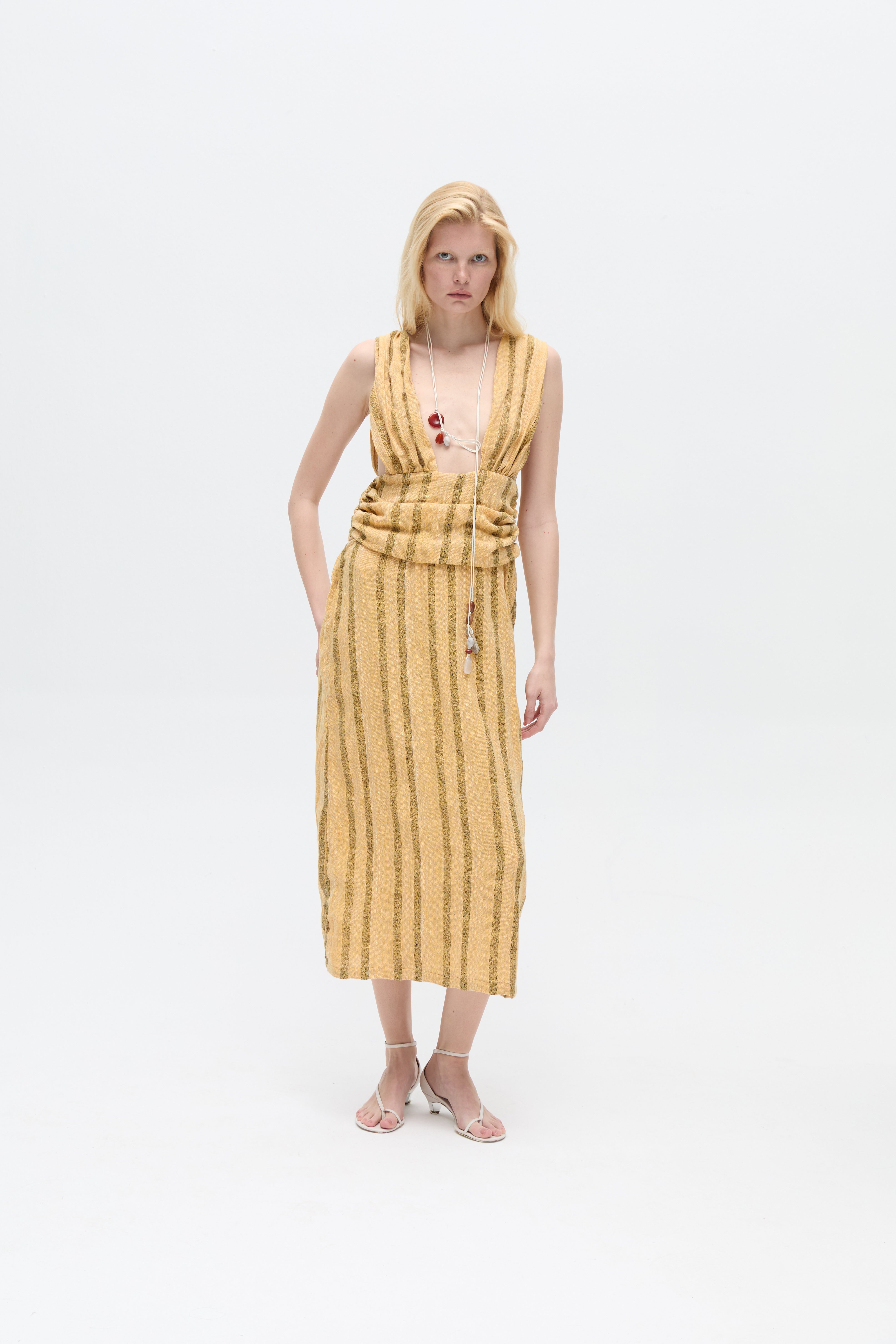 Soli Midi Elbise, büzgü detaylı yaka kesimi ve geniş askılarıyla sade ama dikkat çekici bir form sunar. Gri çizgilerle hareketlendirilmiş çok renkli pamuk kumaştan üretilmiştir. Bele oturan üst kısmı bedeni hafifçe tanımlar, düz kesimli ve bileğe kadar uzanan eteğe dökülür. Dikey çizgi deseni elbisenin uzun siluetini öne çıkarırken, sade hatları yaka formunun modern görünümünü vurgular.