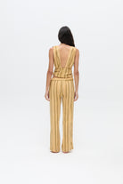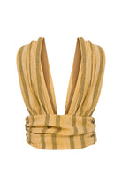 Soli Üst, gri çizgilerle hareketlendirilmiş çok renkli pamuk kumaştan tasarlanmıştır. Ön kısmındaki büzgü detayı ve geniş askıları, modele dengeli ve modern bir görünüm kazandırır. Kısa kesimi bedeni doğal biçimde takip eder. Yüksek belli pantolonlar ve eteklerle bir araya geldiğinde modern ve dikkat çekici bir görünüm oluşturur.