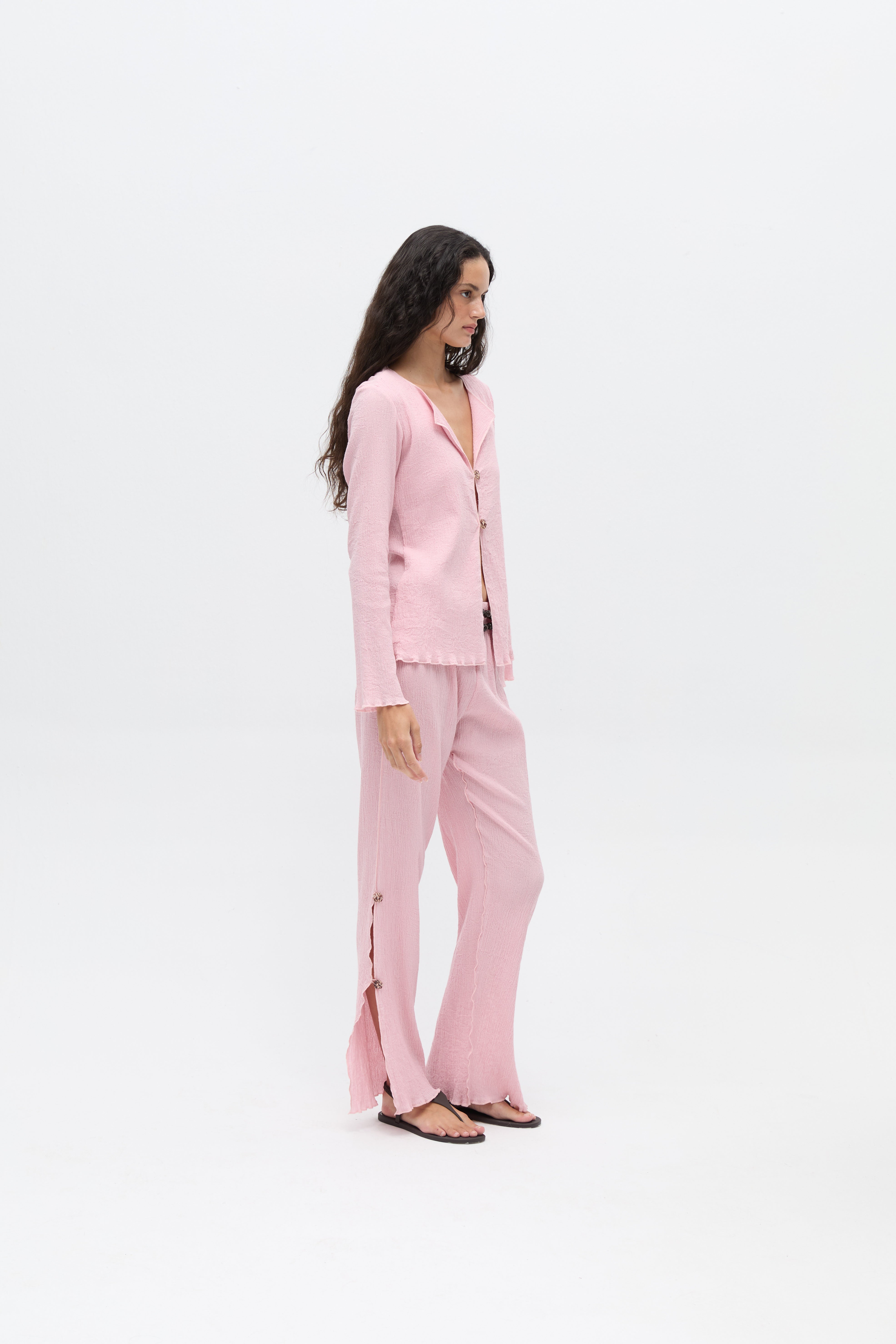 Biye Detaylı Kırışık Dokulu Pembe Pantolon