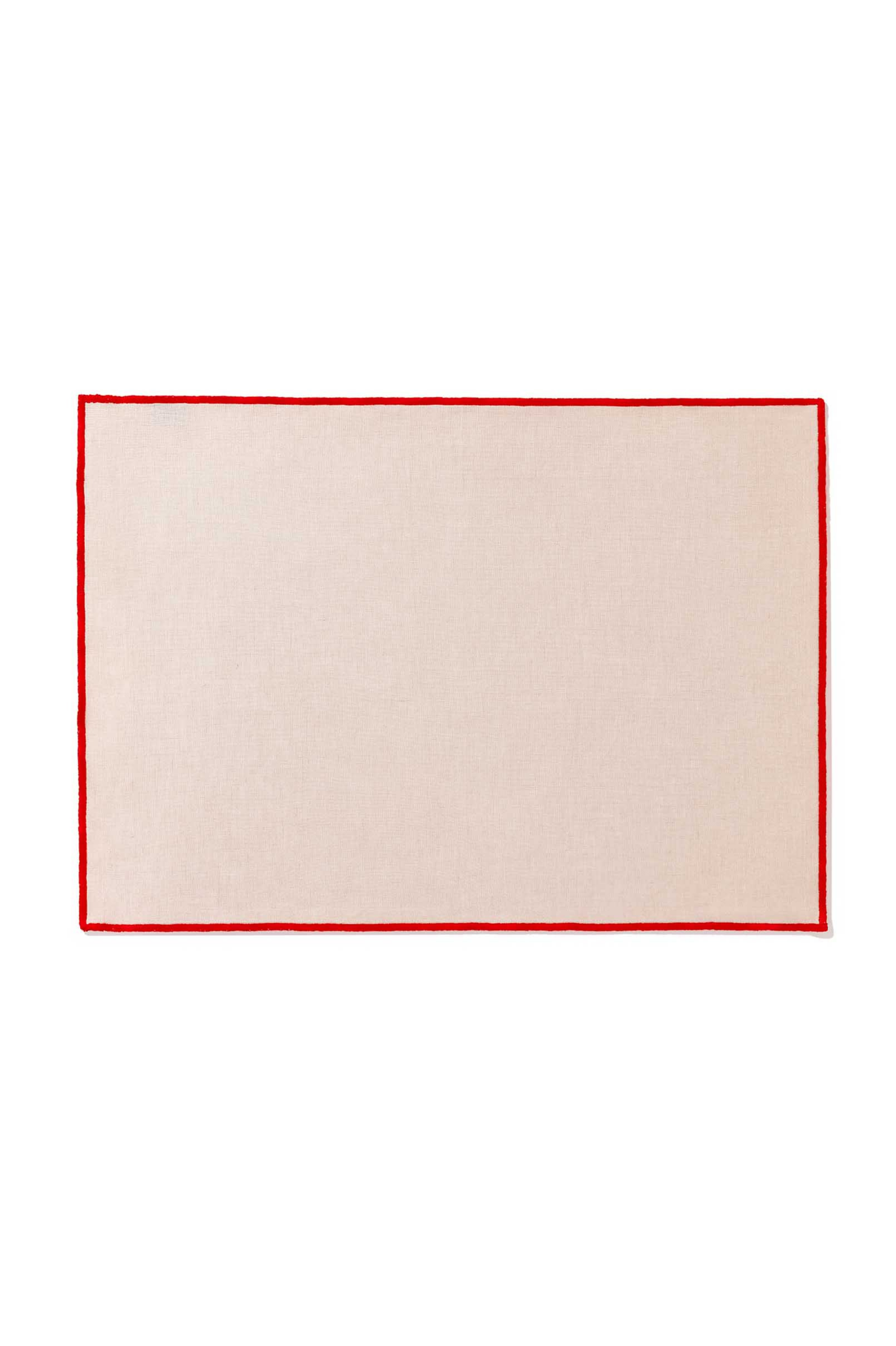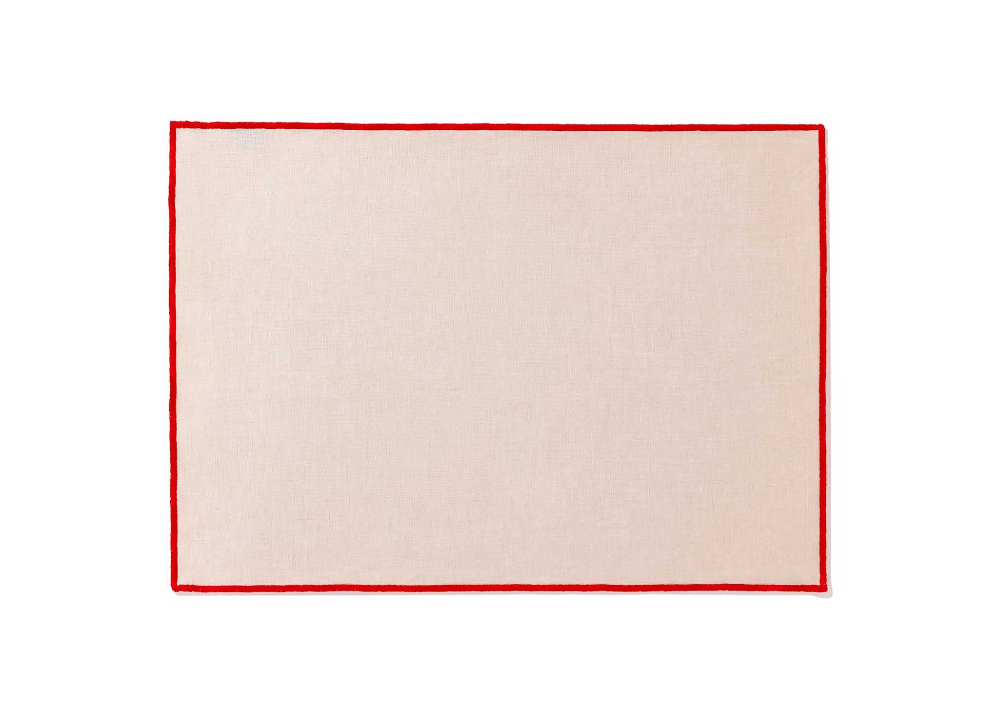Margot Amerikan Servisi, bej ketenden üretilmiş olup canlı kırmızı biye detayıyla sade tonları cesur bir dokunuşla birleştirir. Tekli olarak satılır, sofralara hem zarif hem de enerjik bir hava katar.