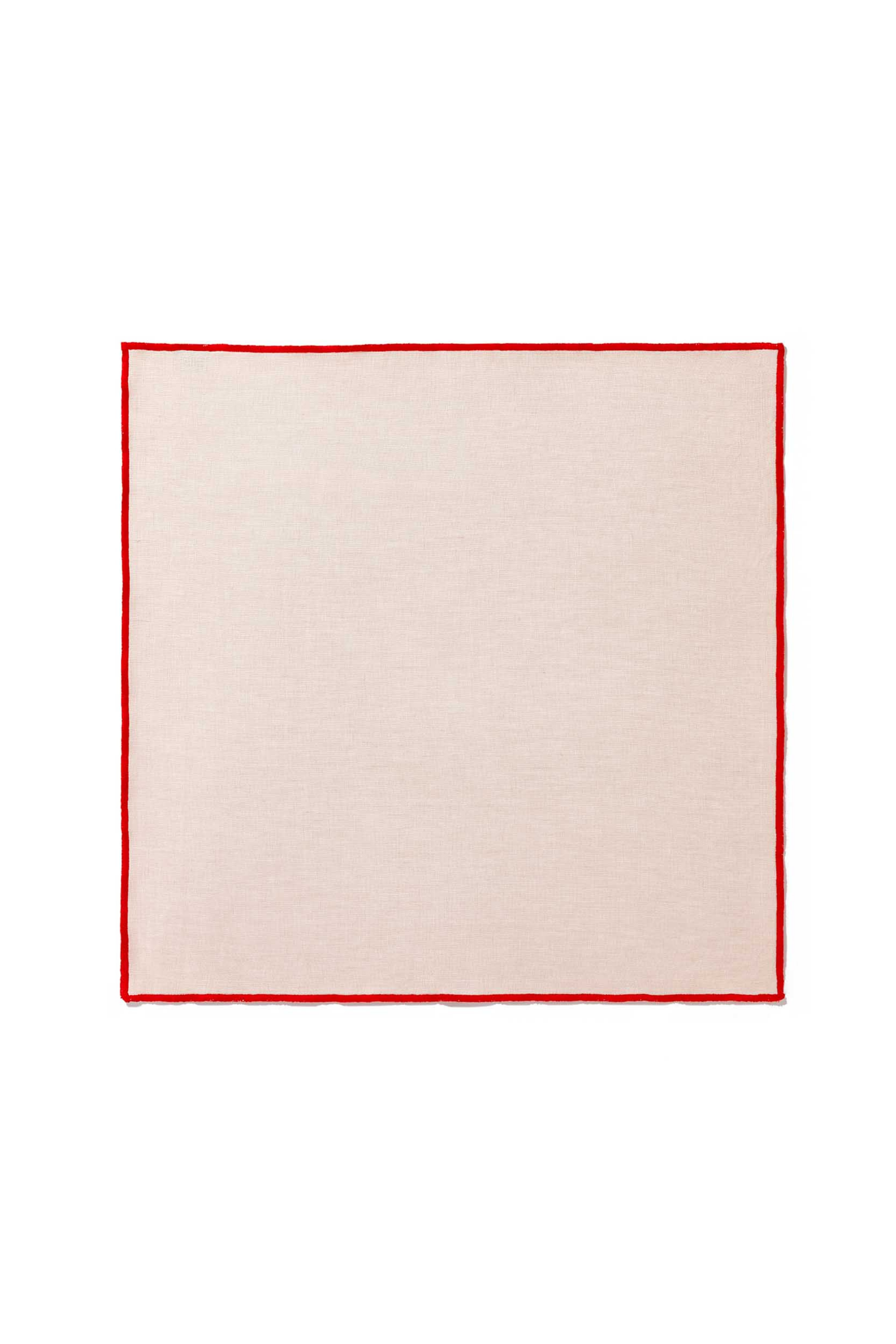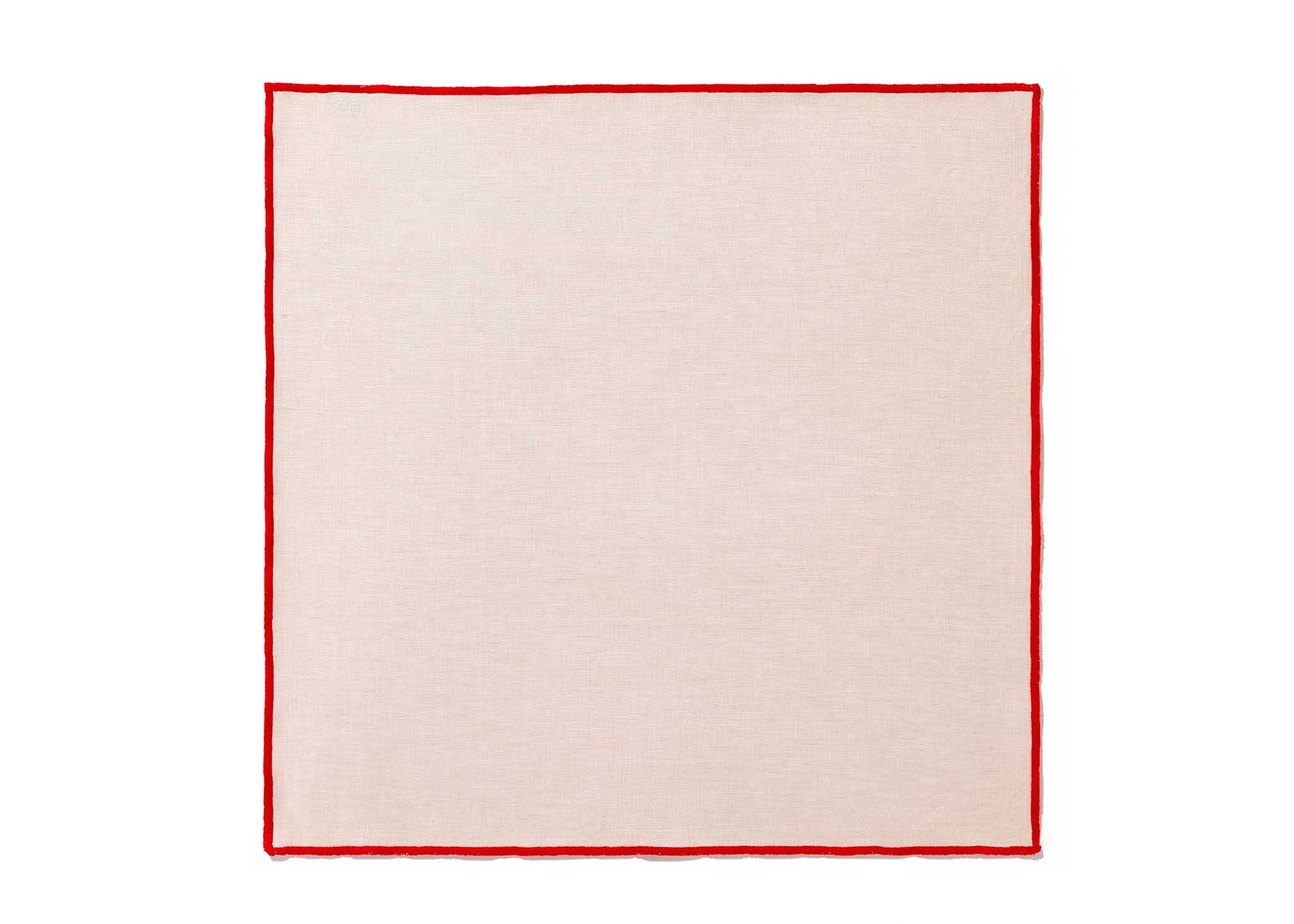 Margot Peçete, bej keten üzerine dikkat çekici kırmızı biye detayıyla temiz ve modern bir görünüm sunar. Diğer sofra öğeleriyle katmanlı bir şekilde kullanmak için idealdir ve tekli olarak satılır.