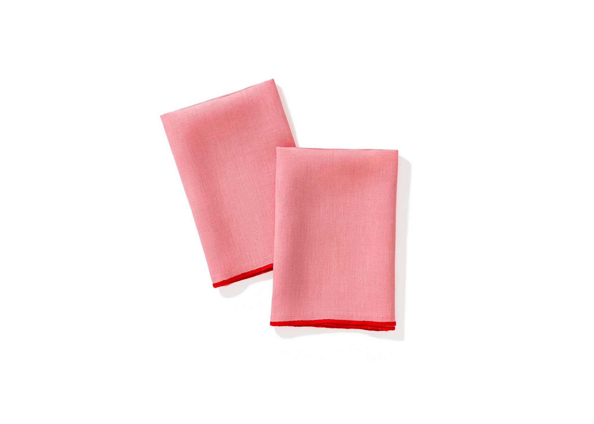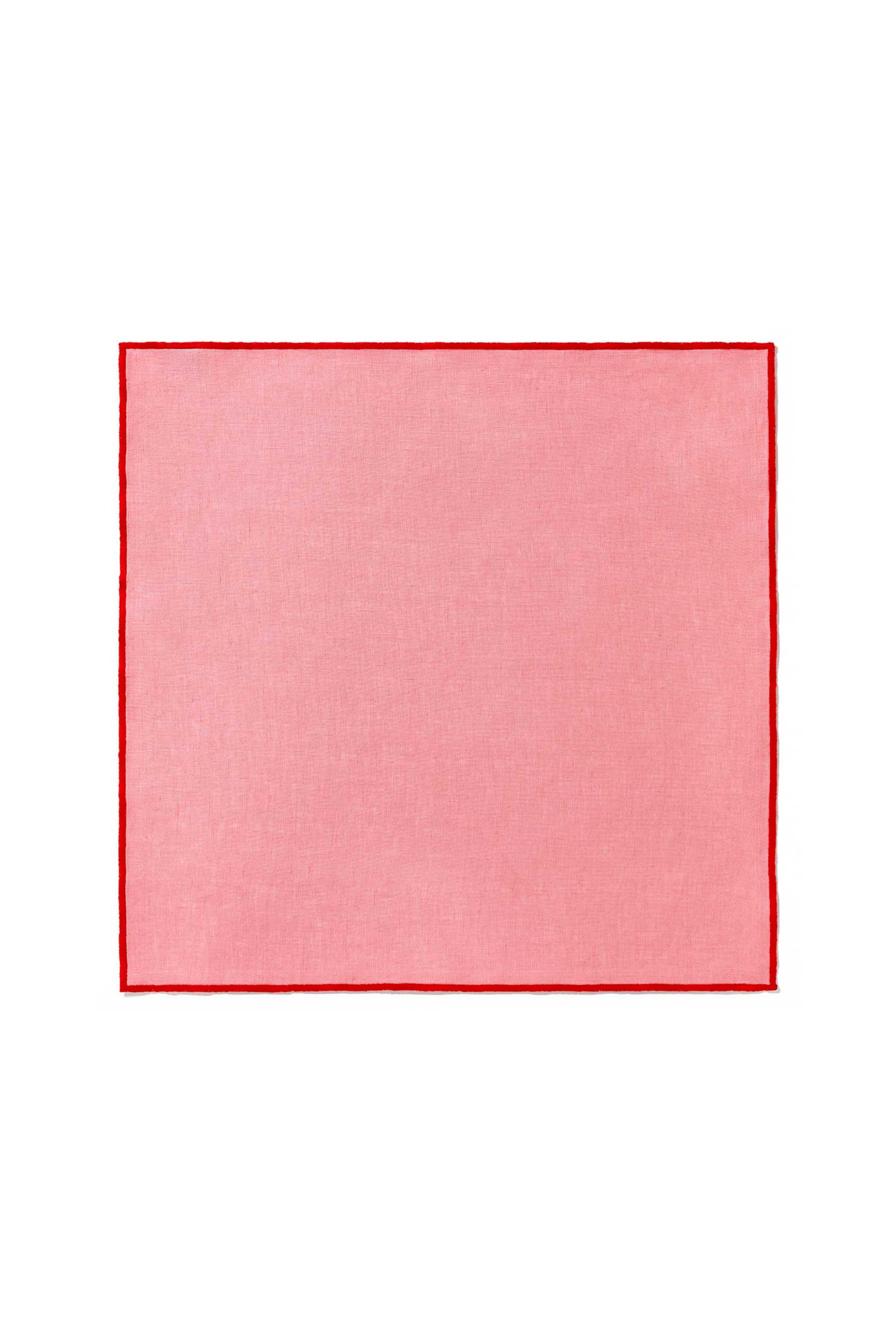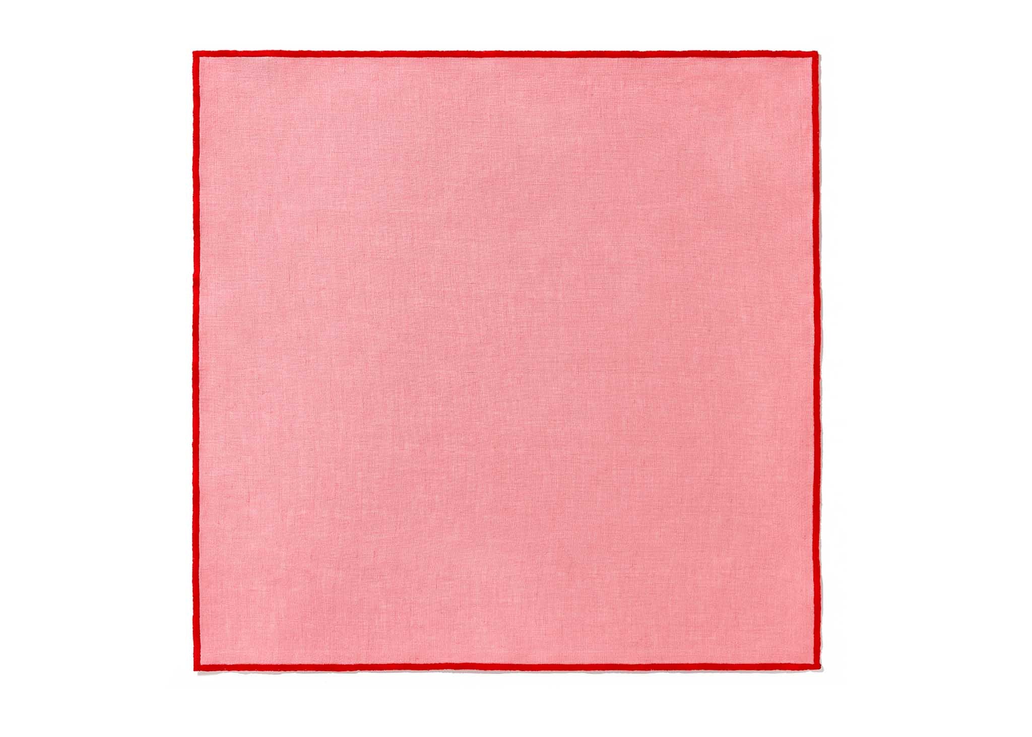 Margot Peçete, pembe ketenden üretilmiş olup canlı kırmızı biye detayıyla klasik bir sofra parçasına modern ve şık bir dokunuş katar. Tekli olarak satılır, katmanlı ve dinamik sofra düzenlerinde kullanılmak için idealdir.