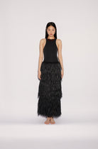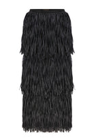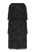 Alora Maxi Etek, siyah pamuklu kumaştan üretilmiştir ve düşük bel siluetinde tasarlanmıştır. Etek ucundaki rafya püskül detaylarıyla hareket ve doku katar. Hem iddialı hem de zarif görünümüyle temiz ve uzun bir siluet sunar.