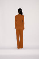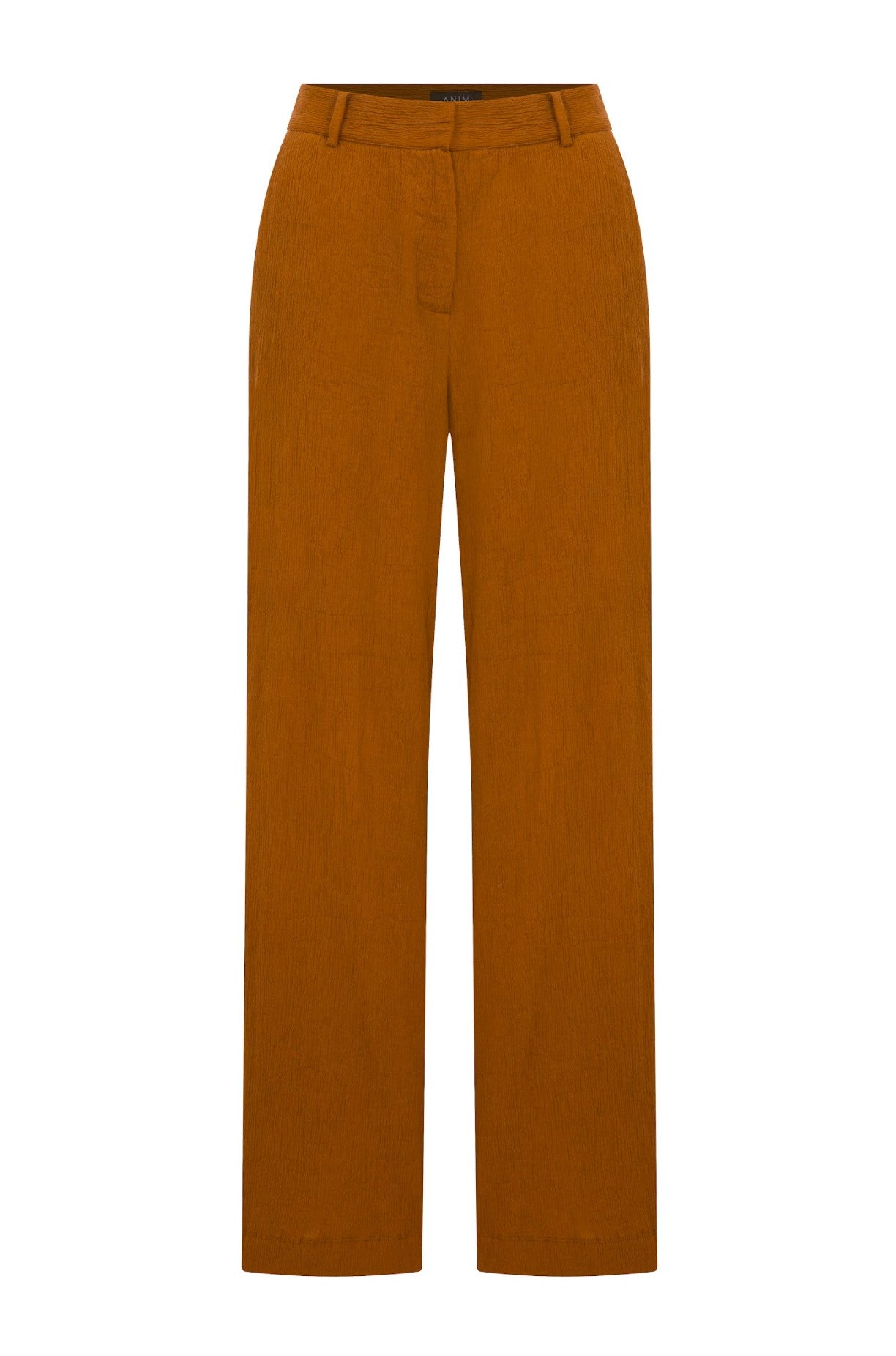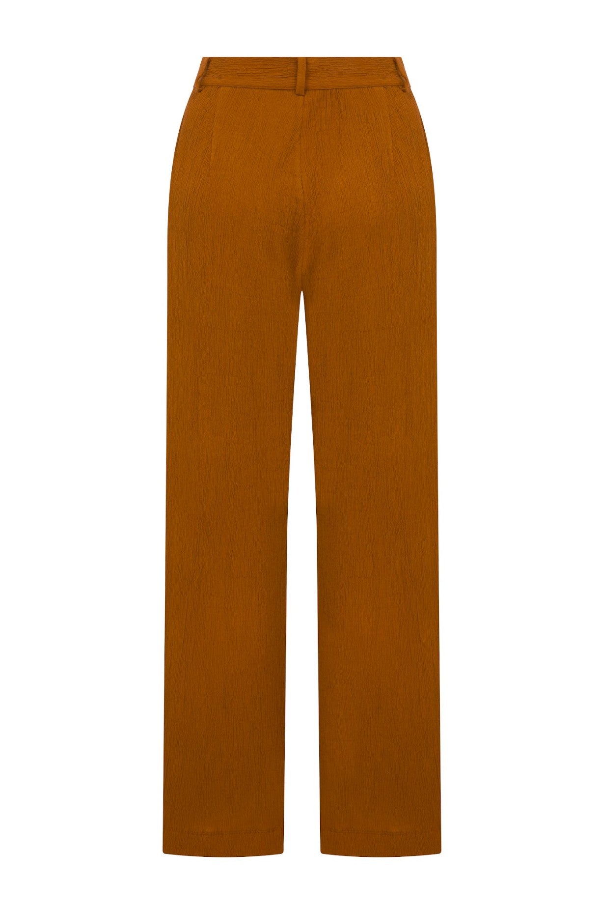 Cyrus Pantolon, rustik karamel tonundaki kırışık dokulu pamuklu kumaştan üretilmiştir. Rahat, düz paça silueti ve ince dokusuyla günlük giyime ferah ve zarif bir duruş kazandırır. Nefes alabilen yapısı sayesinde gün boyu konfor sağlar.