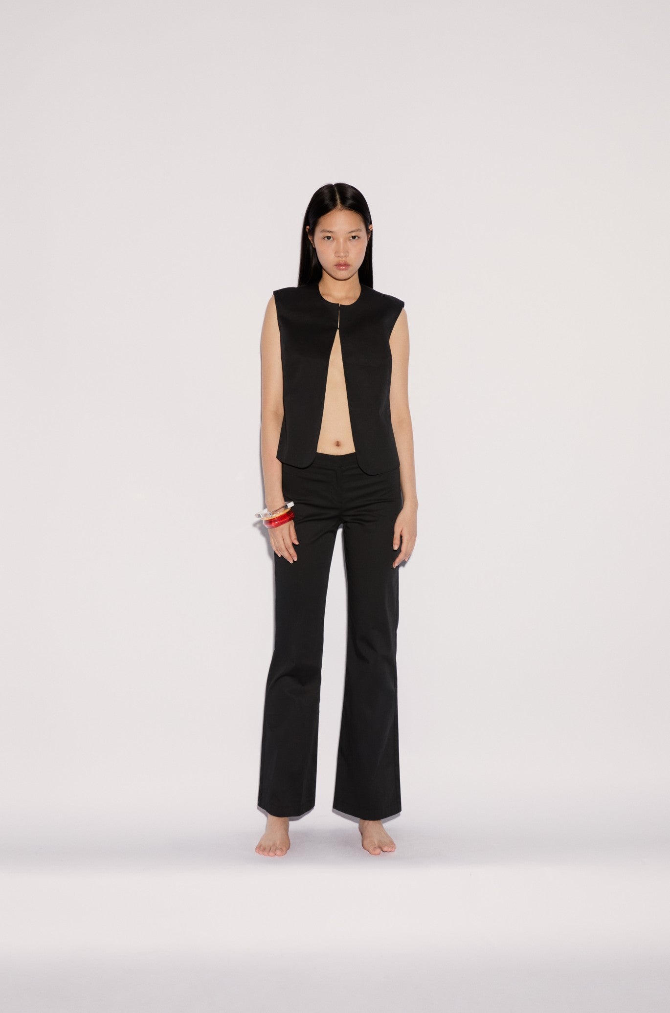 Sova Pantolon, derin siyah tonundaki pamuk gabardinden üretilmiştir ve yapılandırılmış ama zahmetsiz bir duruş sunan düz paça kesime sahiptir. Temiz dikiş detayları ve zamansız formu ile günlük giyimde şık bir temel parça işlevi görür.