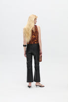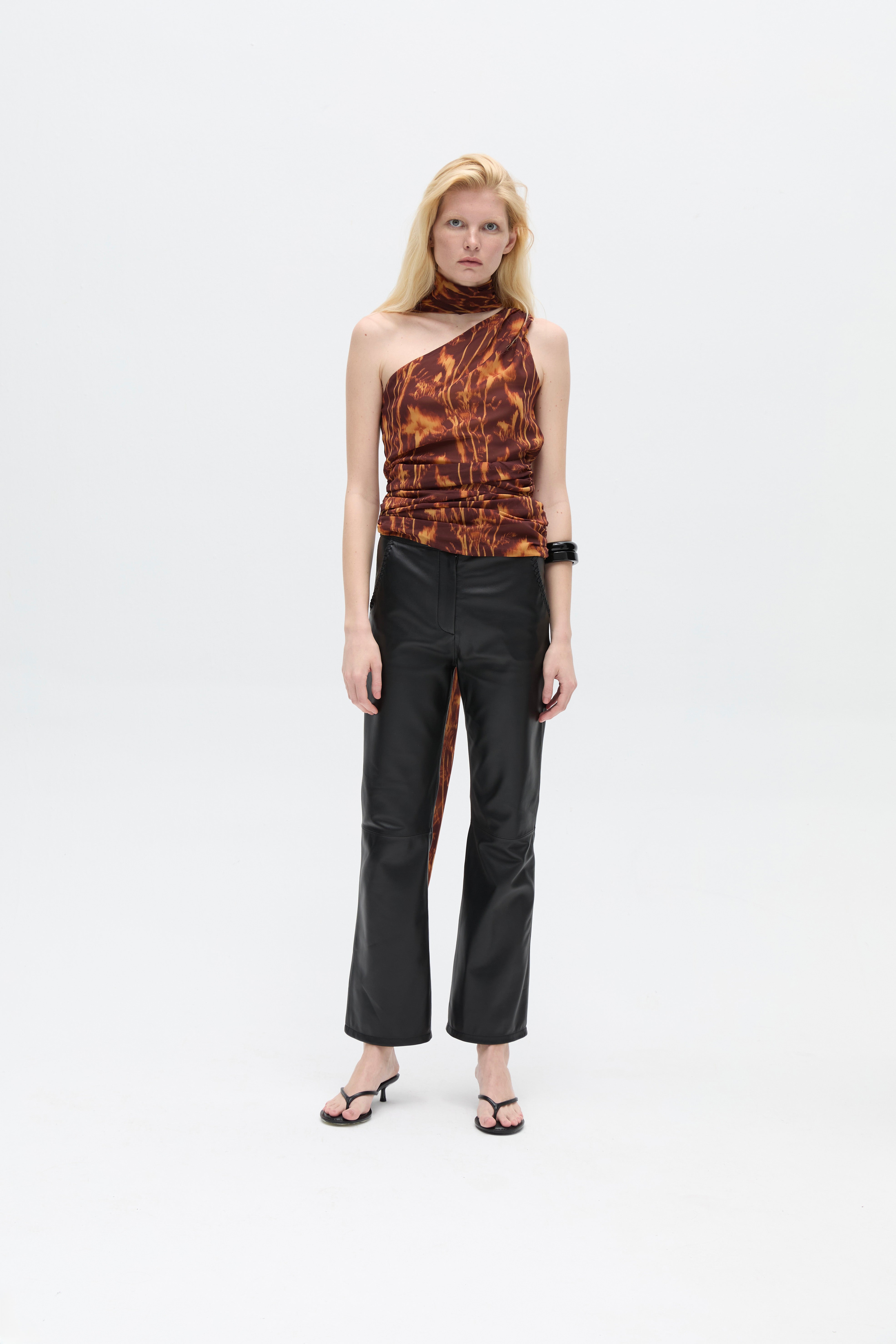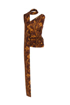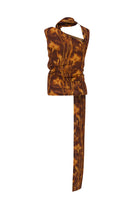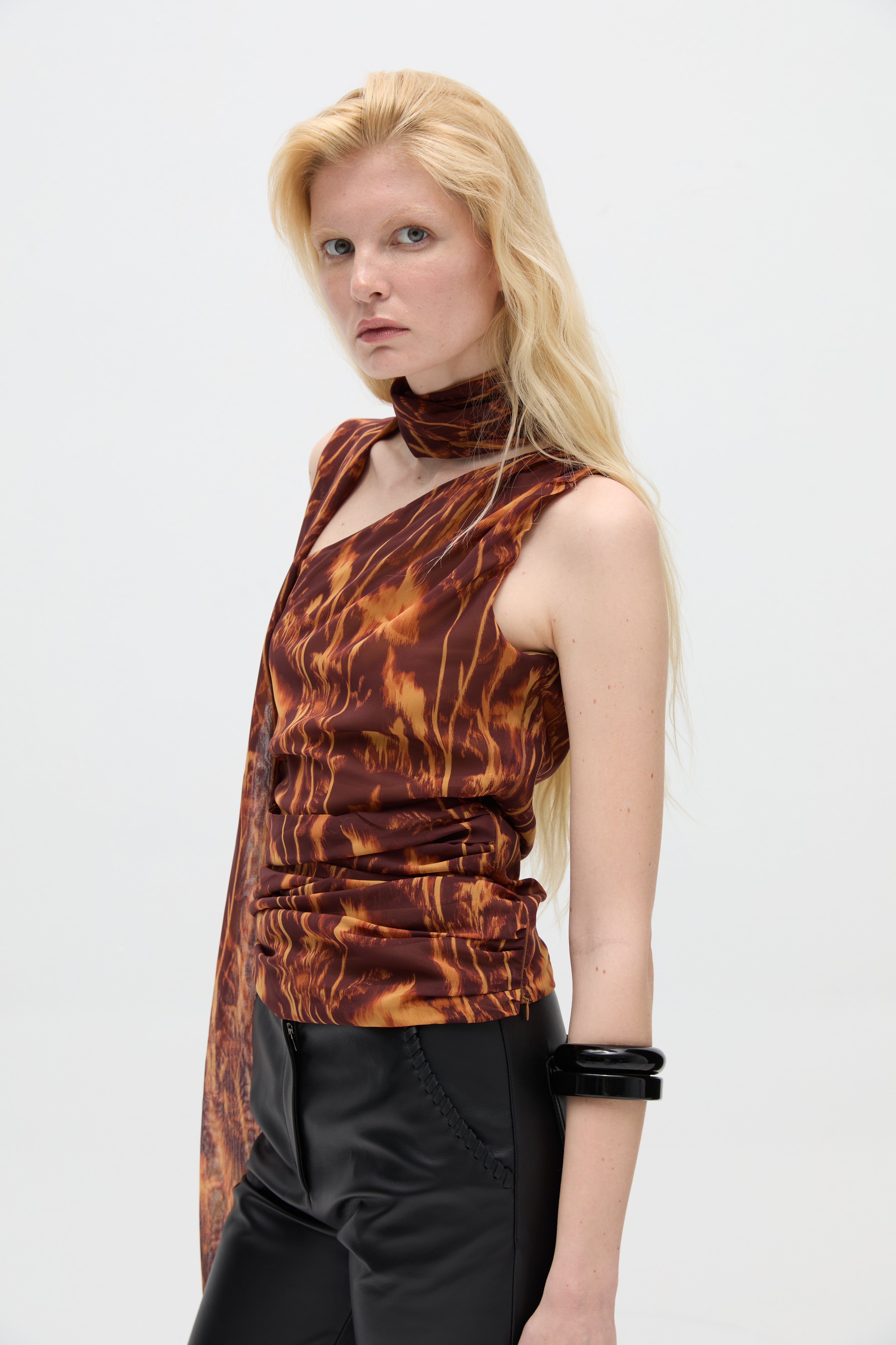 Sola Üst, desenli şifon kumaştan, modern bir kruvaze esintili tasarıma sahiptir. Kolsuz formu ve boyuna dolanan uzun kuşağıyla öne çıkar. İnce kumaşı doğal bir dökümlülük sunar; hem tek başına hem de farklı parçalarla kullanılabilecek çok yönlü bir parçadır.