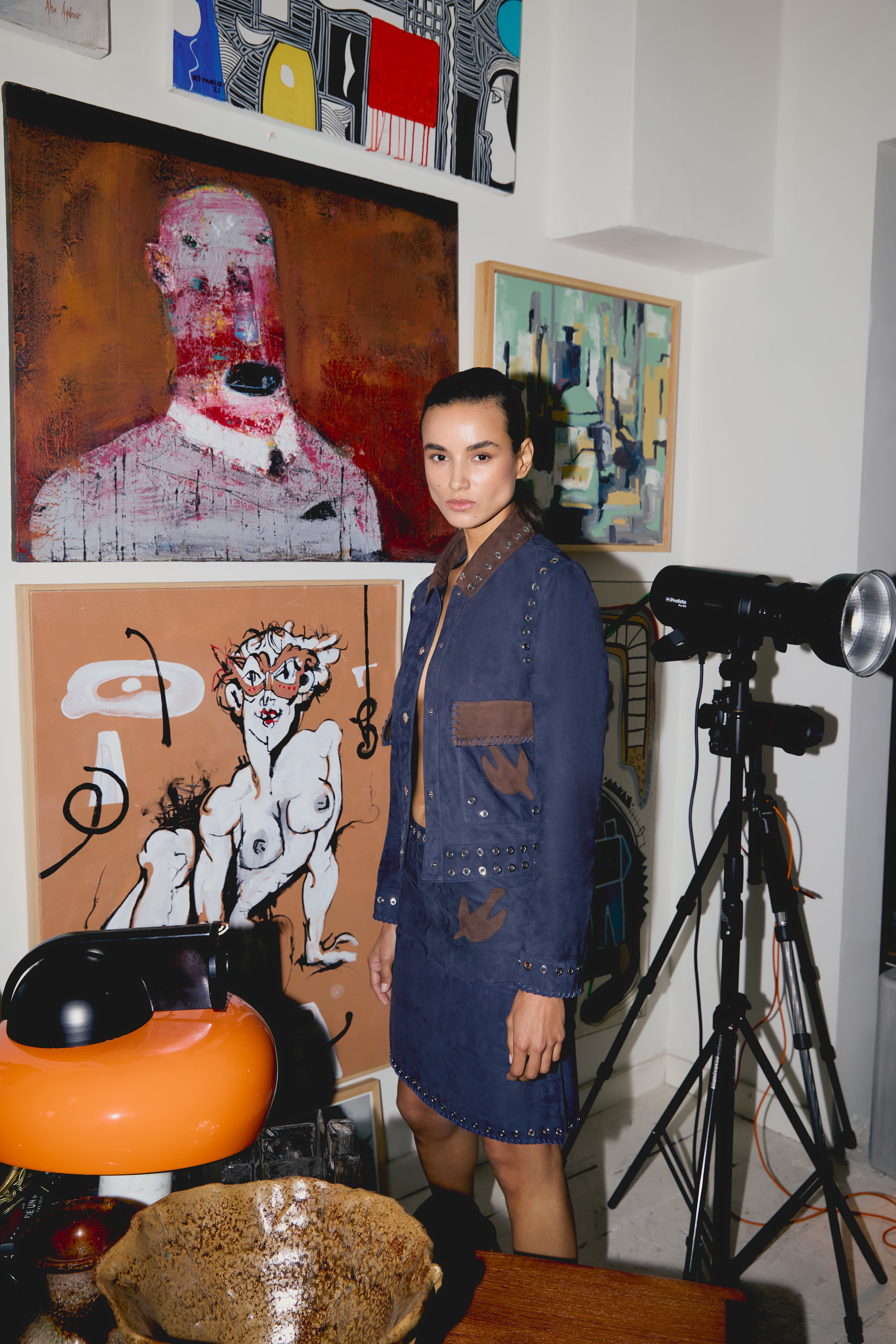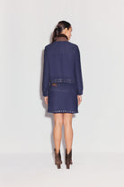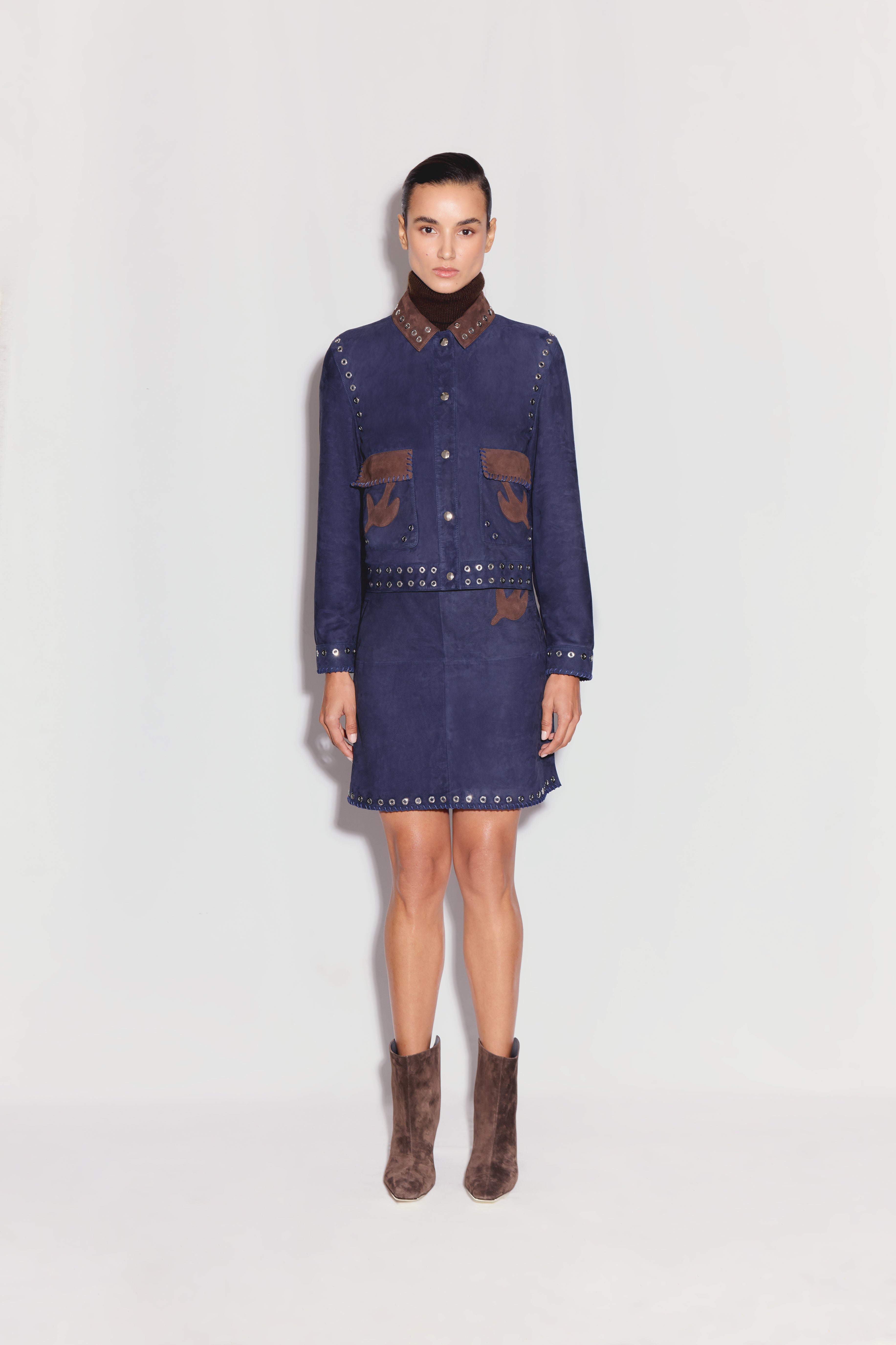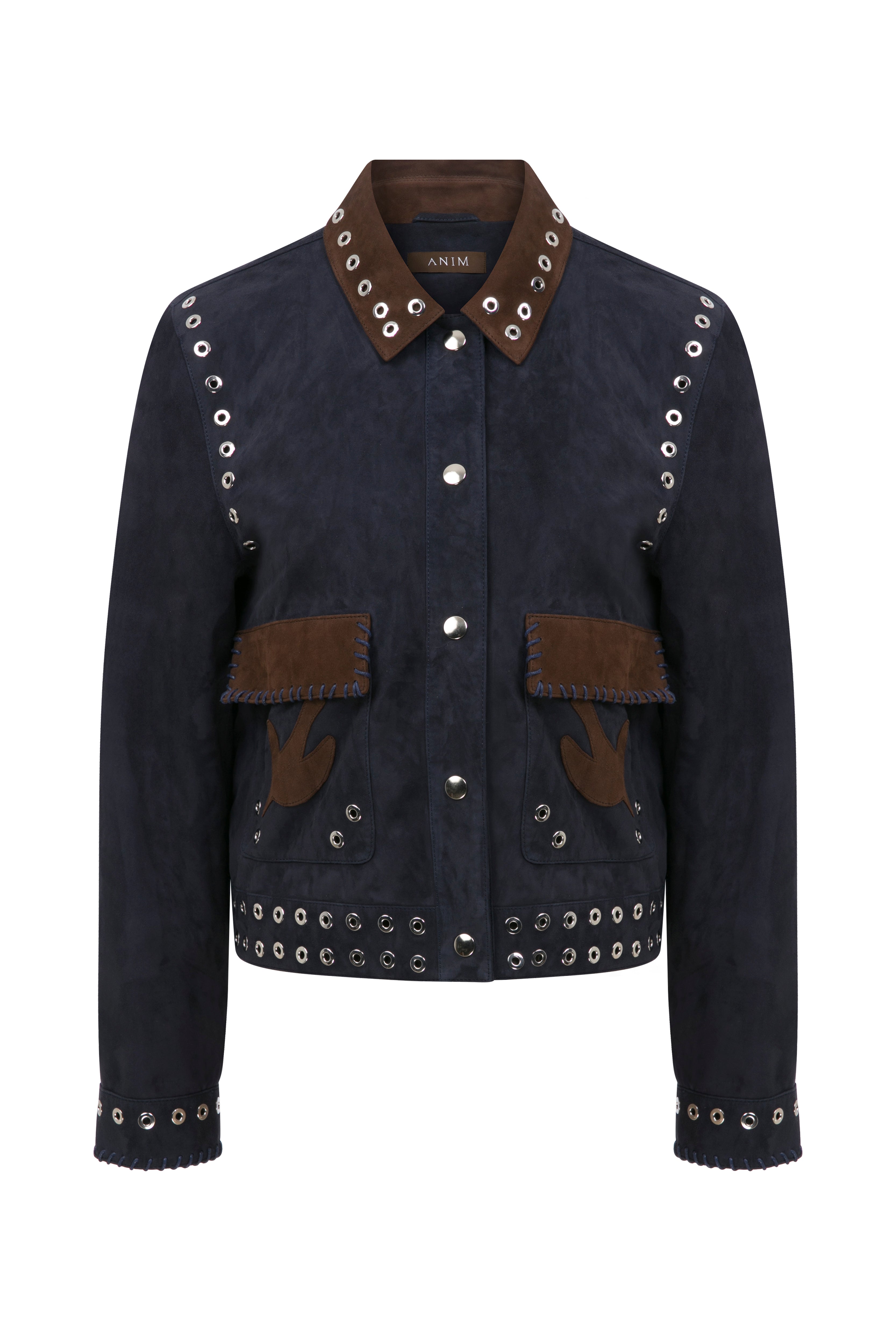 Maven Ceket, lacivert renkli yakalı süet bir ceket olup kontrast kahverengi cep kapakları ve ince işçilikli nakışlarla süslenmiştir. Yaka, manşetler ve etek boyunca yer alan metal halka detayları klasik siluetine kendine özgü bir hava katar. Rahat ama yapılı kesimi sayesinde gömlekler veya triko kazaklar üzerine kolayca kat kat giyilebilir ve serin sezonlar için dikkat çekici bir dış giyim parçası oluşturur.