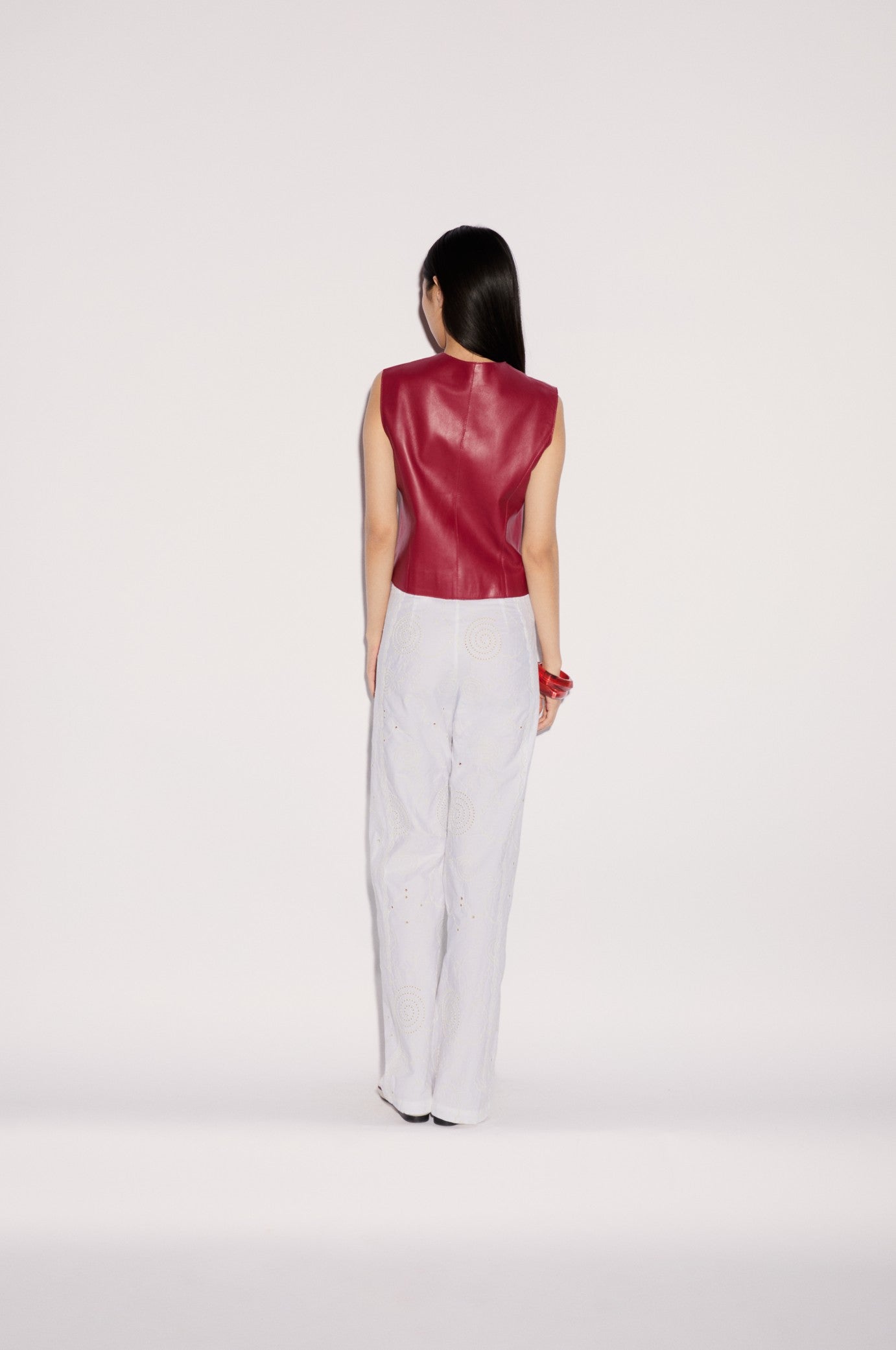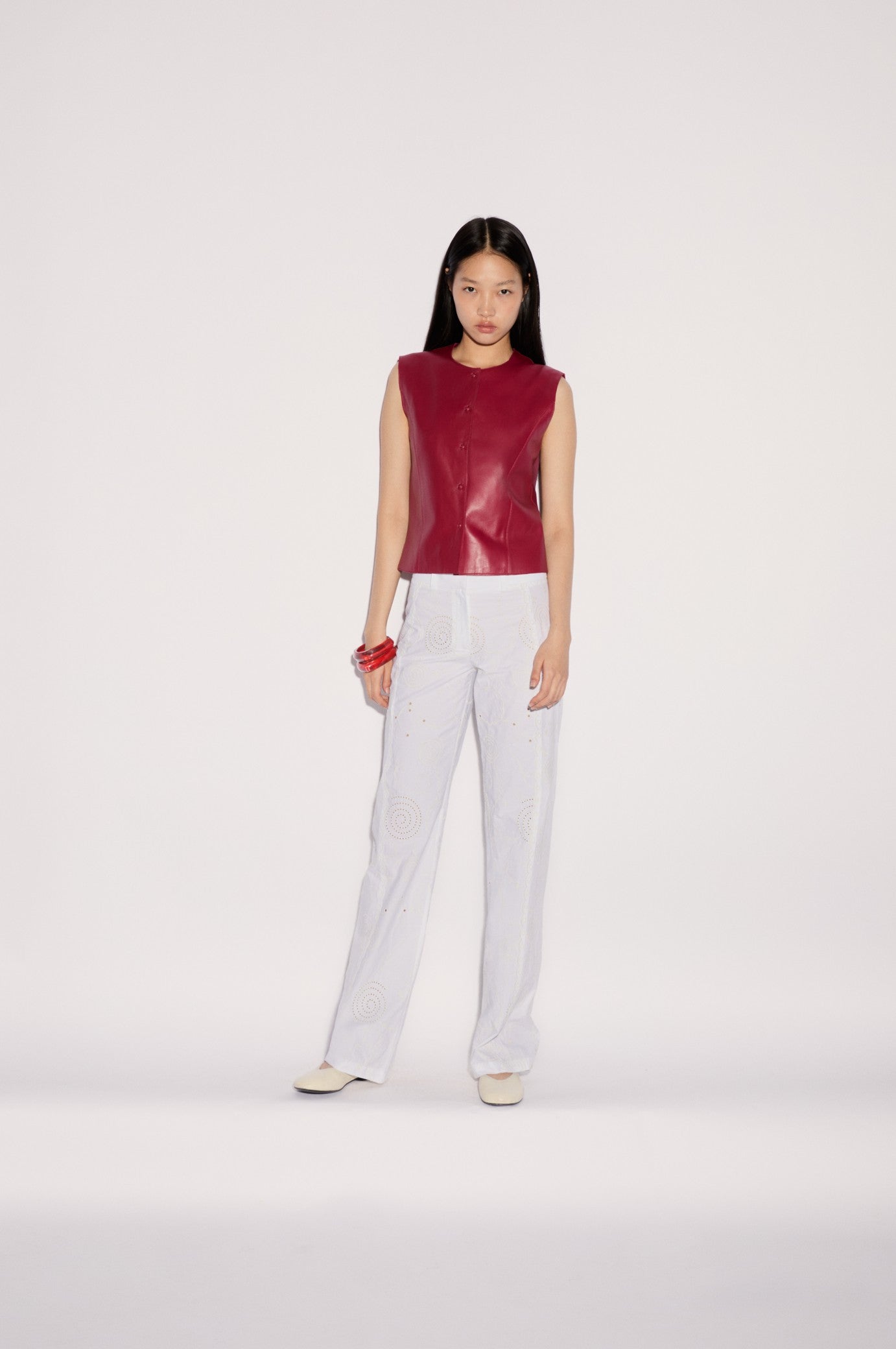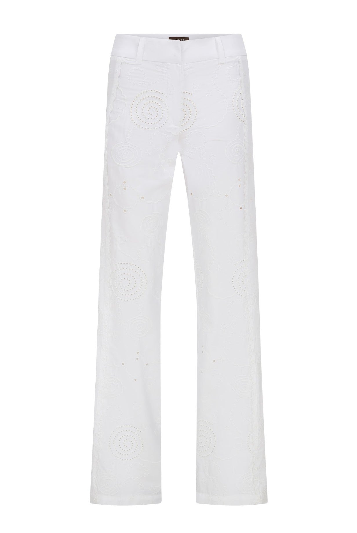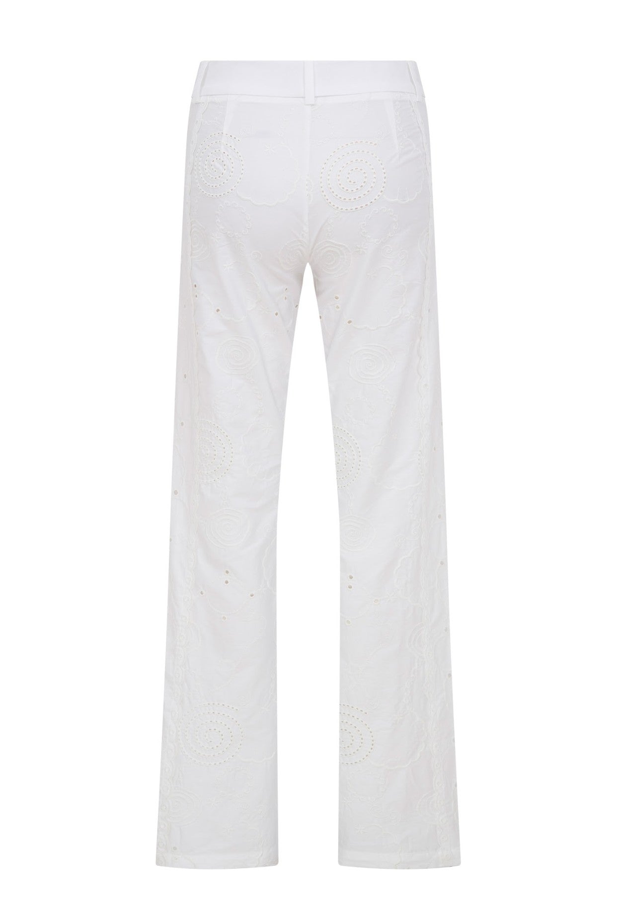 Luma Pantolon beyaz nakışlı pamuk kumaştan üretilmiştir ve yanlarda yer alan ton-sür-ton yama detaylarıyla hafif bir doku ve boyut kazandırır.