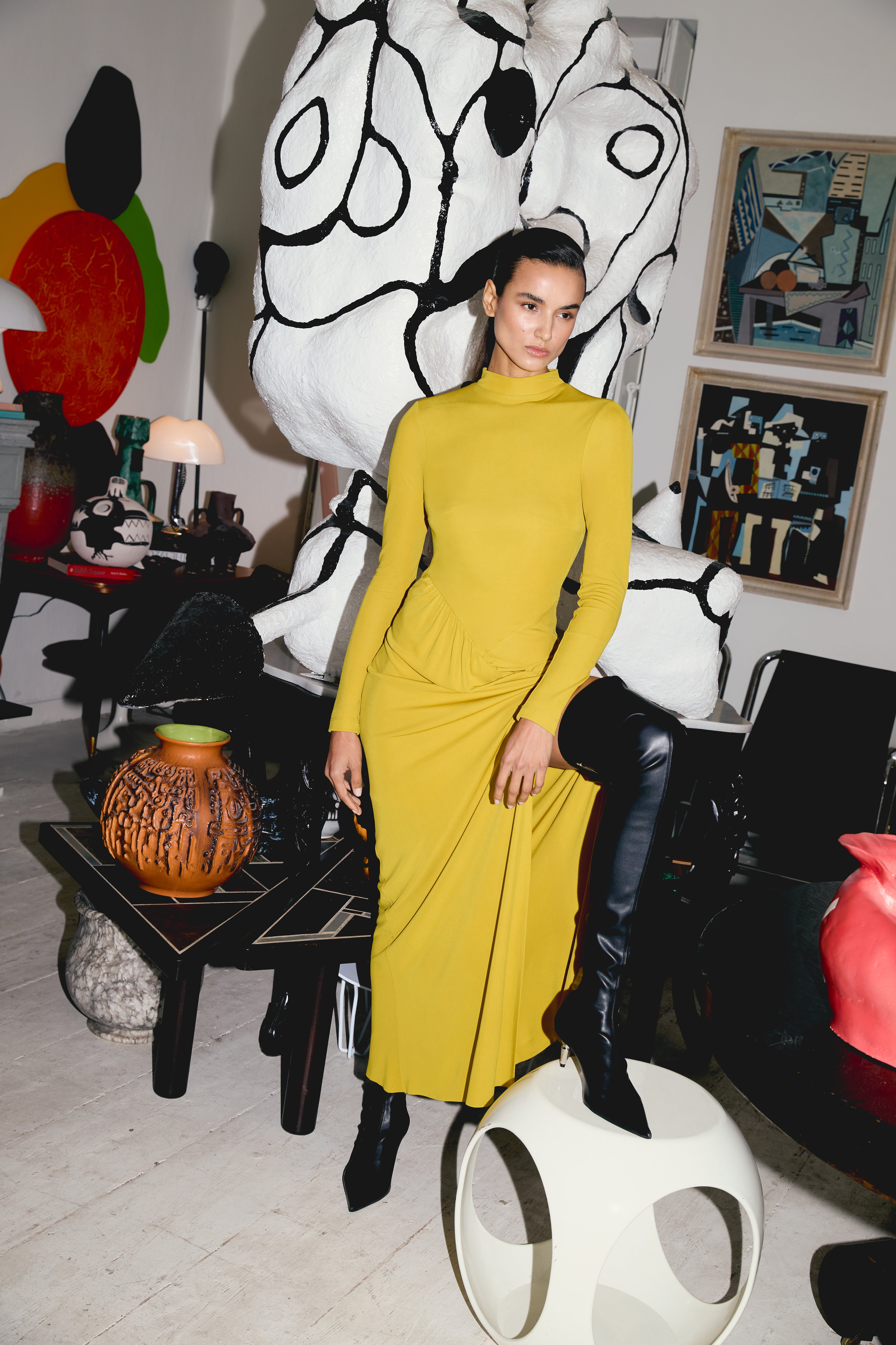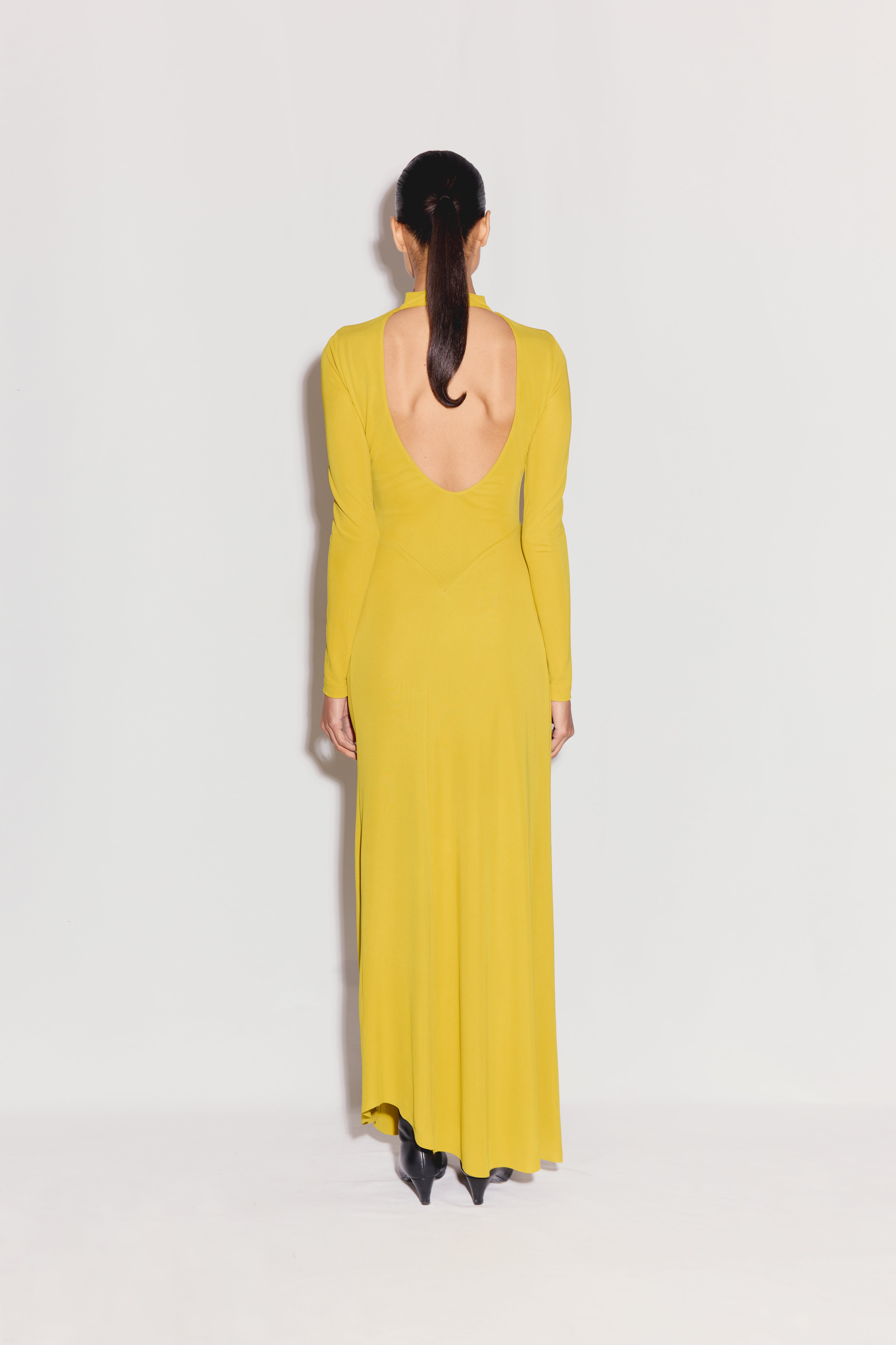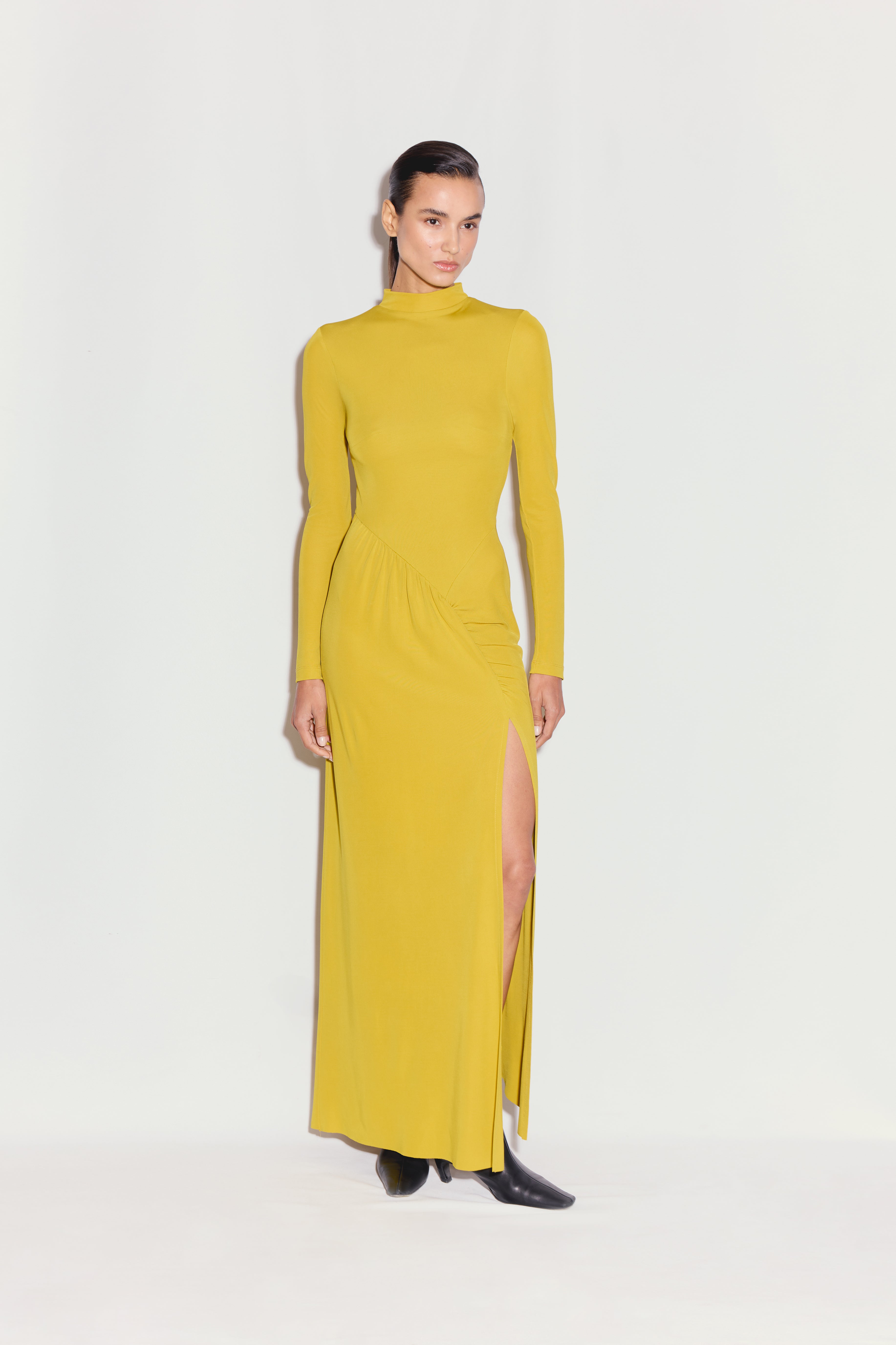 Wade Elbise, sezonun sıcaklığını yansıtan çarpıcı bir hardal tonunda, yüksek yakalı ve uzun kollu maxi bir elbisedir. Dökümlü viskoz kumaştan üretilmiş olup, beli ve kalçayı saran dar kesimli bir üst gövdeye sahiptir. Şık drape detayları elbiseye hareket ve zarif bir akış kazandırır. Maxi boyu ise vücudu uzun göstererek sofistike ve dikkat çekici bir stil sunar.