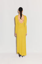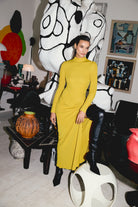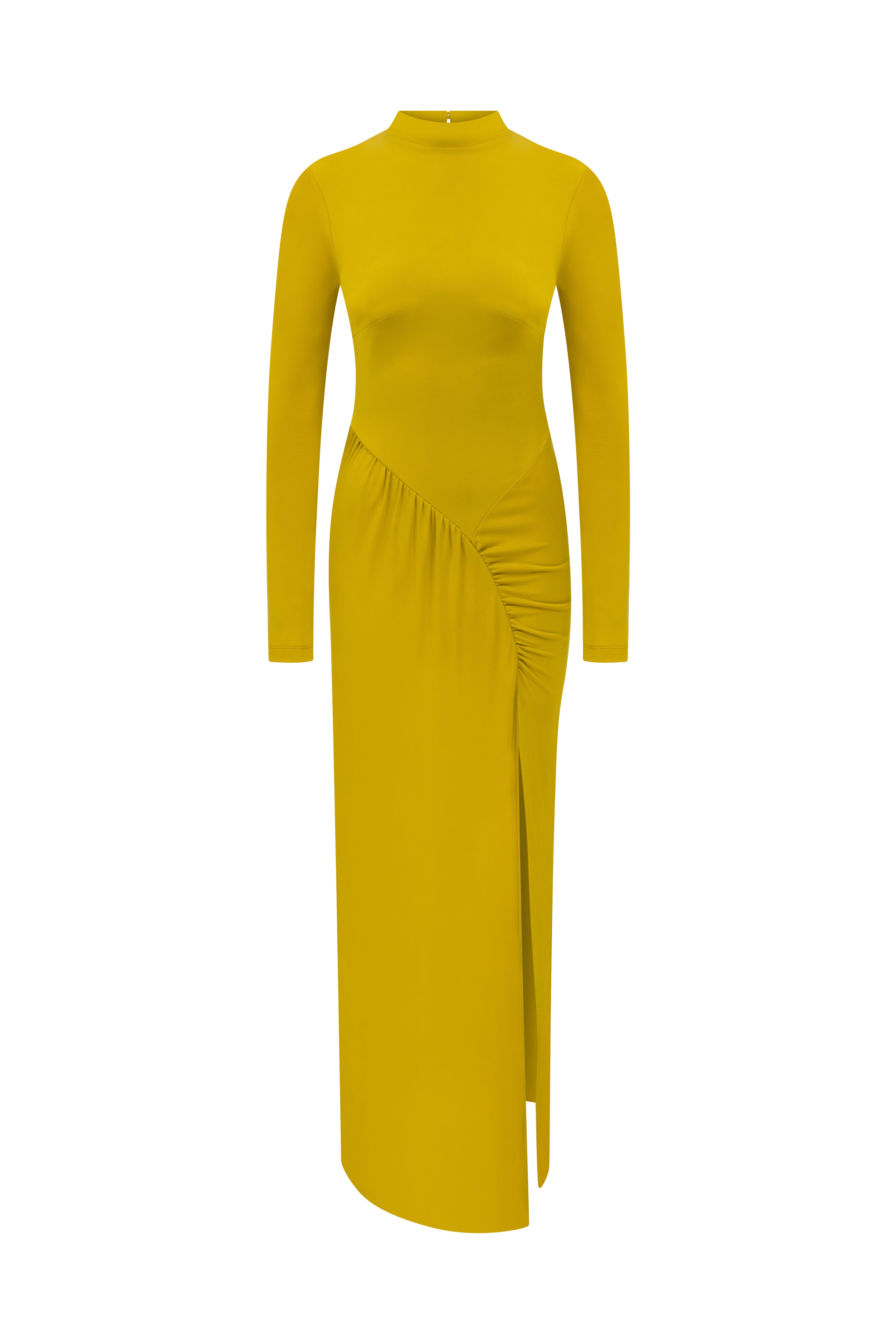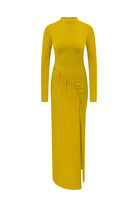 Yüksek Yakalı Uzun Kollu Asimetrik Drape Detaylı Maxi Elbise