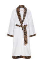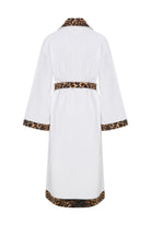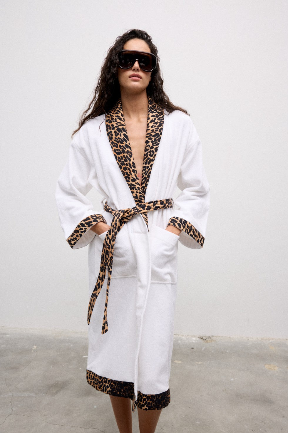 Rea Bornoz, beyaz pamuk kumaşın yumuşak dokusunu dikkat çekici leopar desenli şerit detaylarıyla buluşturarak cesur ama zarif bir kontrast yaratır. Kuşaklı beli ve geniş cepleriyle rahat kesimi, konforu ve şıklığı bir arada sunar. Evde dinlenme anlarına lüks bir dokunuş katan bu bornoz, hem işlevsel hem de zarif bir seçenektir.