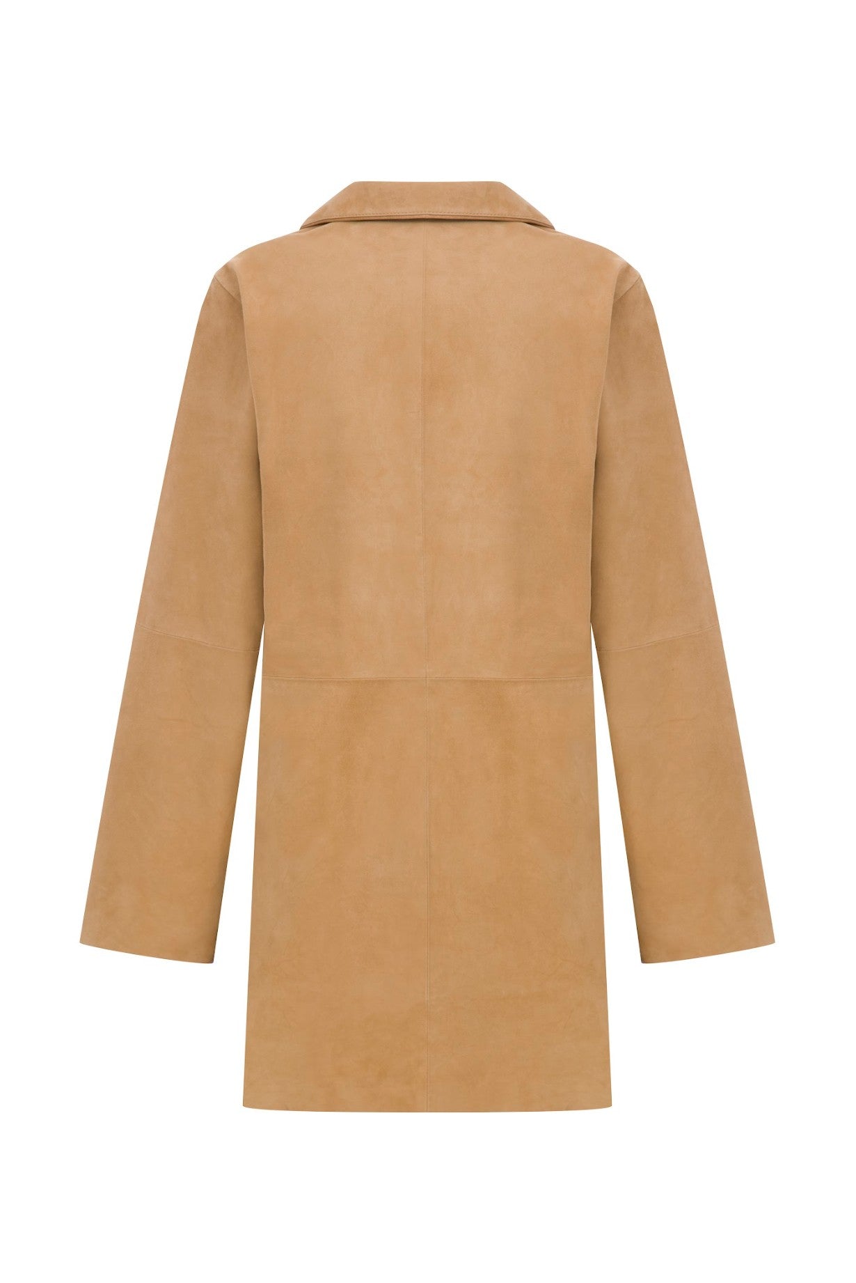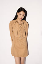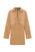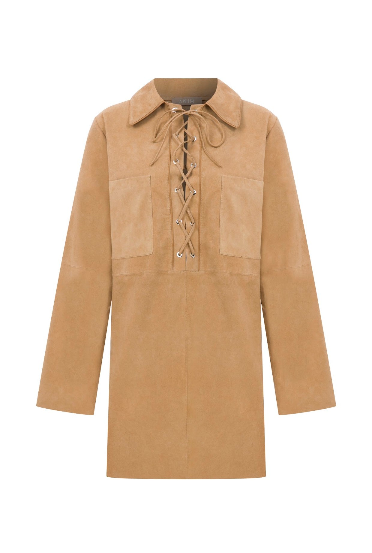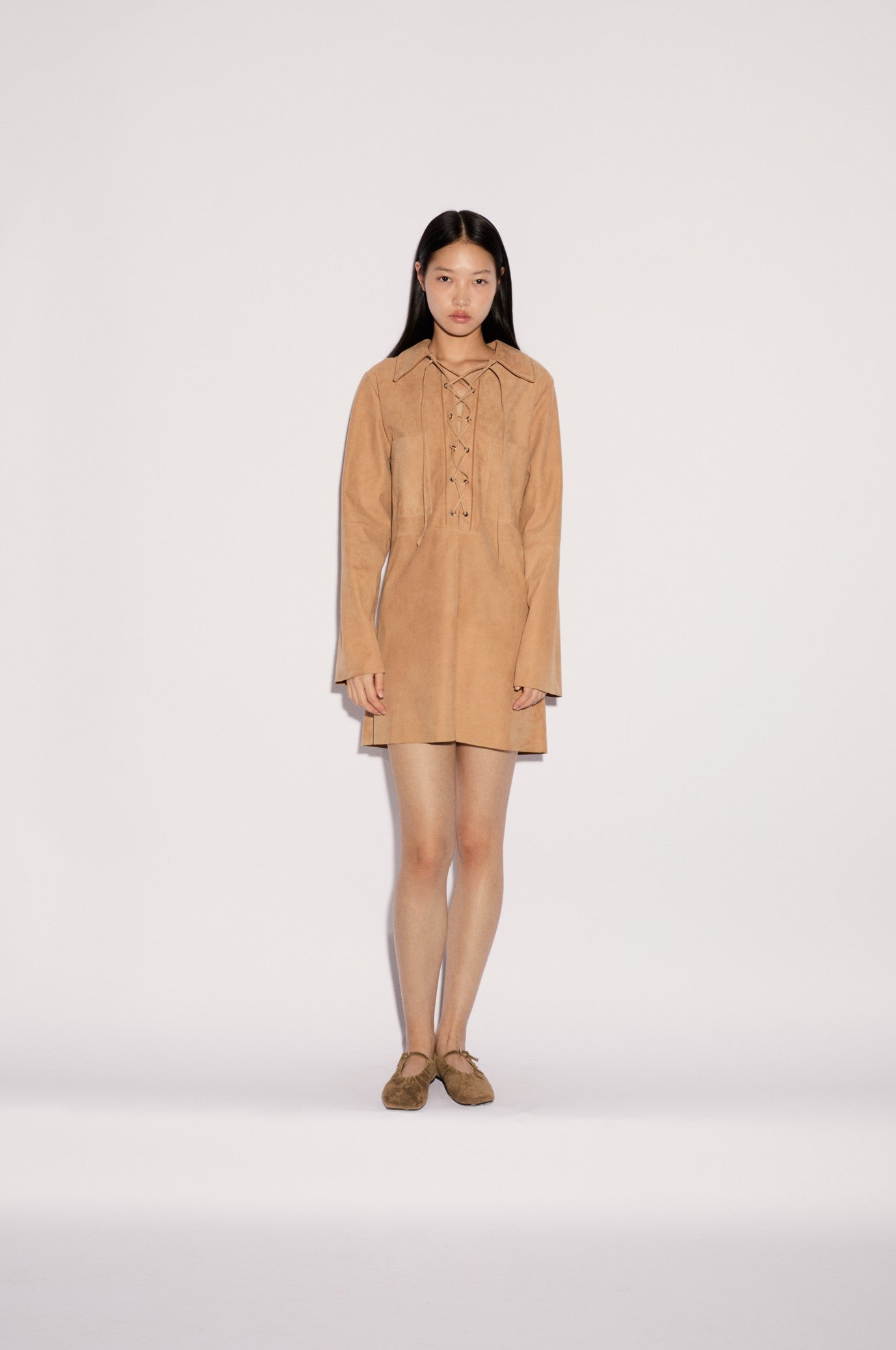 Xira Elbise, açık kahverengi tonunda yumuşak süetten üretilmiştir ve el işçiliğini gösteren zarif bağcık detaylarıyla tamamlanmıştır. Temiz silueti ve zengin dokusu, hem doğal hem de sofistike bir görünüm yaratır.