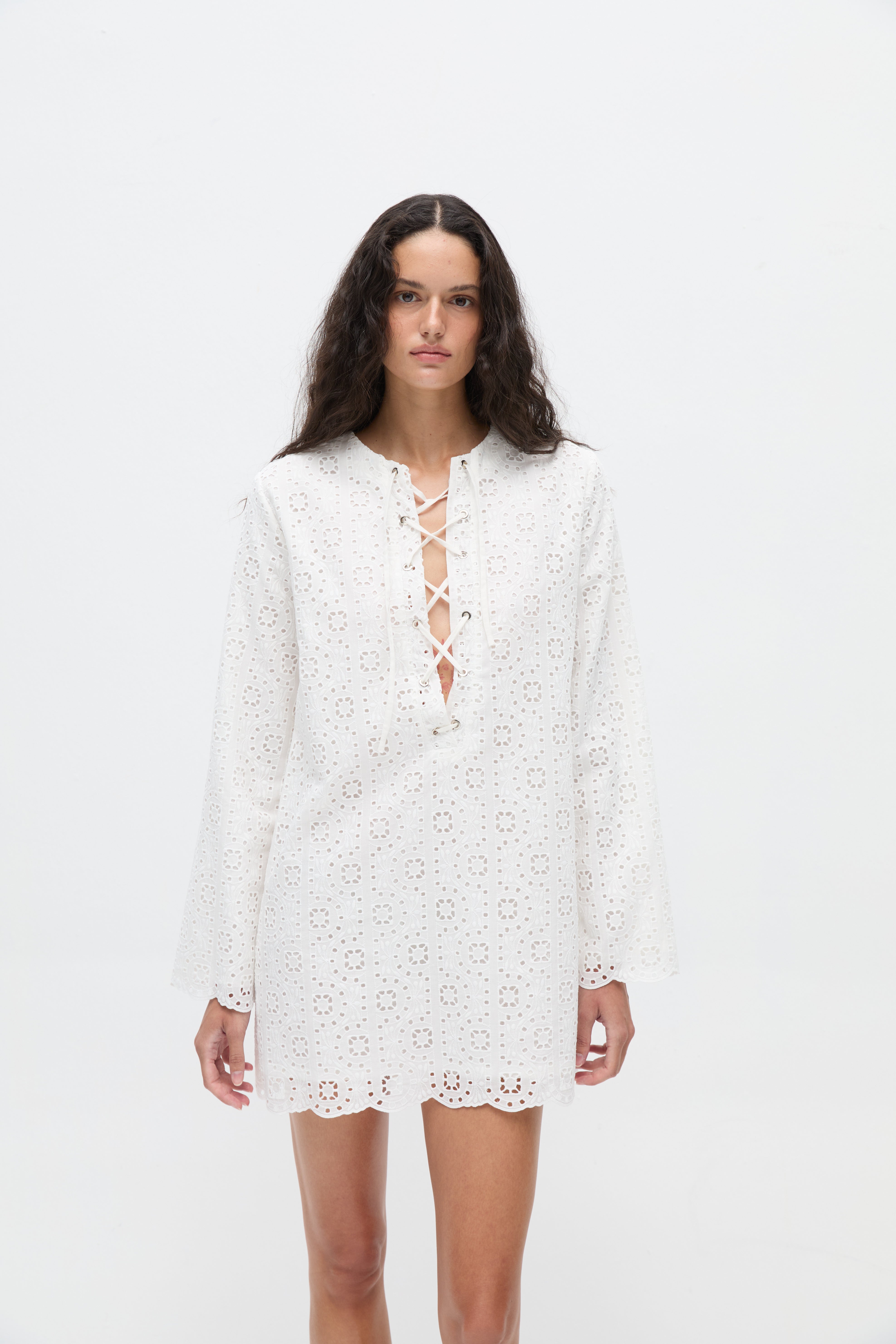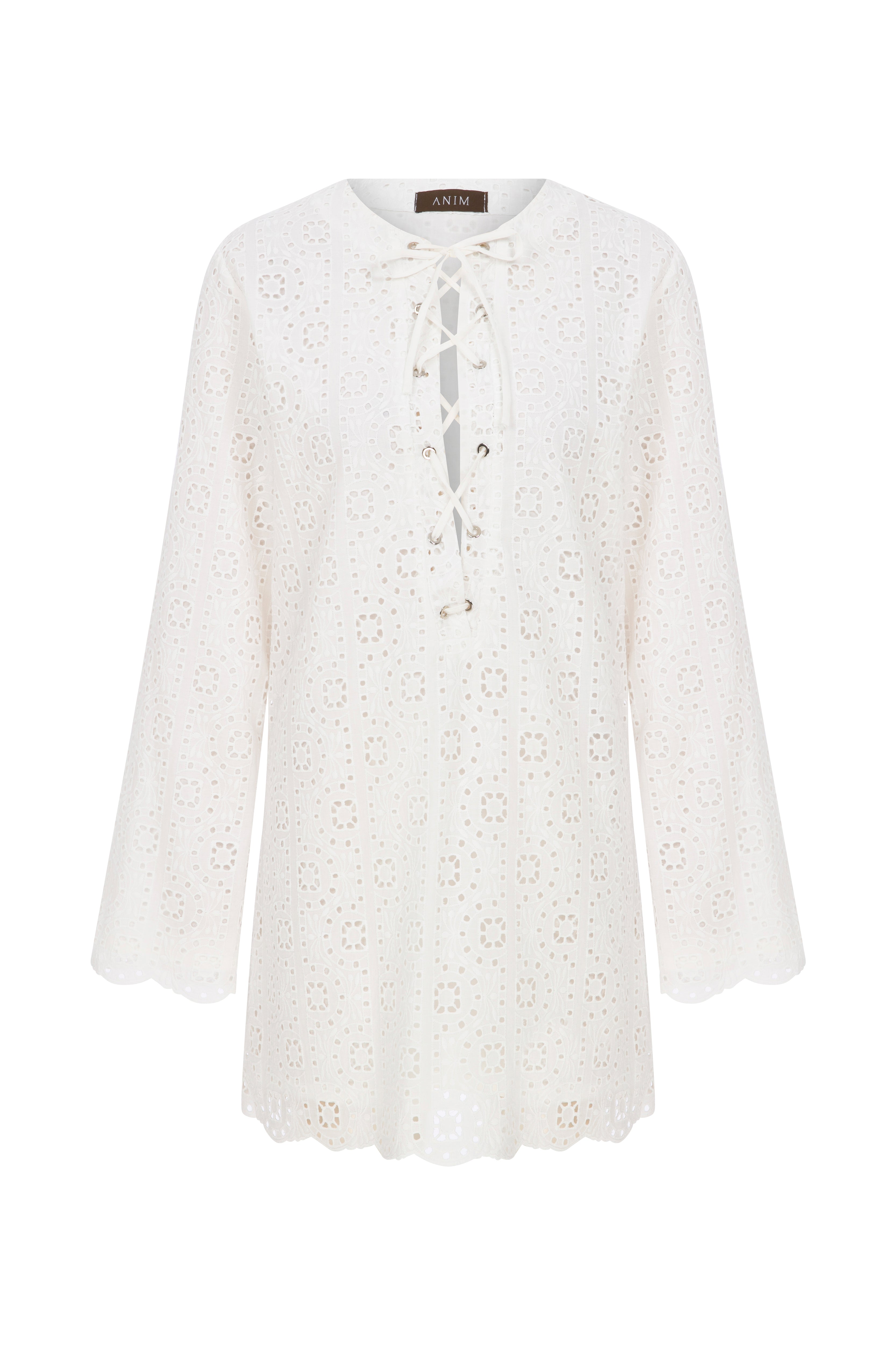 Dantel Bağcık Detaylı Ve Nakışlı Uzun Kollu Beyaz Mini Elbise