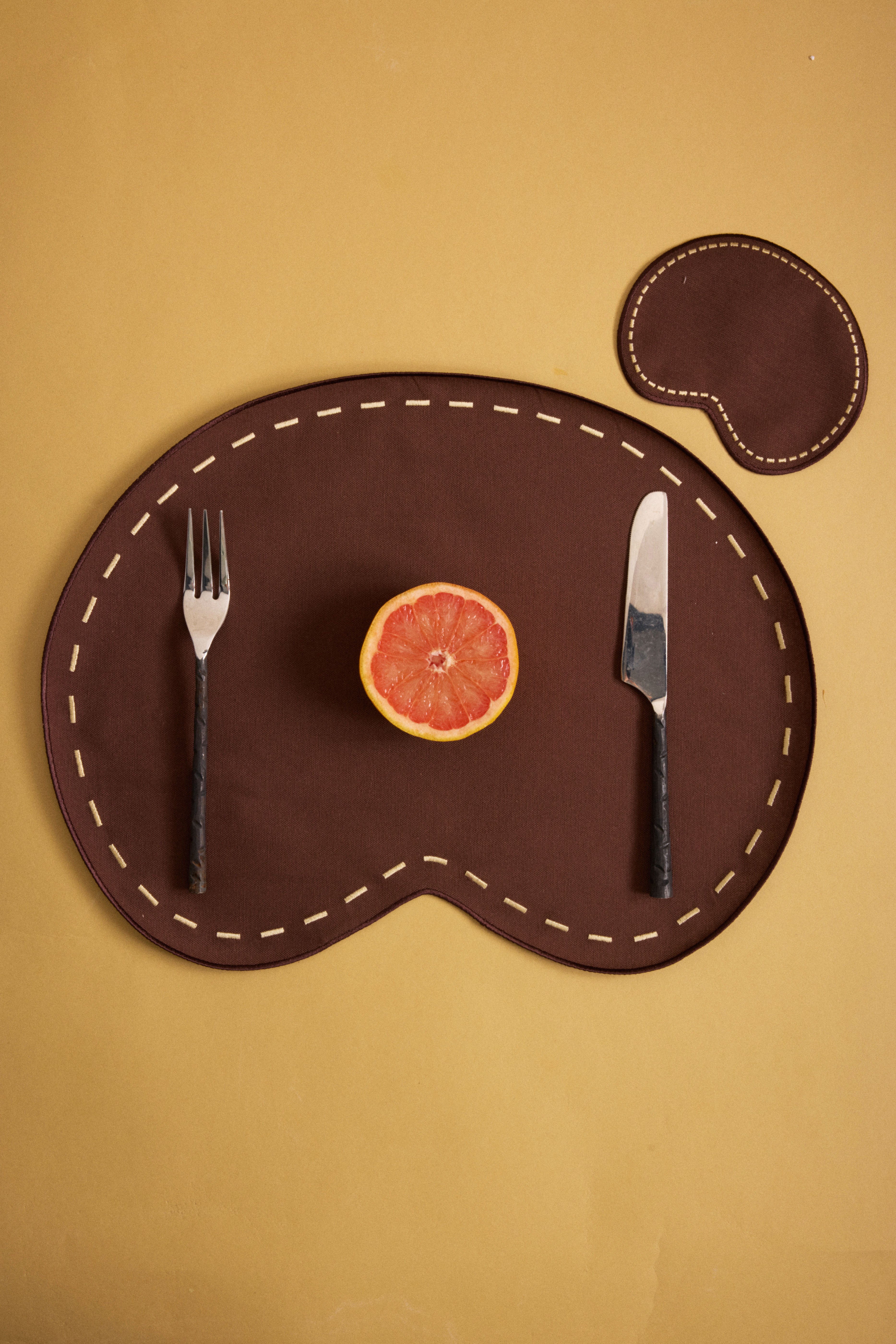 Bean Amerikan Servis, yumuşak hatlara sahip fasulye formuyla sofralara sıcak bir dokunuş getirir. Kahverengi pamuk karışımlı kumaşı ve beyaz dikiş detayları, sade ama dikkat çekici bir kontrast oluşturur. Yalnızca tabakların altına serilen bir parça değil, aynı zamanda sofraya derinlik ve karakter katan bir detaydır.