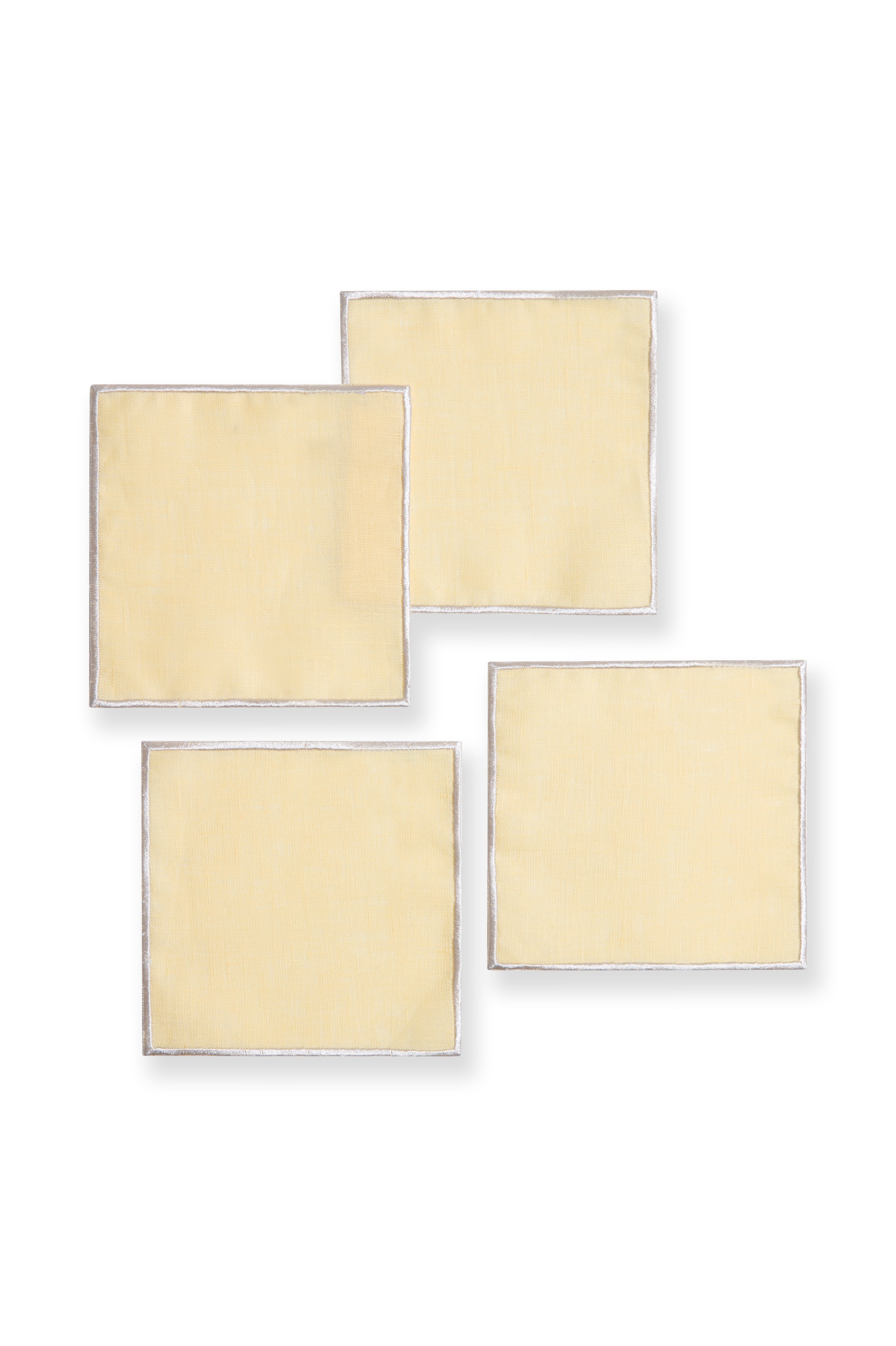 Margot Bardak Altlığı Seti, keten dokusu, kare formu ve gümüş biye detayıyla sade bir şıklık sunar. Toprak sarısı tonuyla sıcak bir zemin oluşturan bu 4’lü set, sofralara zarif bir bütünlük kazandırır.