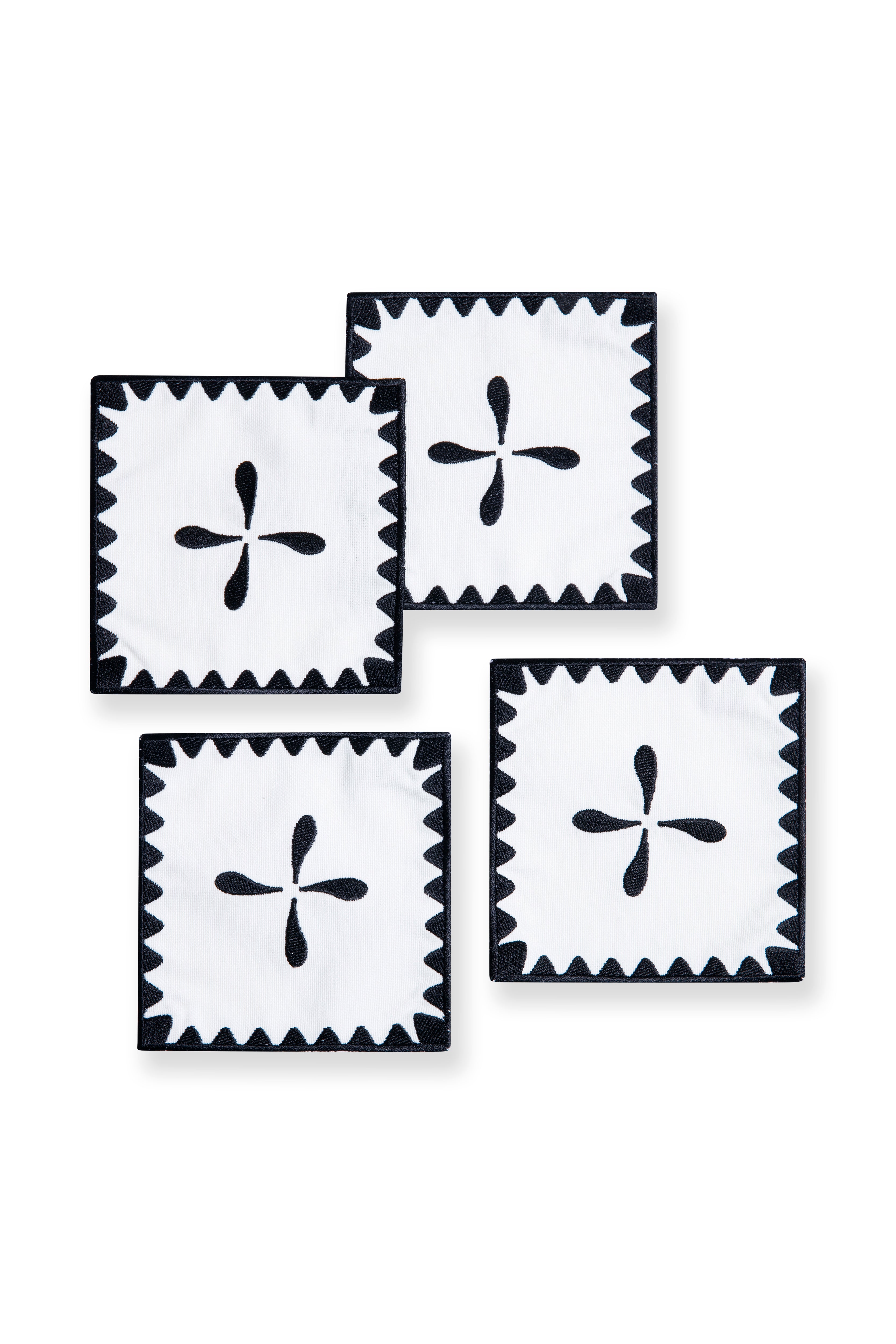 Sora Bardak Altlığı Seti, cesur kare formu, siyah işlemeli yonca desenleri ve keskin kenar detaylarıyla dikkat çeker. Net çizgileriyle masaya güçlü bir görsel denge kazandırır; günlük sofraları daha düzenli ve karakterli bir hale getirir. Dört adet altlıktan oluşan bu set, hem işlevsel hem de estetik bir tamamlayıcıdır.