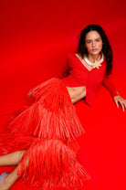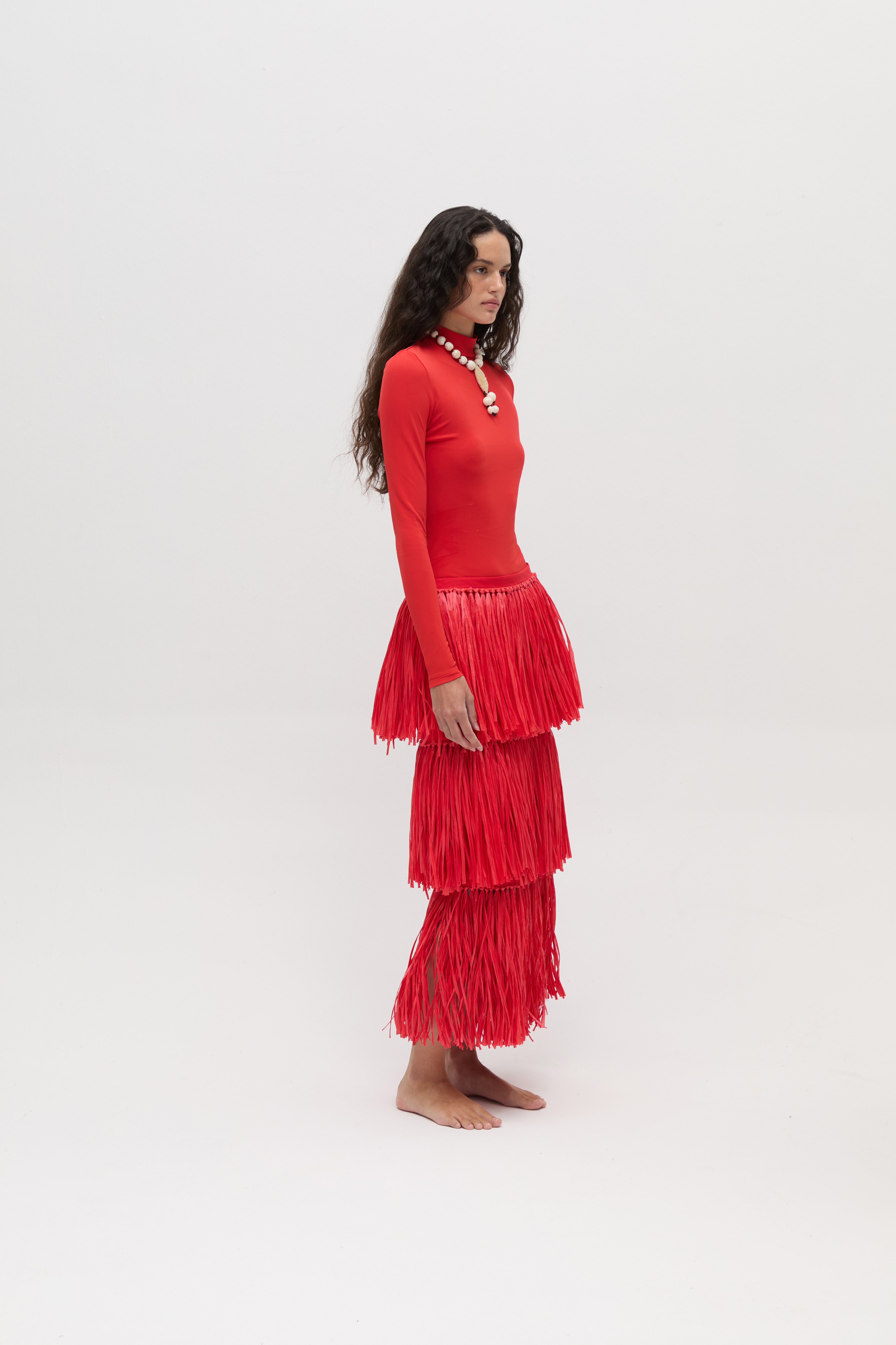 Alora Etek, her adımda zarif bir şekilde hareket eden kat kat rafya püsküllerle tasarlanmıştır. Kalça hizasında oturan yüksek belli formu, aşağı doğru genişleyerek hacimli bir maxi siluet oluşturur ve bedeni zarifçe uzatır. Sabit beli, püsküllerin dikkat çekici dokusuna denge katarak modern ve güçlü bir duruş sunar. Minimal üstlerle ya da takım parçalarla kombinlendiğinde iddialı bir görünüm elde edilir.