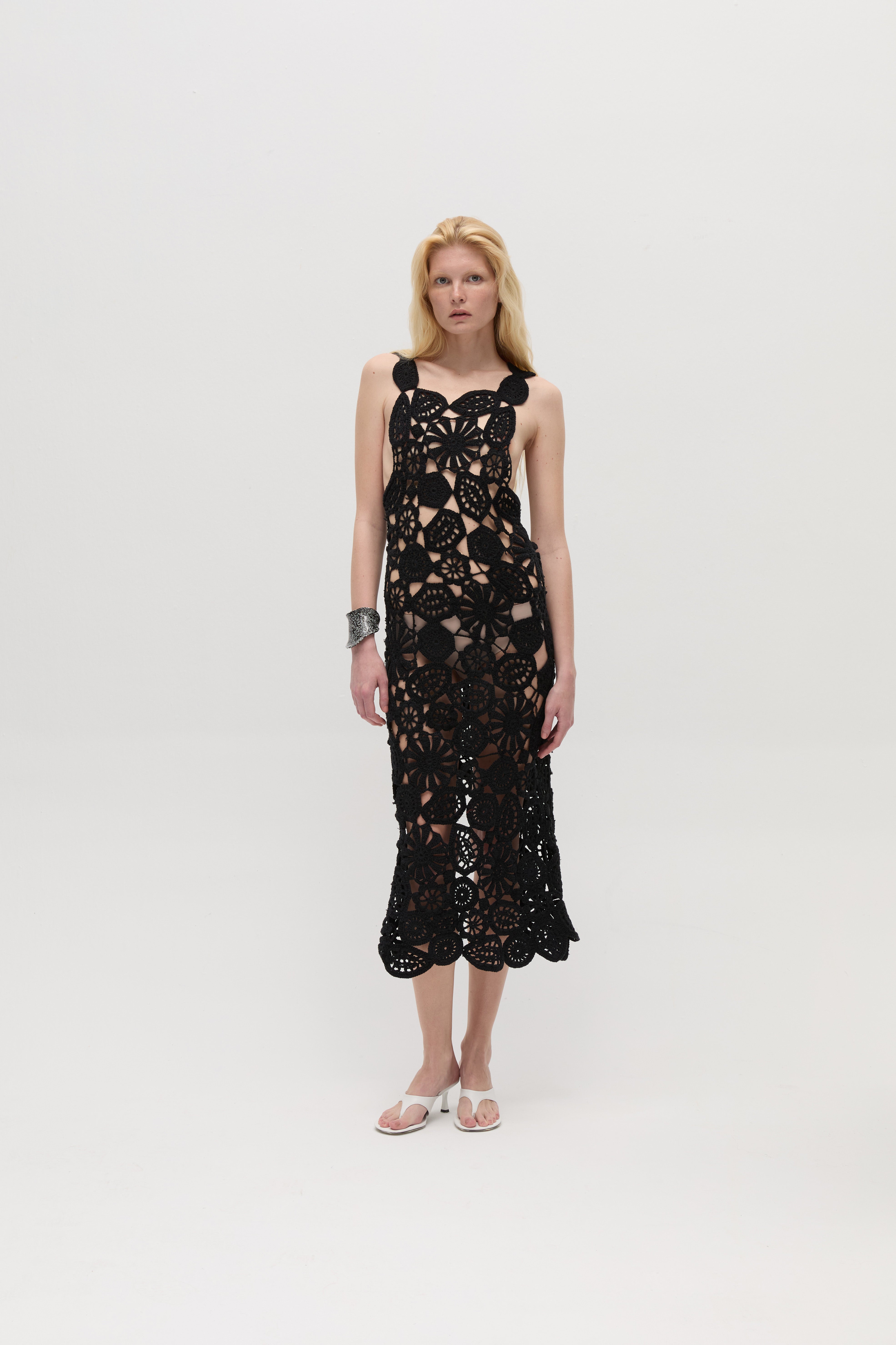 Aria Midi Elbise, el yapımı kroşe pamuk dokusuyla zarif detayları ve zamansız bir şıklığı bir araya getirir. Yarı transparan, vücuda oturan siluetiyle hem sade hem de sofistike bir görünüm sunar. Günlük buluşmalardan özel davetlere kadar her ortama uyum sağlayan, her mevsime uygun dikkat çekici bir parçadır.