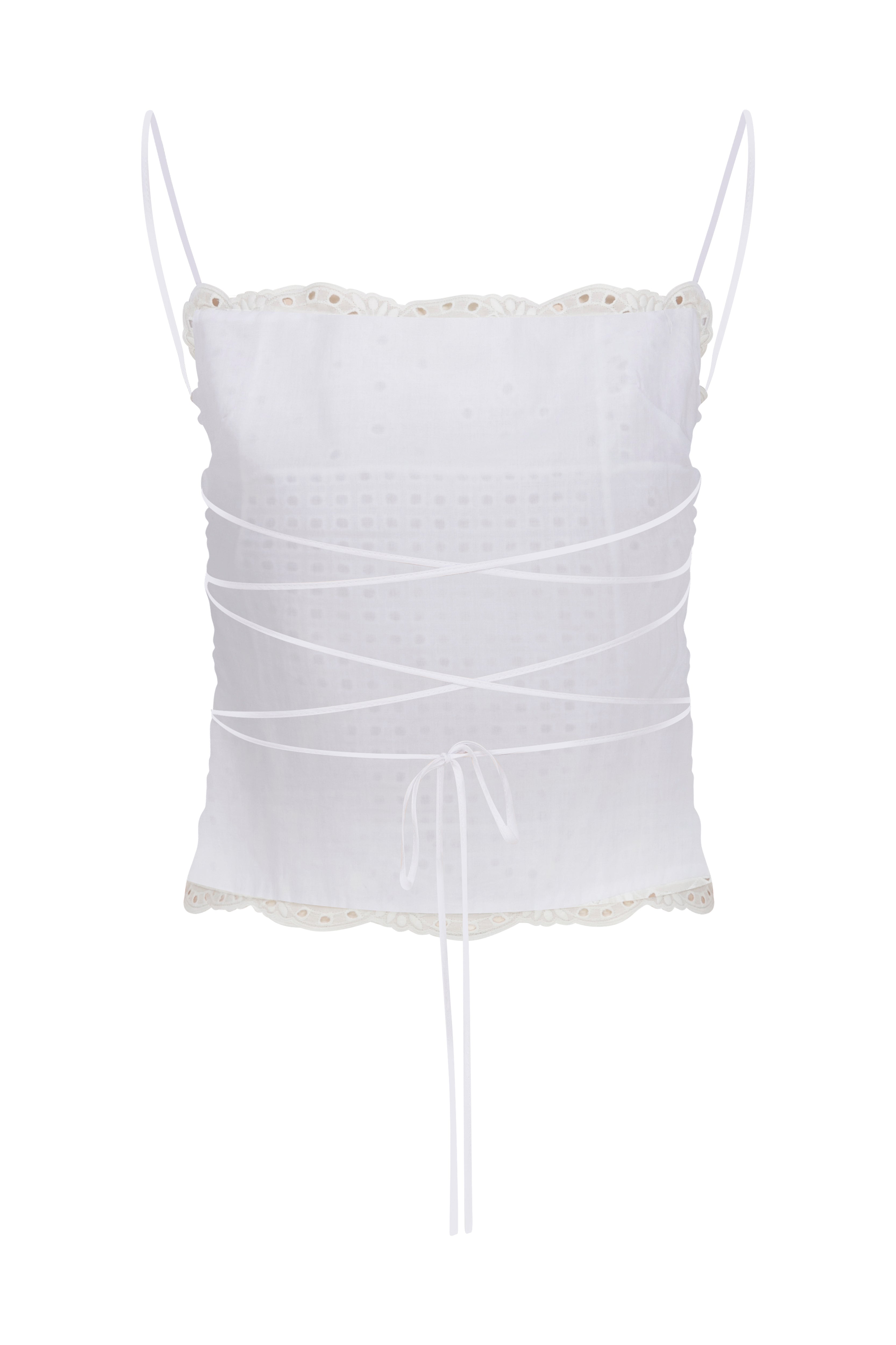 Elise Büstiyer, ingiliz nakışı detaylara sahip pamuklu kumaştan üretilmiştir. Zarif kıvrımlı kenar tasarımı ve ayarlanabilir bağcık detaylı arka kısmıyla feminen bir görünüme sahiptir. Yapılandırılmış ancak zarif formuyla ceketlerin altında veya yüksek bel parçalarla mükemmel bir uyum sağlar.