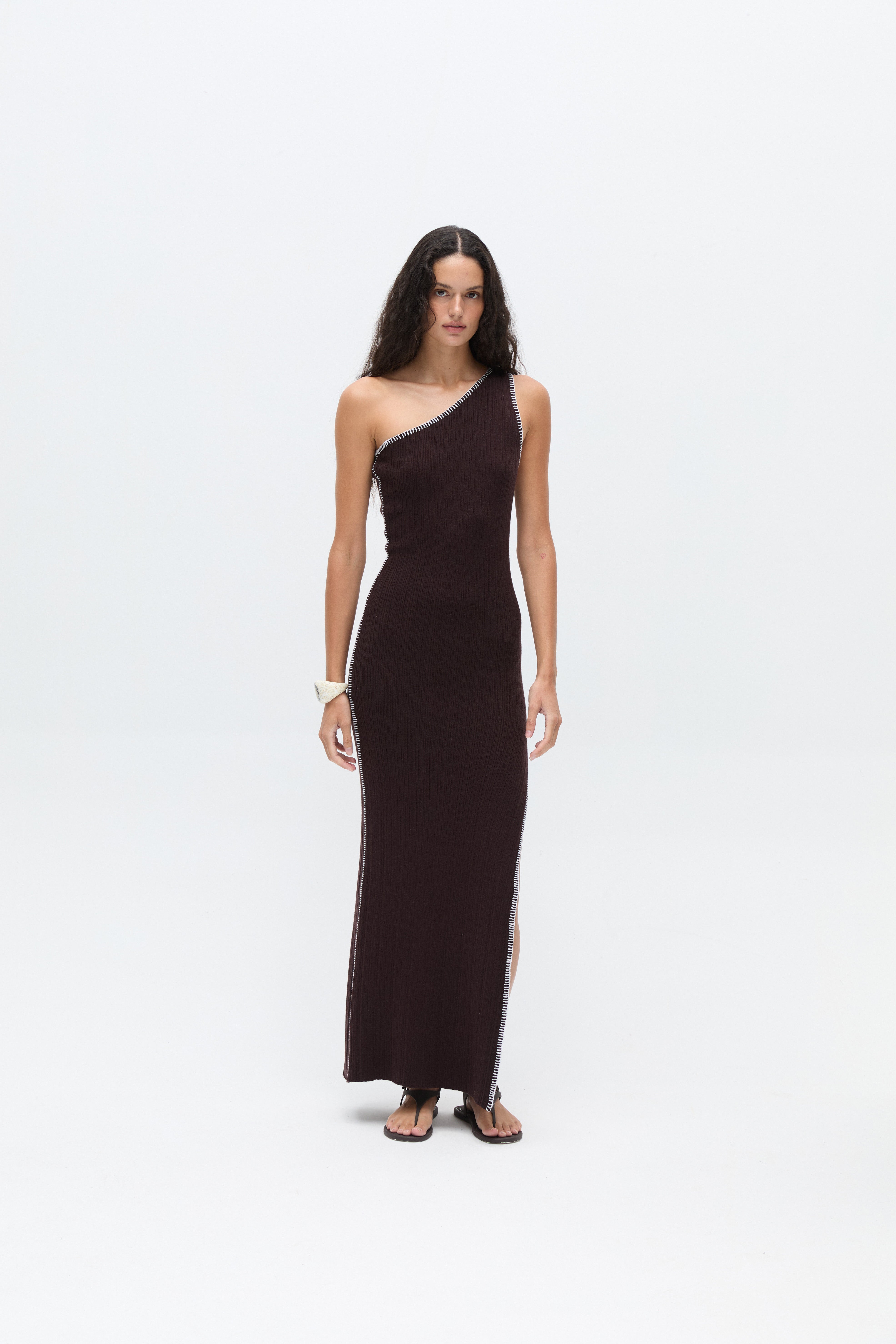 Iris Elbise, yumuşak örme kumaştan üretilmiş, tek omuzlu maxi bir modeldir ve zarif, uzun bir siluet sunar. Yüksek yan yırtmacı elbiseye akıcılık ve hareket katarken, kenarlardaki çoban dikiş detayları hoş bir görünüm kazandırır. Vücudu zarifçe saran bu model, modern sadeliği özenli işçilikle birleştirir.