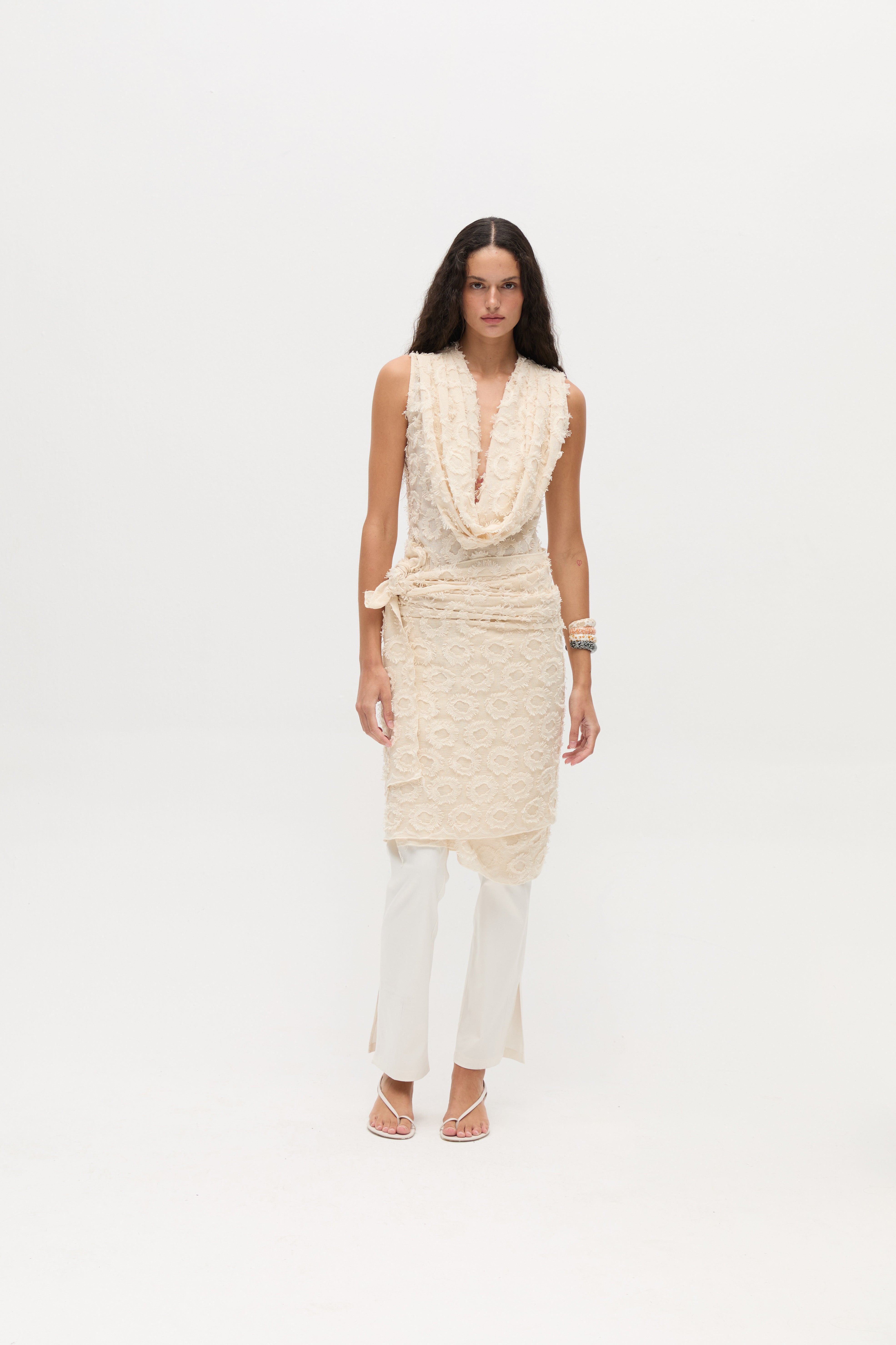 Luma Şal & Üstlük, aplike nakışlı kumaştan üretilmiş çok yönlü bir parçadır; hem şal olarak kullanılabilir hem de pareo tarzı etek şeklinde bağlanabilir. Hafif yapısı ve tenle uyumlu yumuşak dokusuyla doğal bir şekilde dökülür ve hem sade hem de şık görünümleri tamamlar. Uyarlanabilir tasarımı sayesinde elbiselerin üzerine, mayo ile birlikte veya günlük kombinlere dokulu bir bitiş eklemek için idealdir.