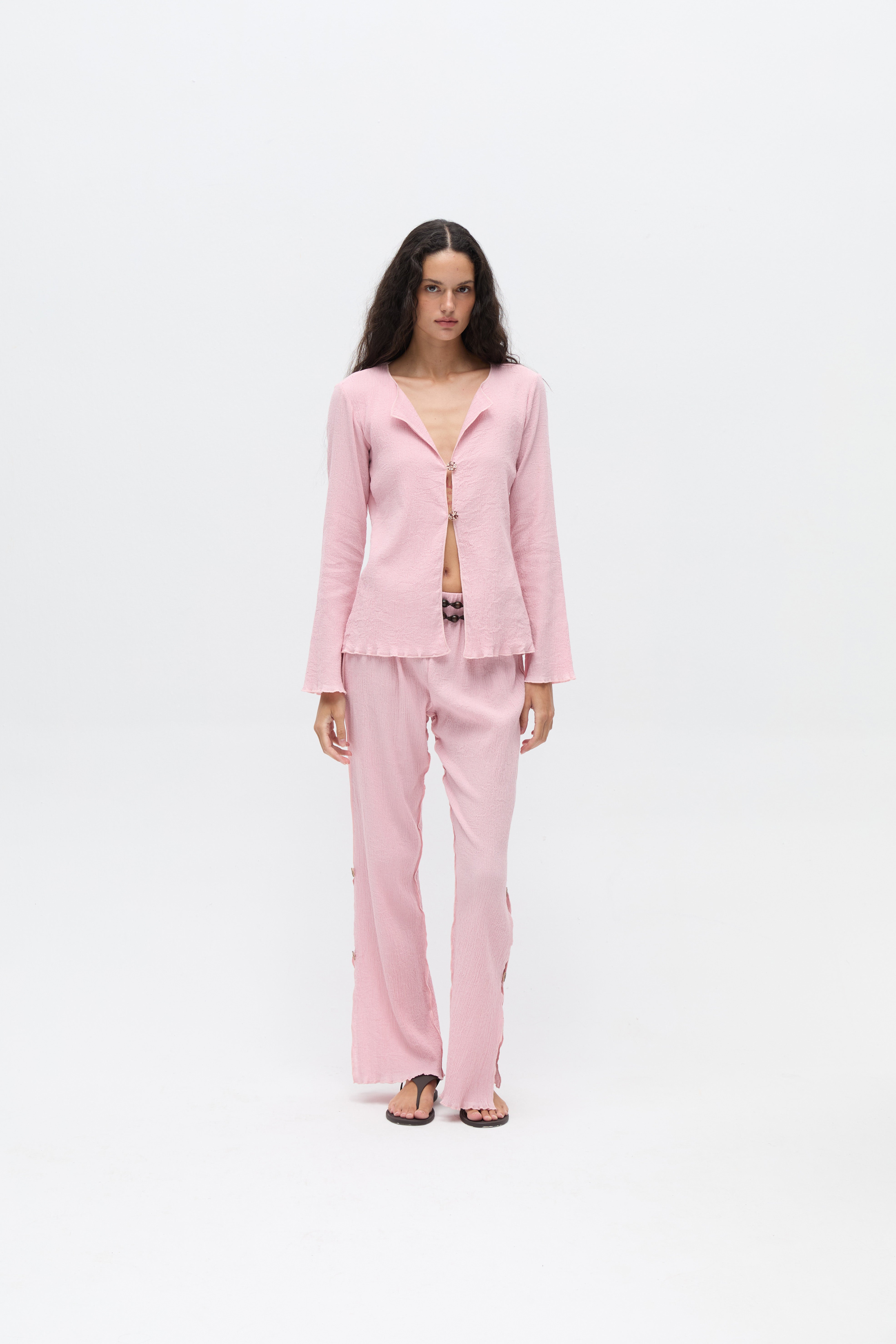 Malaika Pantolon, kırışık dokulu pembe pamuk kumaştan üretilmiştir. Orta bel kesimi ve düz paça formuyla rahat bir siluet sunar. Dış dikiş boyunca uzanan kontrast biye detayı, sade yapısına düzenli ve net bir görünüm kazandırır. Hafif kumaşı hareketle uyumlu bir şekilde dökülürken, dokusunu koruyarak gün boyu rahat bir kullanım sağlar.