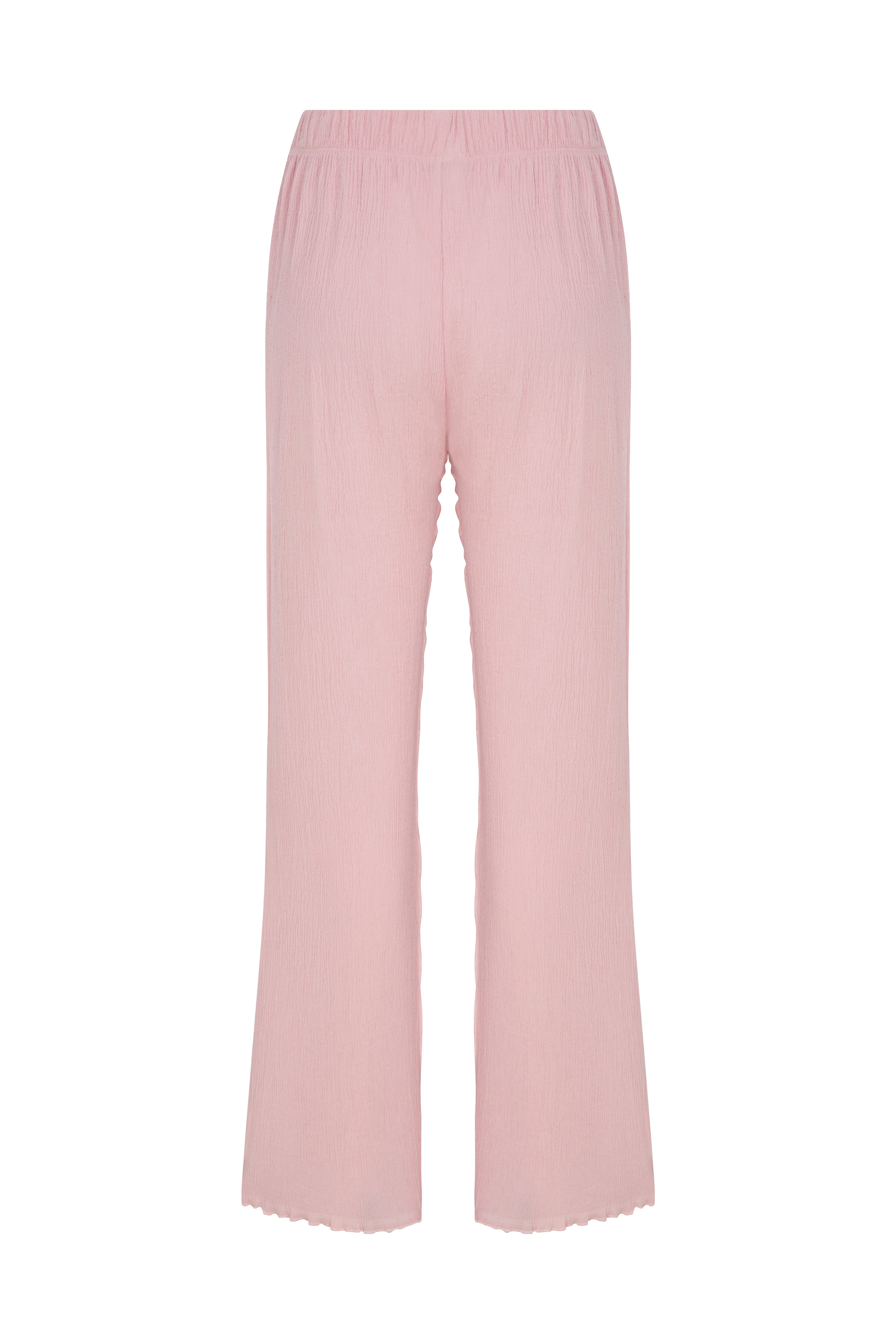 Biye Detaylı Kırışık Dokulu Pembe Pantolon
