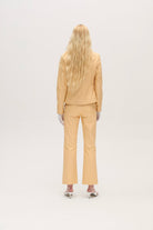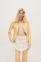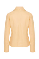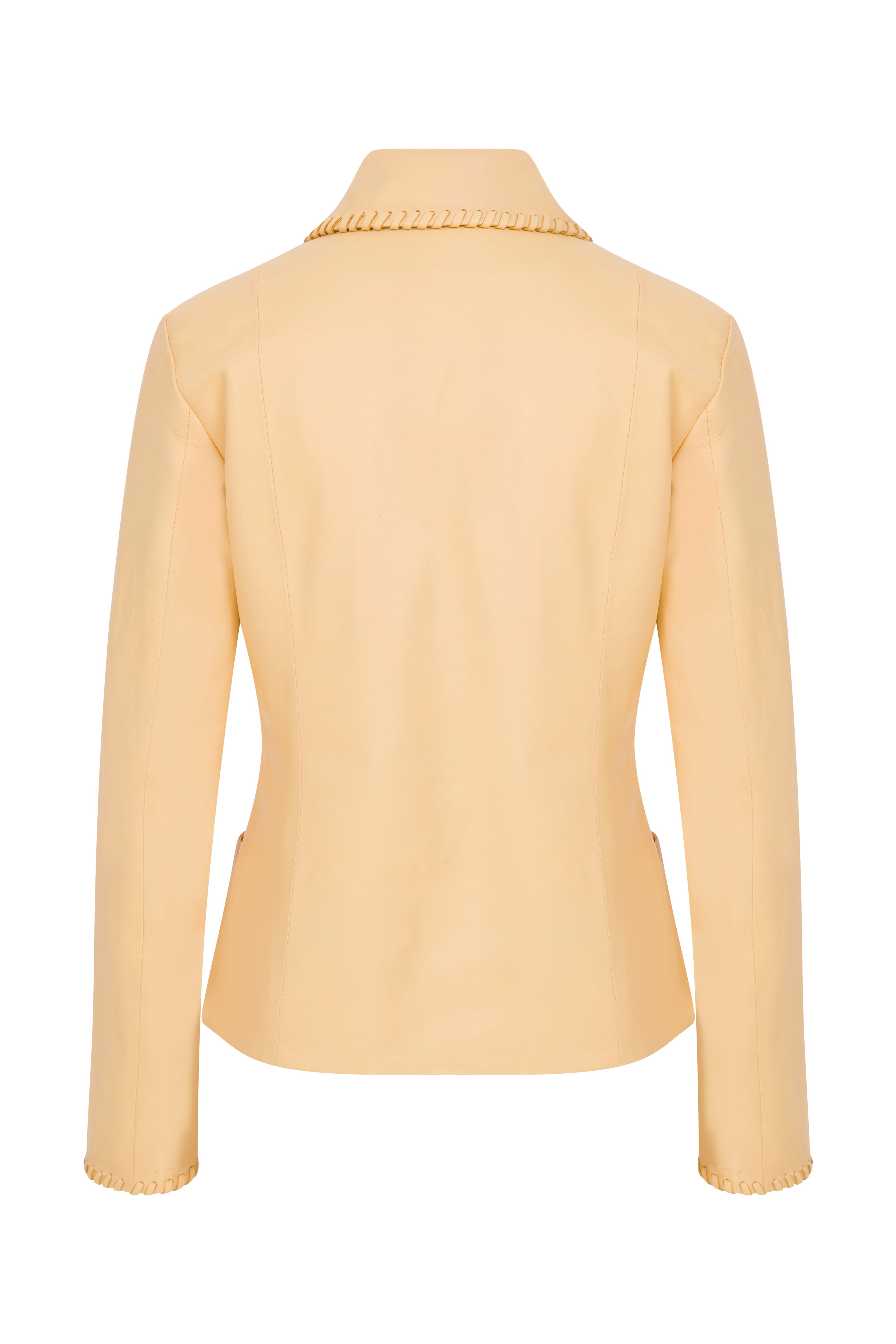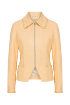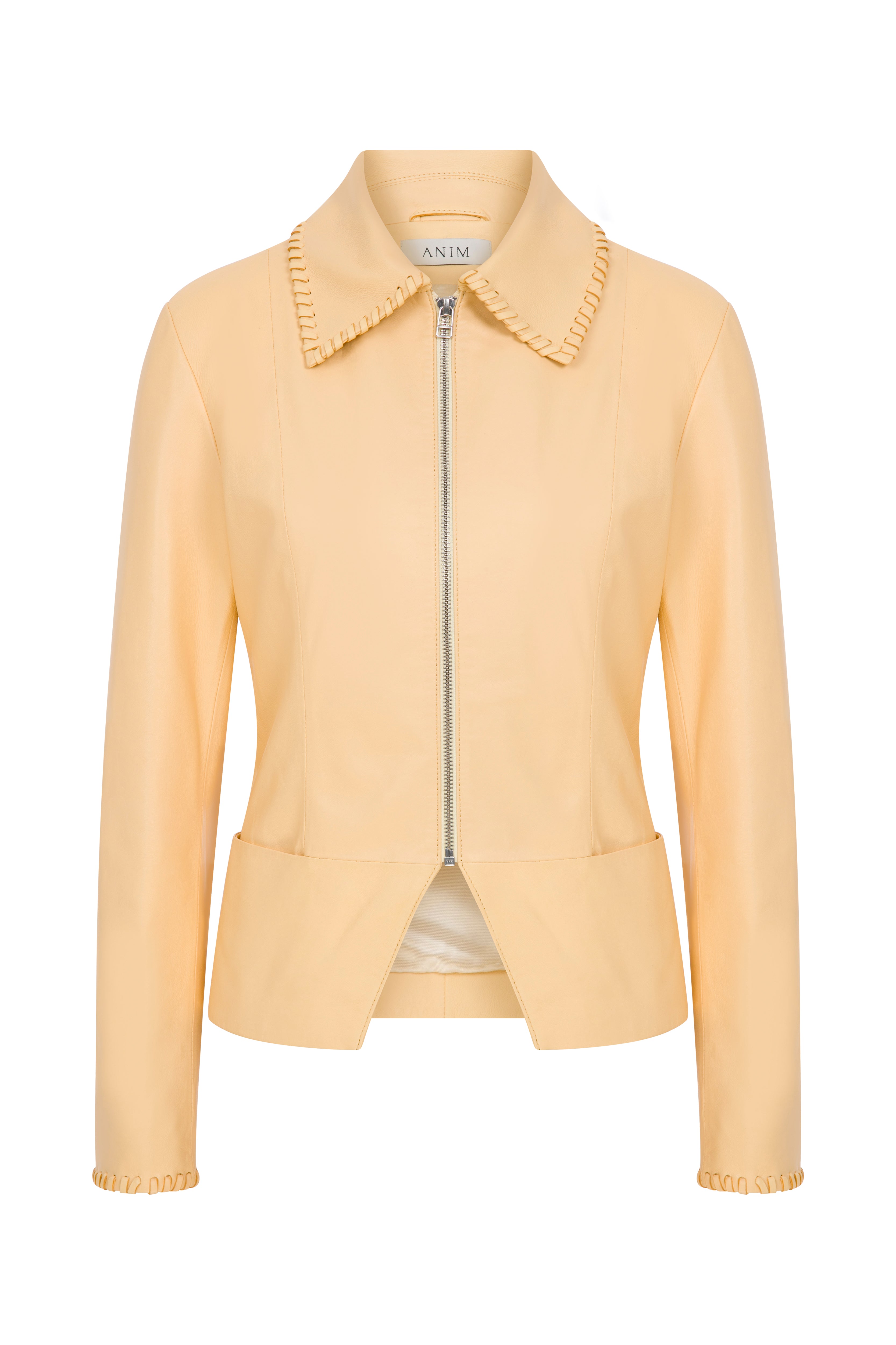 Nina Ceket, yumuşak kuzu derisinden, sarı tonunda üretilmiştir. Klasik yakası ve önden fermuarlı tasarımıyla sade bir görünüme sahiptir. Gövdeye hafif form veren kesimi, bedeni sarmadan dengeli bir duruş sunar. İnce yapılı derisi sayesinde farklı mevsimlerde rahatça kullanılabilir ve çeşitli parçalarla kolayca kombinlenebilir.
