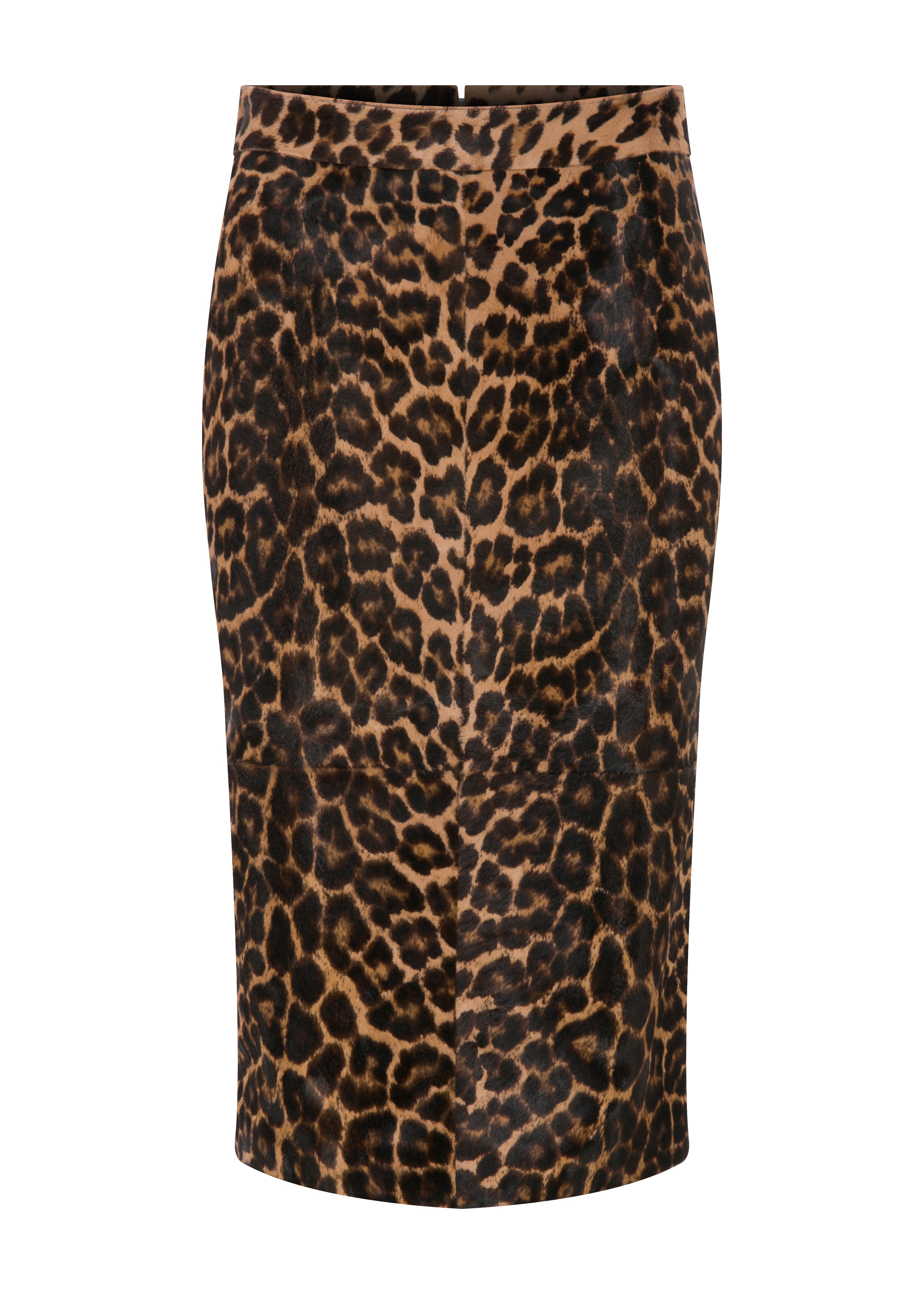 Nyra Midi Etek, dikkat çekici leopar deseniyle öne çıkan dana derisinden üretilmiştir. Belden oturan ve diz altına uzanan dar kesimiyle modern ve güçlü bir siluet sunar. Düz bel hattı ve arkadaki gizli kapama detayıyla sade bir bitişe sahiptir. Gündüz görünümlerine dinamizm, akşam stillerine ise zarif bir duruş kazandıran iddialı bir parçadır.