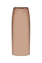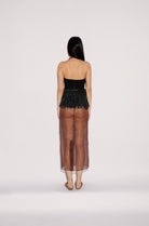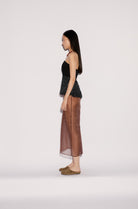Vela Etek, zengin kahverengi tonunda hafif ipek organzeden üretilmiştir. Midi boy tasarımı, bedende hafif bir yapı ile süzülür. Şeffaf katmanları ve temiz silueti, hafiflik ve sade bir zarafet hissi uyandırır.