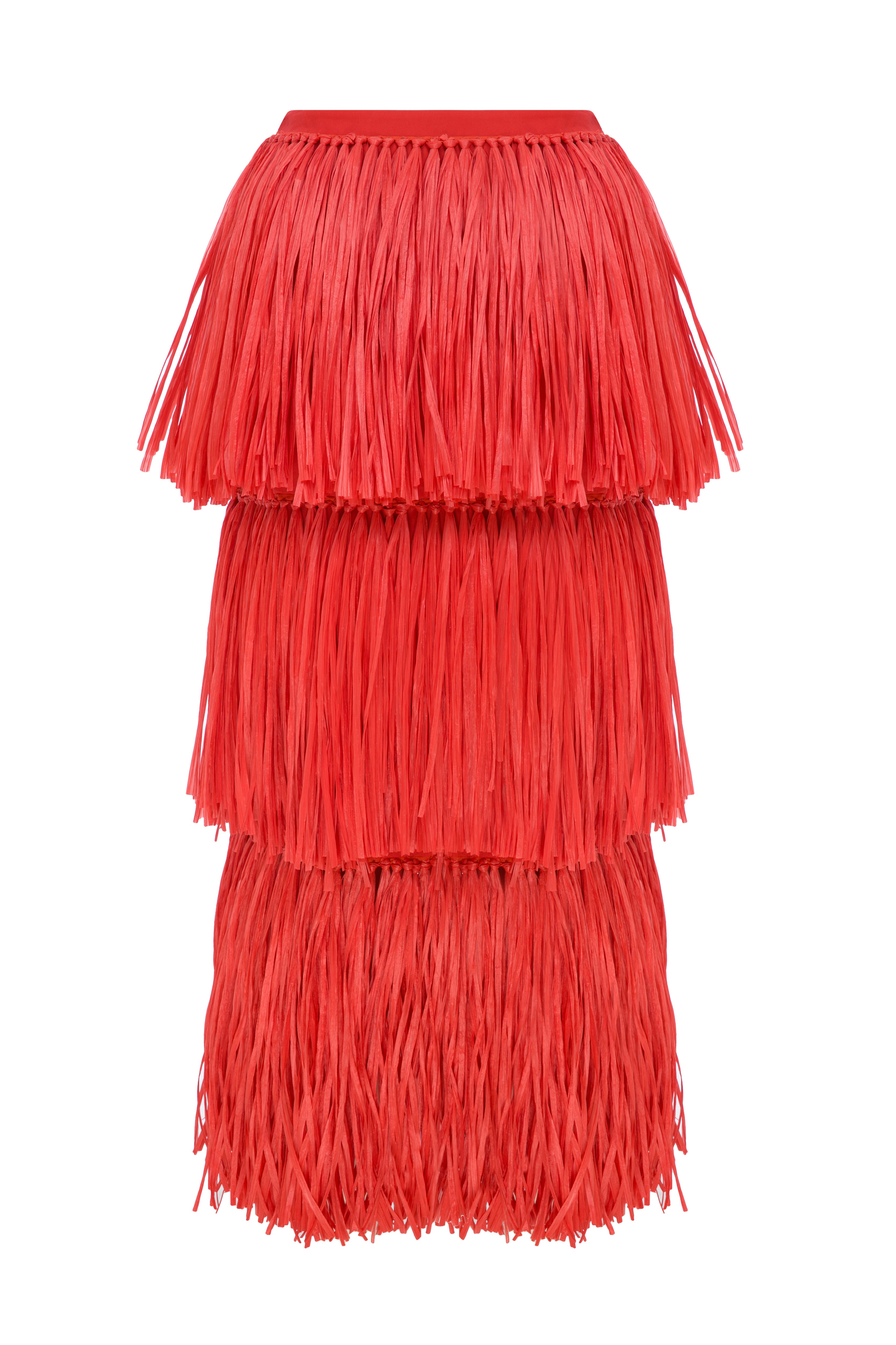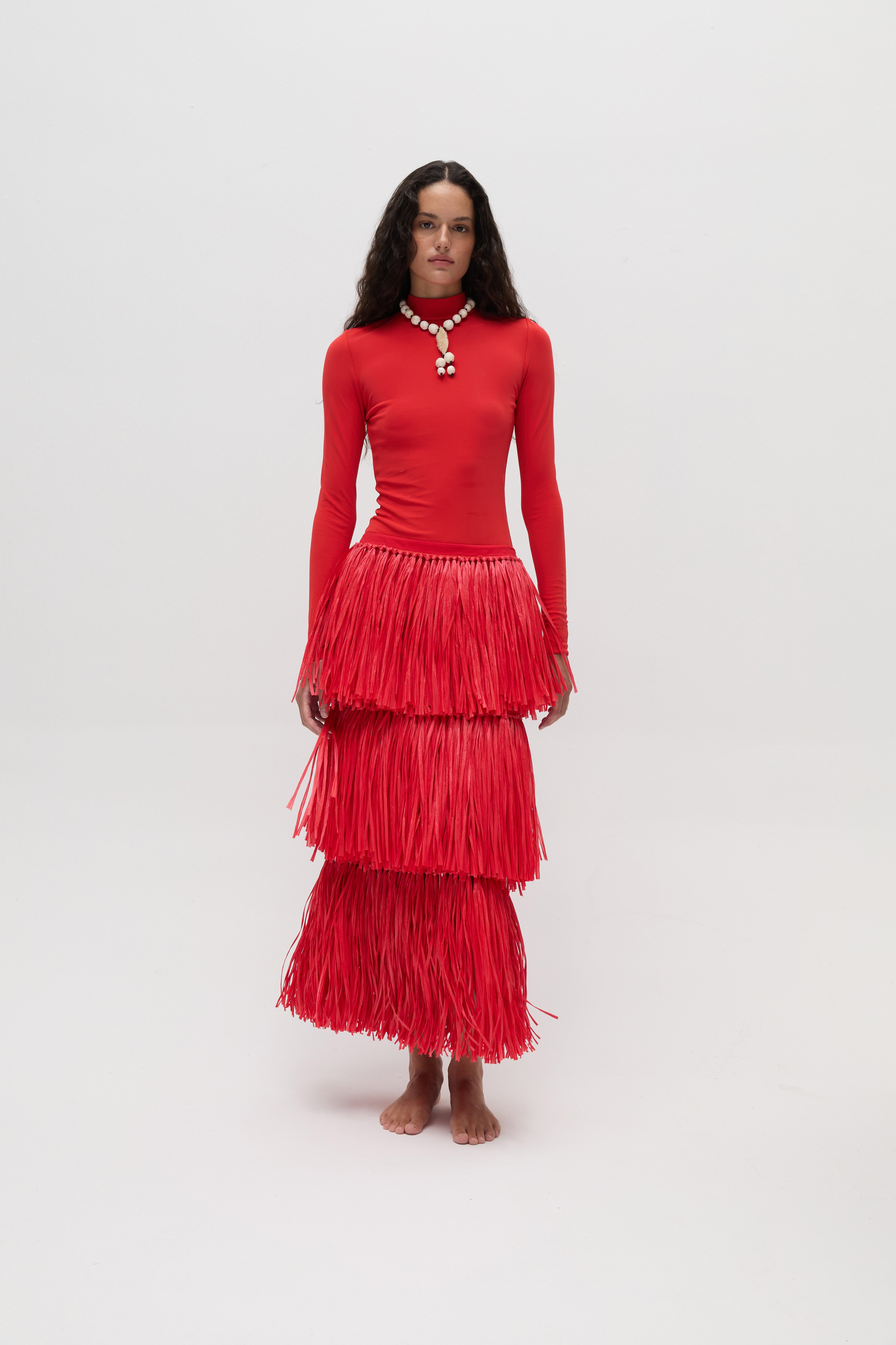 Alora Etek, her adımda zarif bir şekilde hareket eden kat kat rafya püsküllerle tasarlanmıştır. Kalça hizasında oturan yüksek belli formu, aşağı doğru genişleyerek hacimli bir maxi siluet oluşturur ve bedeni zarifçe uzatır. Sabit beli, püsküllerin dikkat çekici dokusuna denge katarak modern ve güçlü bir duruş sunar. Minimal üstlerle ya da takım parçalarla kombinlendiğinde iddialı bir görünüm elde edilir.